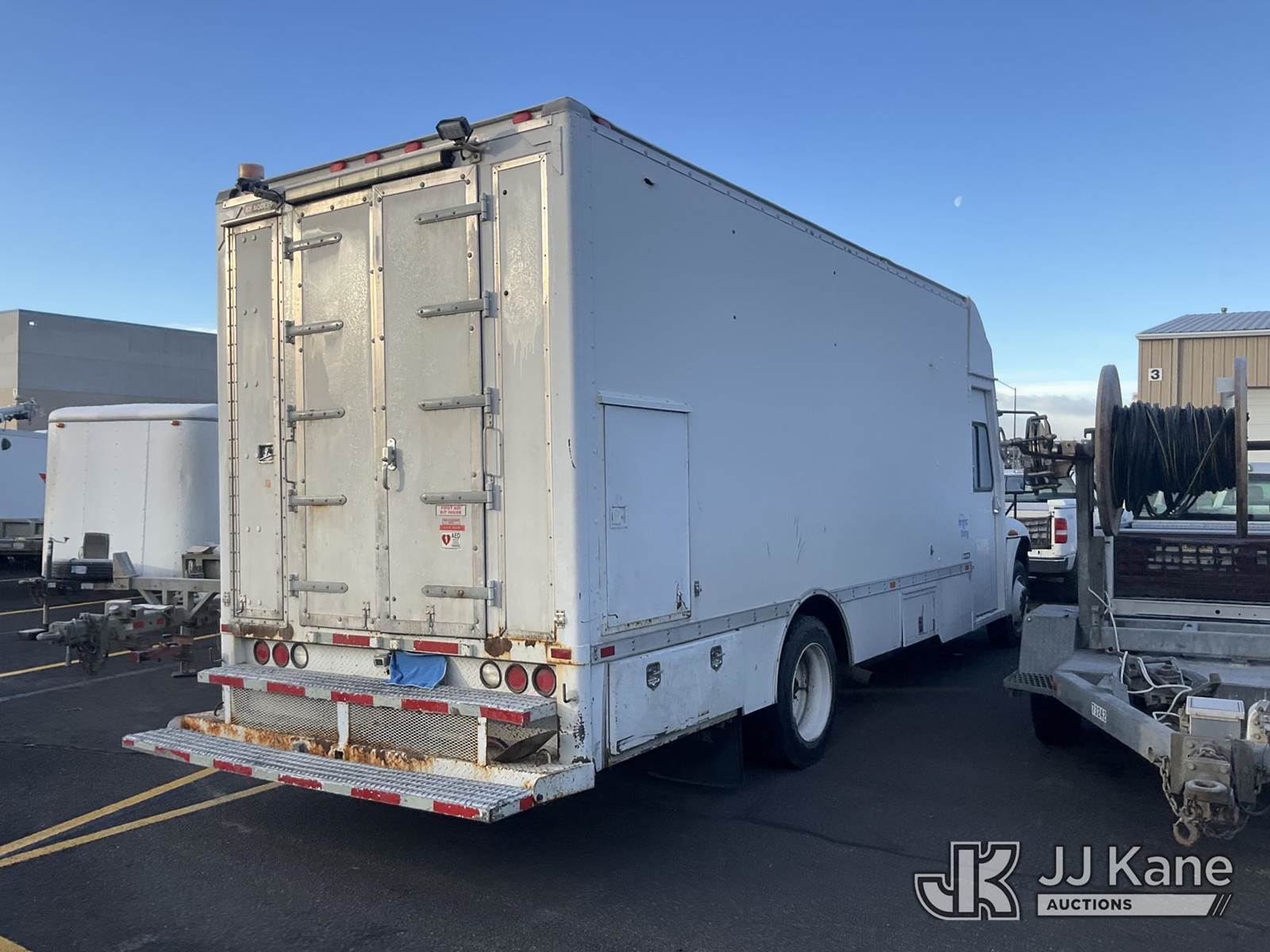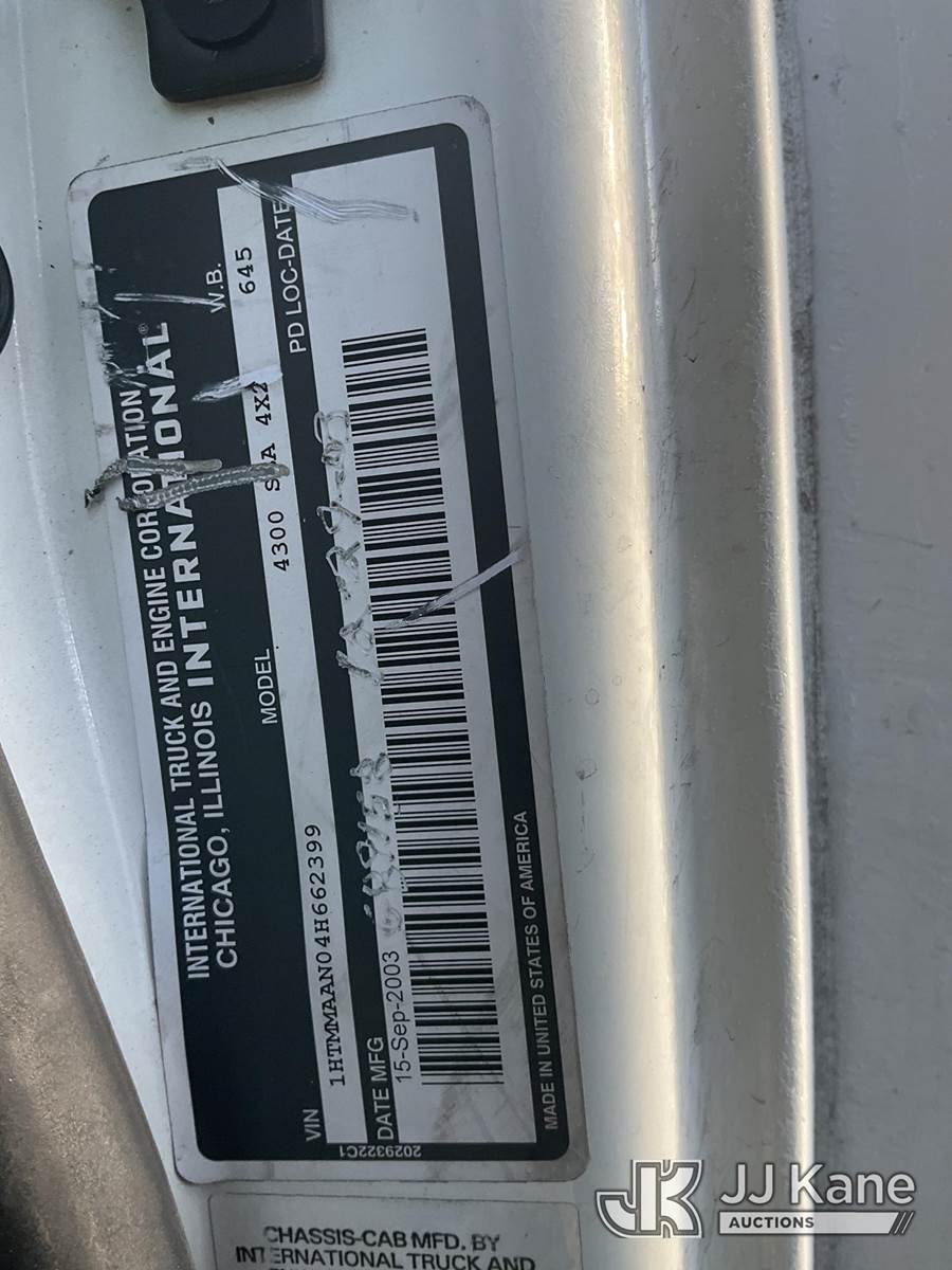 2004 International 4300 Van Body Truck, 7.6L L6 DIESEL Auto, 4X2, A/C, with Generator, work bench, (Exempt from Odometer Disclosure - Reads 114,611 miles) (Not Running, Condition Unknown) (Seller States: Bad Engine) This is a Titled Item NOTE: This unit is being sold AS IS/WHERE IS via Timed Auction and is located in Yakima, WA. For more information & removal arrangements please contact Joseph Hull @ (801) 386-2131 (Buyer is responsible for removal. Assistance by consignor or JJ Kane Auctions is not assured.)