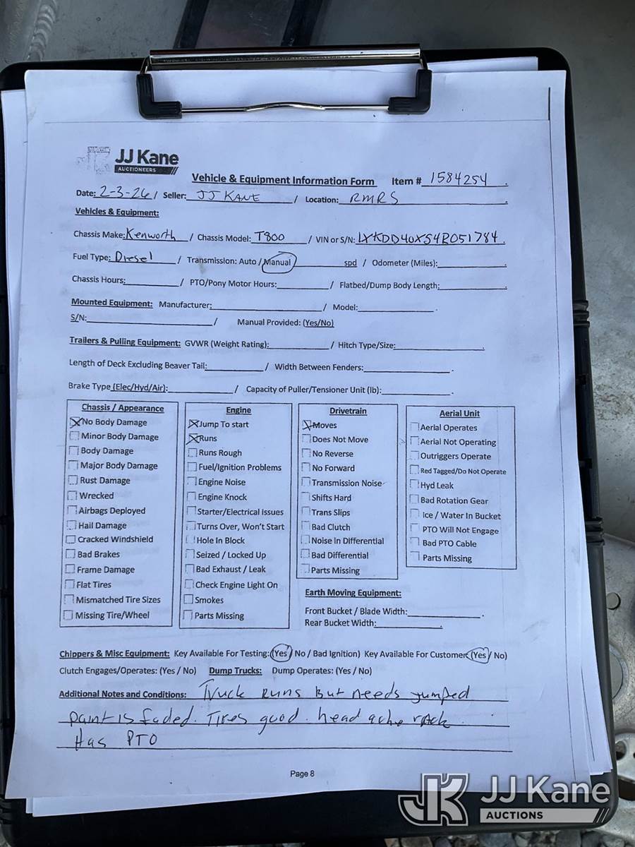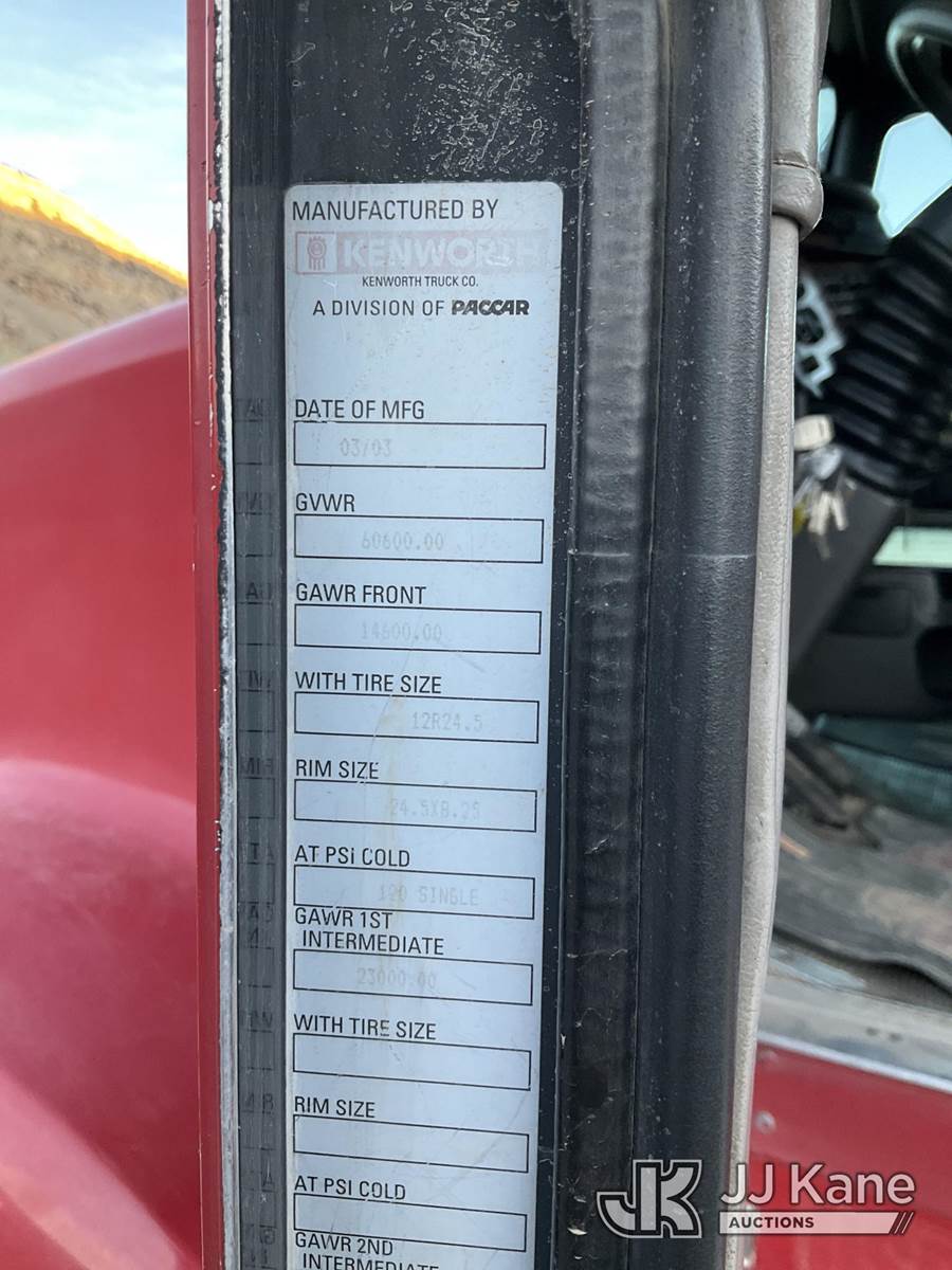 2004 Kenworth T800 T/A Truck Tractor, 14.9L diesel, 6X4, manual, A/C, with air slide 5th wheel, (Exempt from Odometer Disclosure - Reads 97,969 miles) (Runs & Moves) (Jump to Start) This is a Titled Item NOTE: This unit is being sold AS IS/WHERE IS via Timed Auction and is located in Grand Junction, CO. For more information & removal arrangements please contact John Larkin @ 720-390-9897. (Buyer is responsible for removal. Assistance by consignor or JJ Kane Auctions is not assured.)