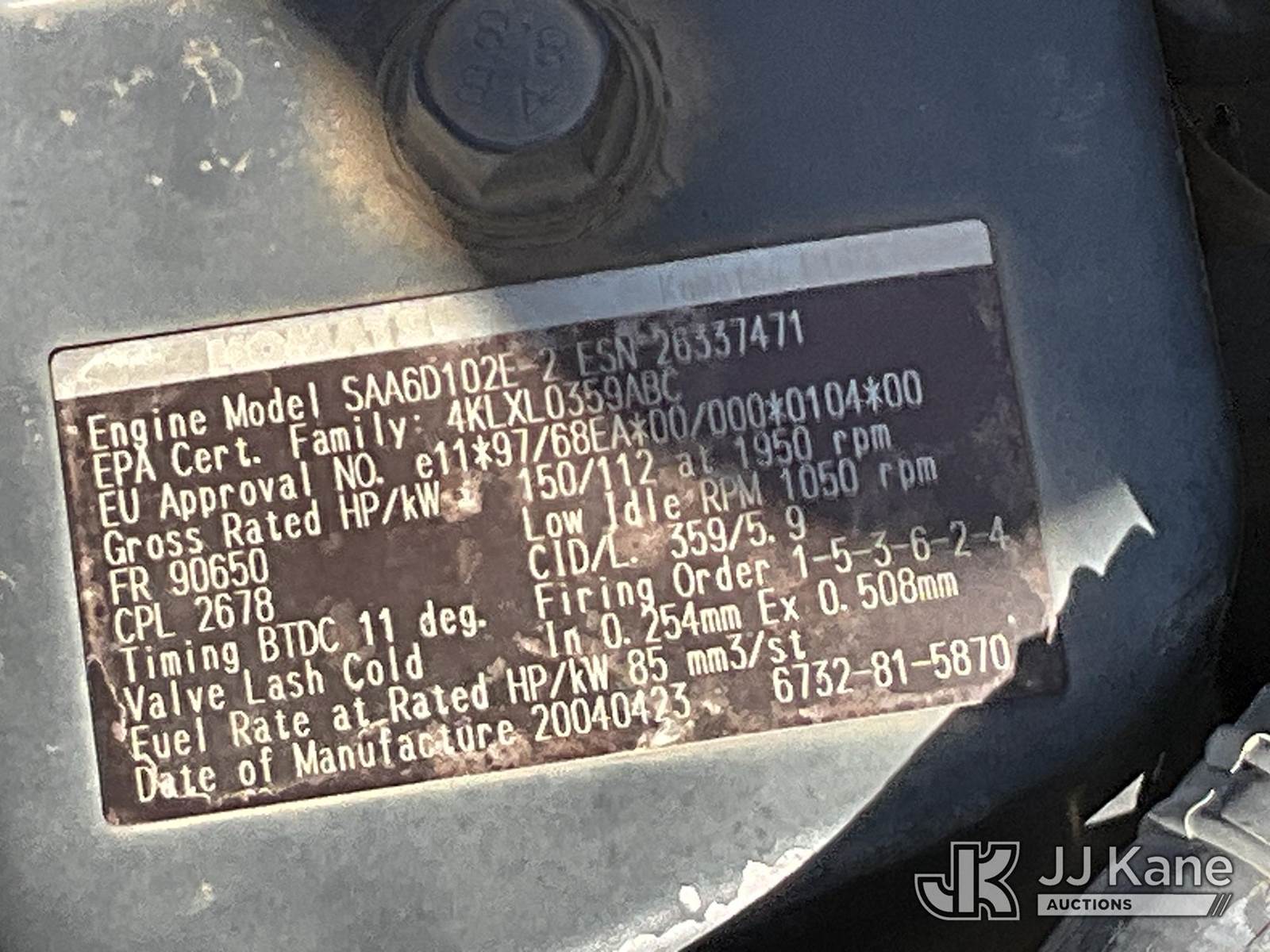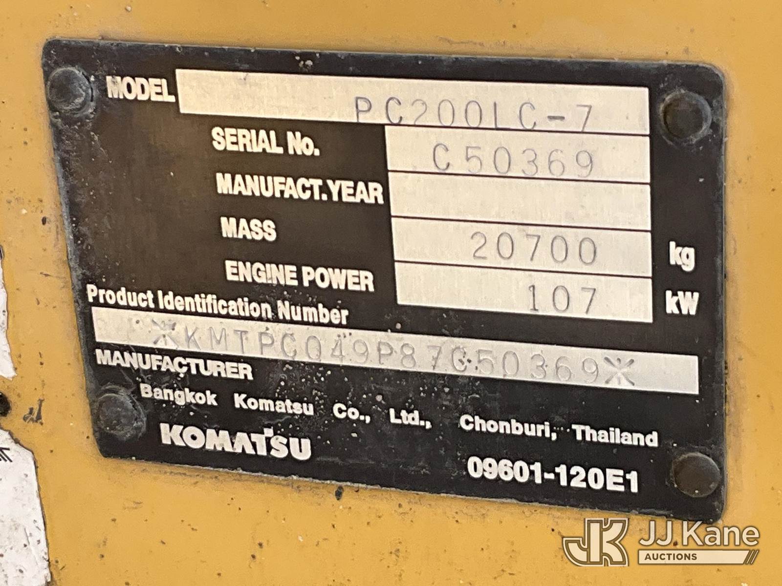 2004 Komatsu PC200LC-7 Hydraulic Excavator, s/n KMTPC049P87C50369, Komatsu diesel, Hydraulic Drive, A/C, with 9 ft 6 in stick, 36 in digging bucket w/ thumb, aux hyd & EROPS, (Runs, Moves & Operates) (Reads 8,515 hours) NOTE: This unit is being sold AS IS/WHERE IS via Timed Auction and is located in Salt Lake City, UT. Inspection & preview days for this unit are the 2 business days prior to the first day of items closing for this auction, item is located at 2353 N Redwood Rd Salt Lake City, UT 84116 and hours of operations are 8a-4p. Titles executed exactly as bidder registered. Ensure your name and/or business name and address in JJ Kane and/or ProxiBid is correct before bidding. For pre-sale questions, please contact Office Staff @ (801) 519-0123. (Buyer is responsible for removal. Assistance by consignor or JJ Kane Auctions is not assured.)