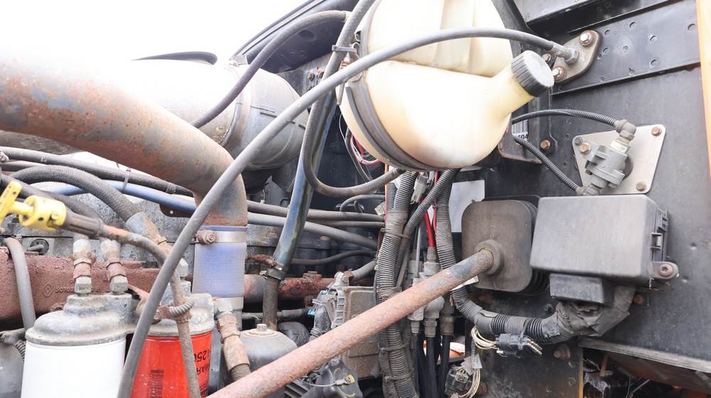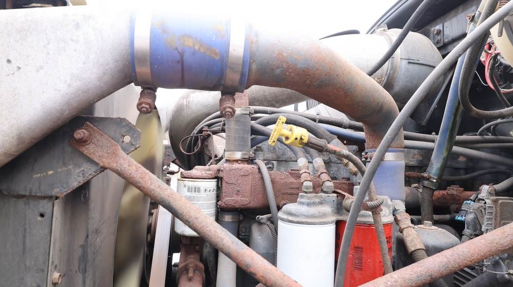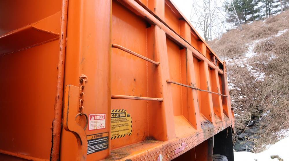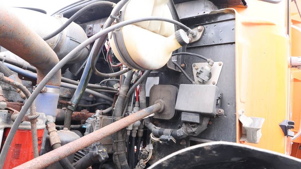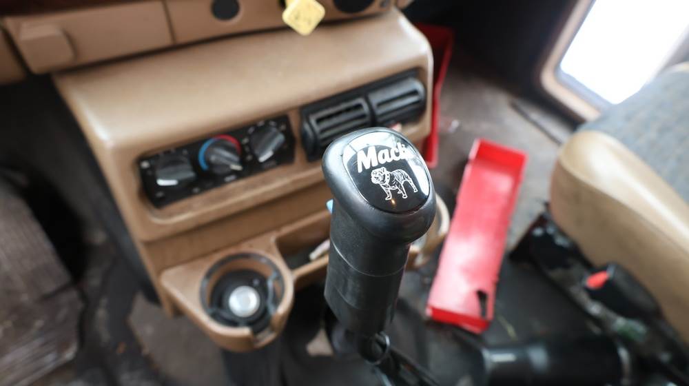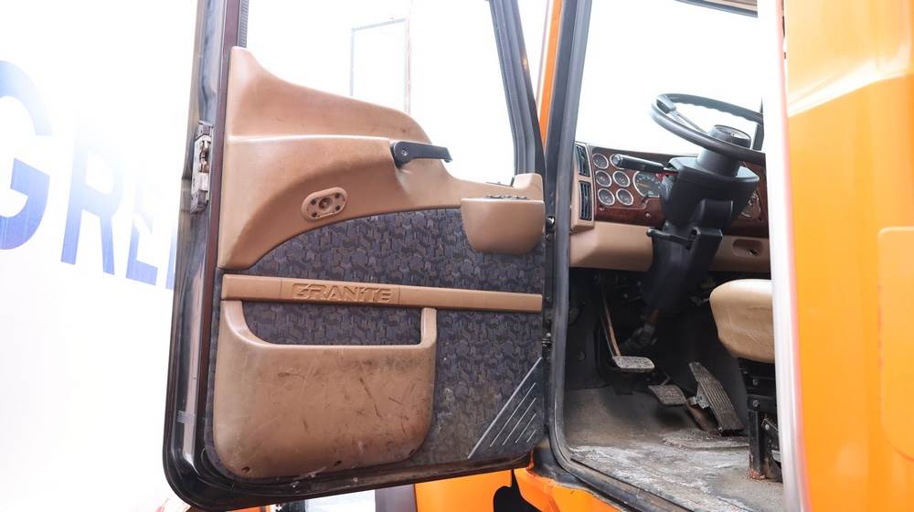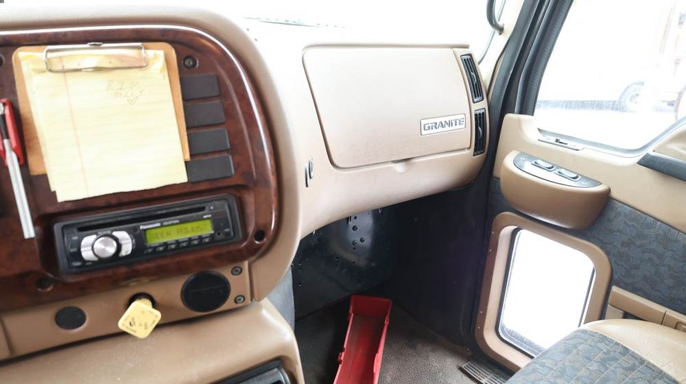 2004 Mack CV713 Granite dump truck with a 12.0L L6 diesel engine, manual transmission. VIN: 1M2AG12CX4M009022. Odometer reading: 34986.8. Hour meter: 3188.6 hours. Body: Tandem-axle dump truck with steel dump body. Interior features include analog gauge cluster, woodgrain dash trim, Panasonic radio, HVAC controls, differential lock switch, and auxiliary switches labeled beacon, strobe, and spreader. Seller reports: Runs and drives, Rusty, Title and key available. Must be towed.