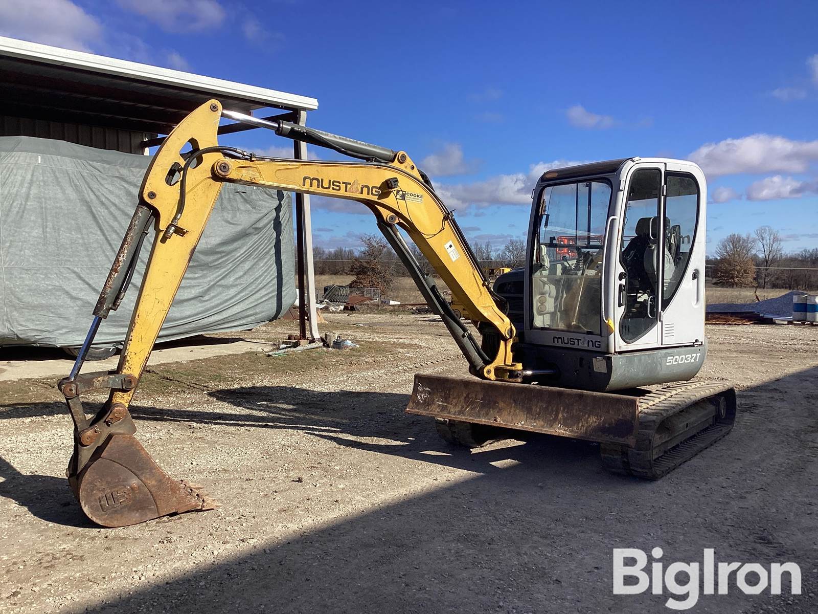 2004 Mustang 5003ZT Mini Excavator, Yanmar Model 4TNV88-PNS 4-Cyl Diesel Engine, 48hp, Articulating Boom, Joystick Controls, Auxiliary Hydraulics, 24" 5 Tooth Bucket, 78" Backfill Blade, 16" Rubber Tracks, Enclosed Cab, Suspension Seat, AM/FM Radio, NOTE: Machine Has A Hydraulic Leak Coming From Underneath Machine