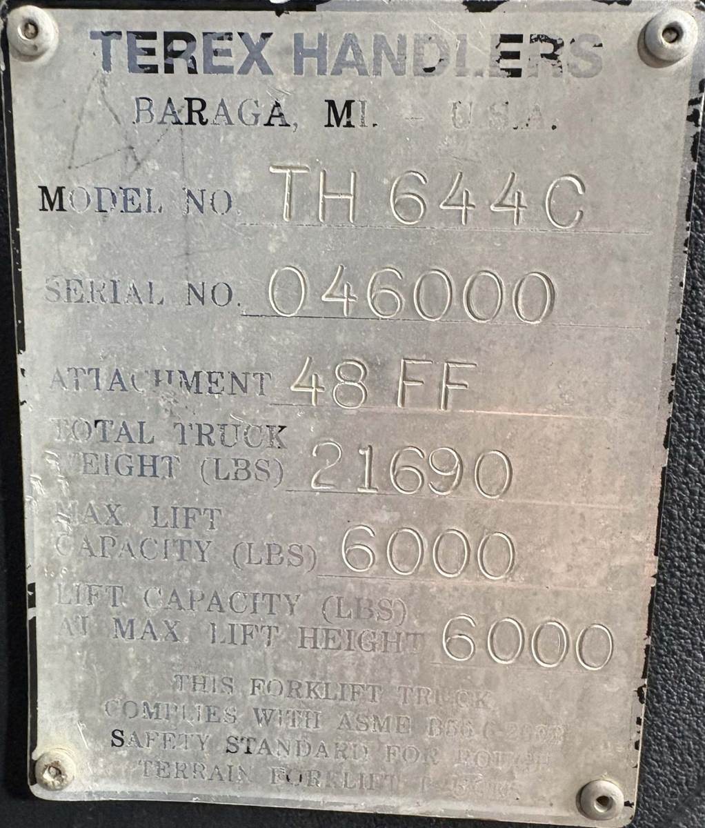 2004 TEREX TH644C Rough Terrain Telehandler - 99 HP John Deere 4045T turbo diesel engine, reads 668 hours, 6,000 lb capacity, 44 ft max lift height, 24-27 ft forward reach, 3-speed powershift transmission, 4x4, 3-mode steering (2-wheel/4-wheel/crab), operating weight 22,000 lbs, Financing available