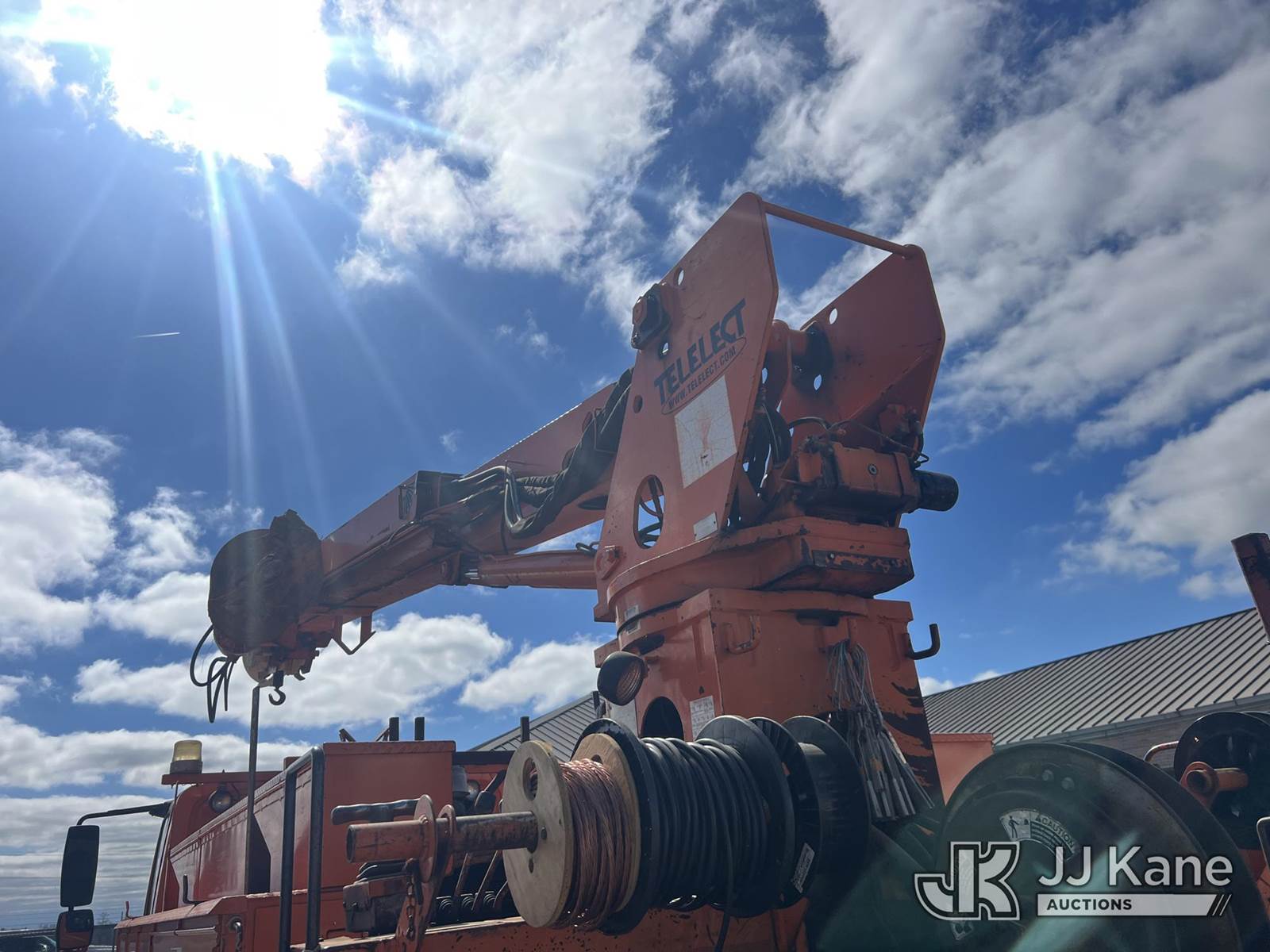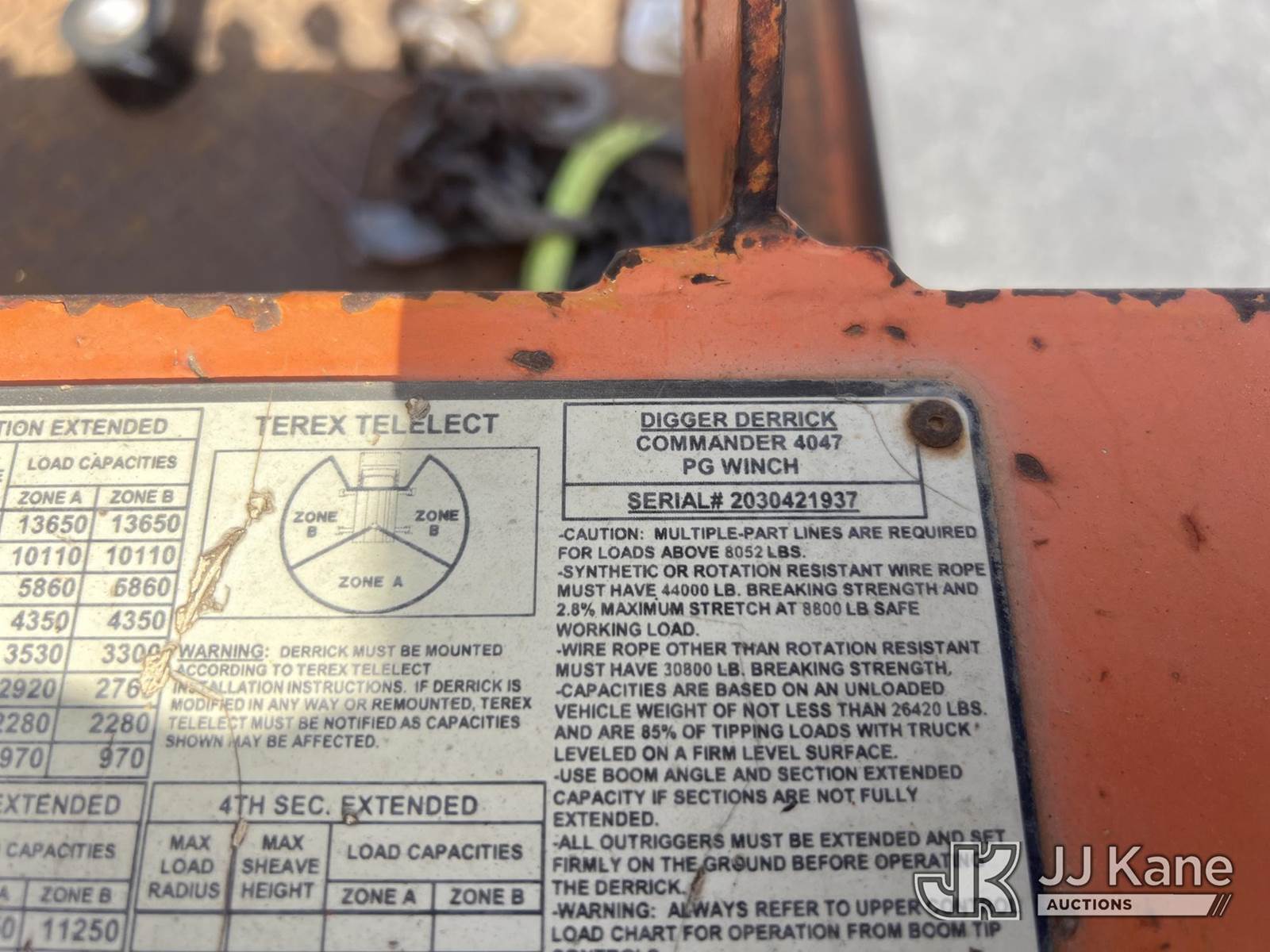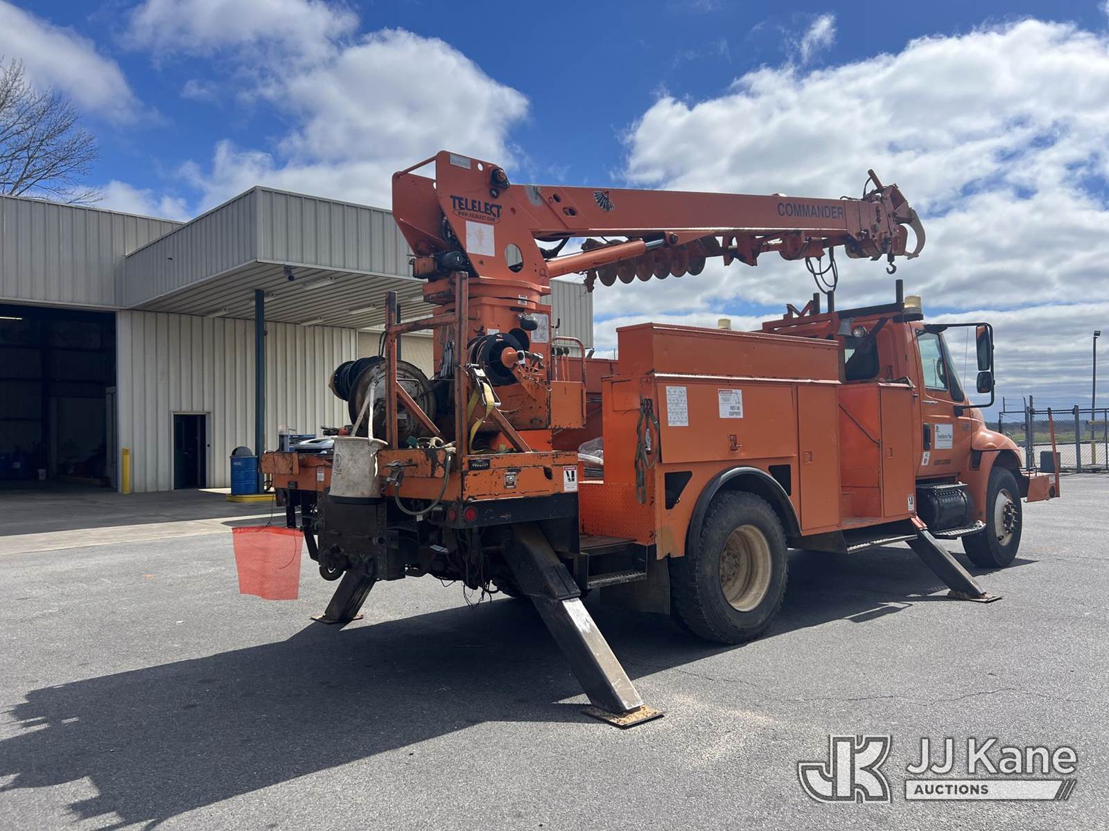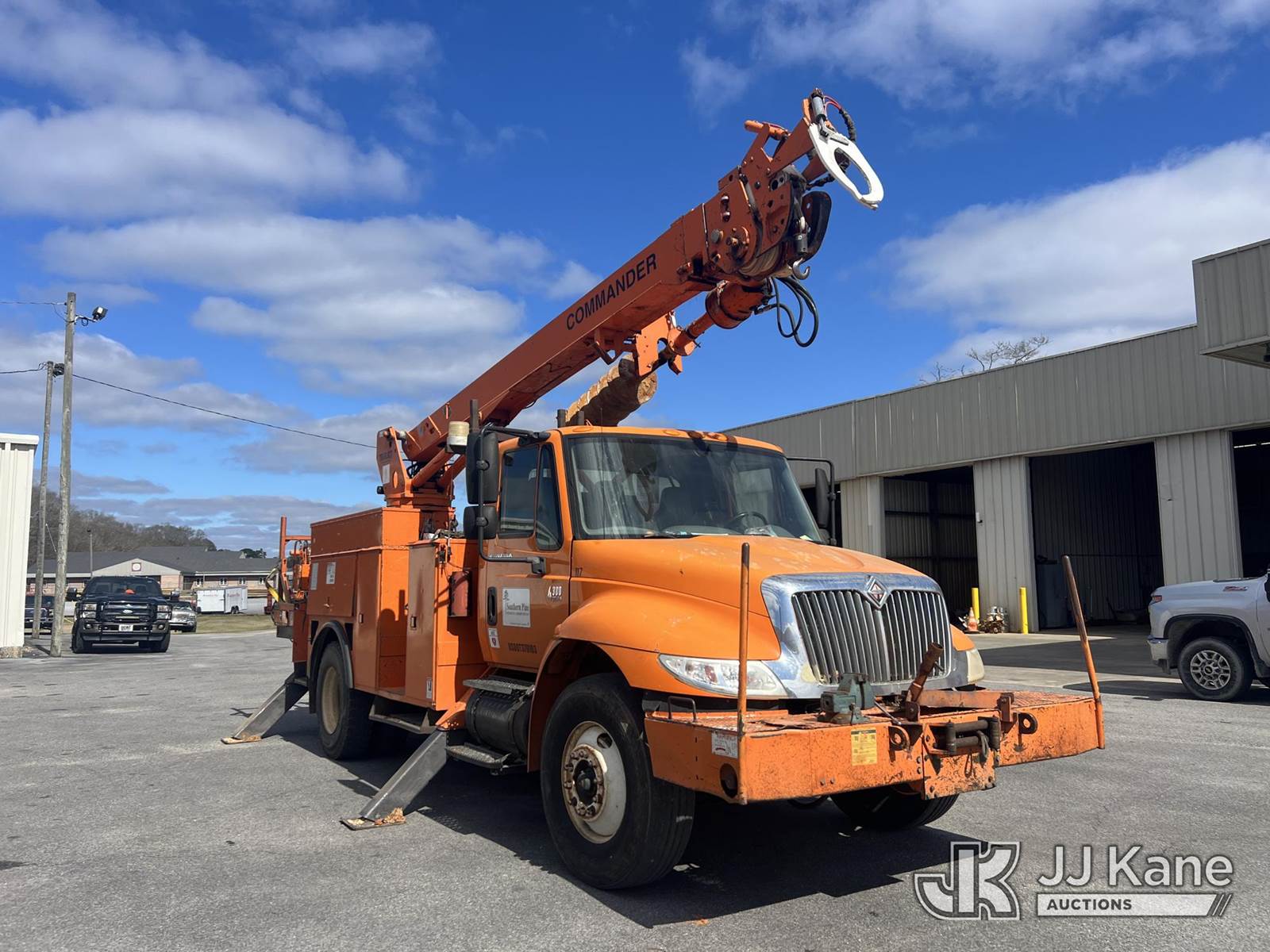 Terex/Telelect Commander 4047, 18,820 Lb Digger Derrick s/n 2030421937, with 47 ft sheave height, 2-spd digger, tip winch, pole grabs & dual standing rear controls , rear mounted on 2004 International 4300 Utility Truck, DT466 Diesel Auto, A/C, with front winch, (Exempt from Odometer Disclosure - Reads 258,917 miles) (Co-op Owned) (Runs, Moves & Upper Operates) (Body Damage ) This is a Titled Item NOTE: This unit is being sold AS IS/WHERE IS via Timed Auction and is located in Brewton, AL. For more information & removal arrangements please contact Dylan Evans @ 205-936-1094. Load out by appointment only, Buyer/Hauler must present copy of paid invoice upon arrival. Purchaser acknowledges ALL lots must be removed within 5 business days of Auction, or a storage fee may be incurred. For load out and pick up information, please reference the hauler sheet sent out after purchase. Alabama Auctioneer Michael Whitebread - License # 5592. (Missing manuals, See Auction Company for Manufacturers Information to obtain manuals) (Buyer is responsible for removal. Assistance by consignor or JJ Kane Auctions is not assured.)