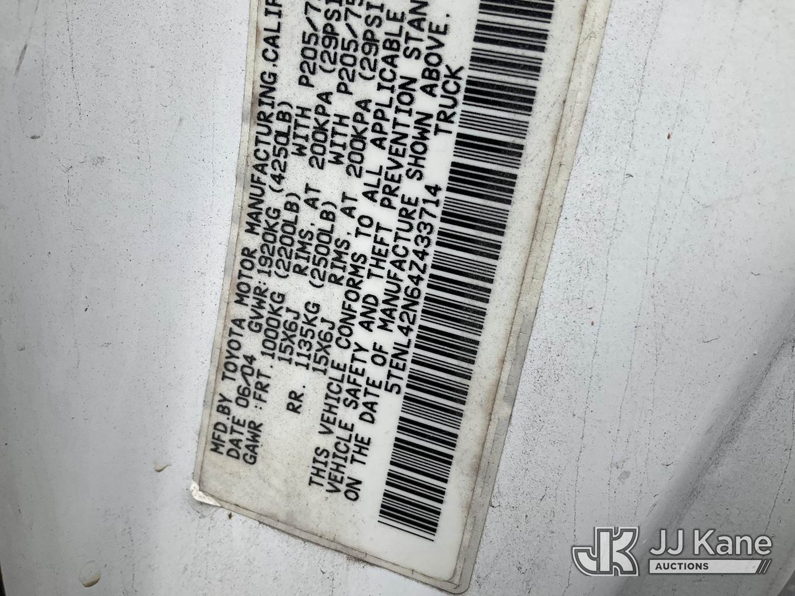 2004 Toyota Tacoma Pickup Truck, 2.4L L4 DOHC 16V gas, RWD, Auto, A/C, with bed cap, (Exempt from Odometer Disclosure - Reads 188,239 miles) (Runs & Moves) This is a Titled Item NOTE: This unit is being sold AS IS/WHERE IS via Timed Auction and is located in Rocky Top, TN. For more information & removal arrangements please contact Brandon Erhard @ brandon.erhard@jjkane.com. (Buyer is responsible for removal. Assistance by consignor or JJ Kane Auctions is not assured.)