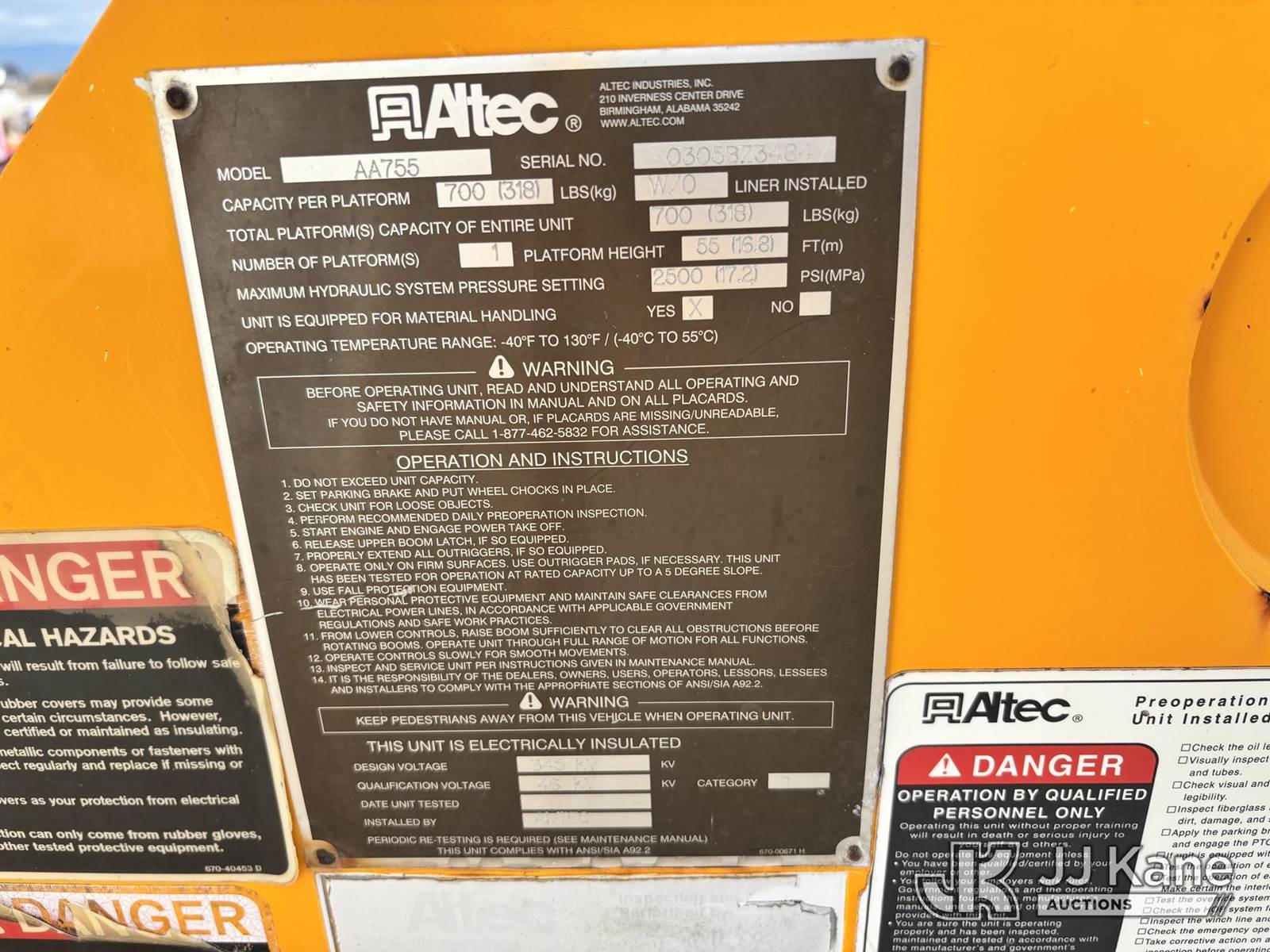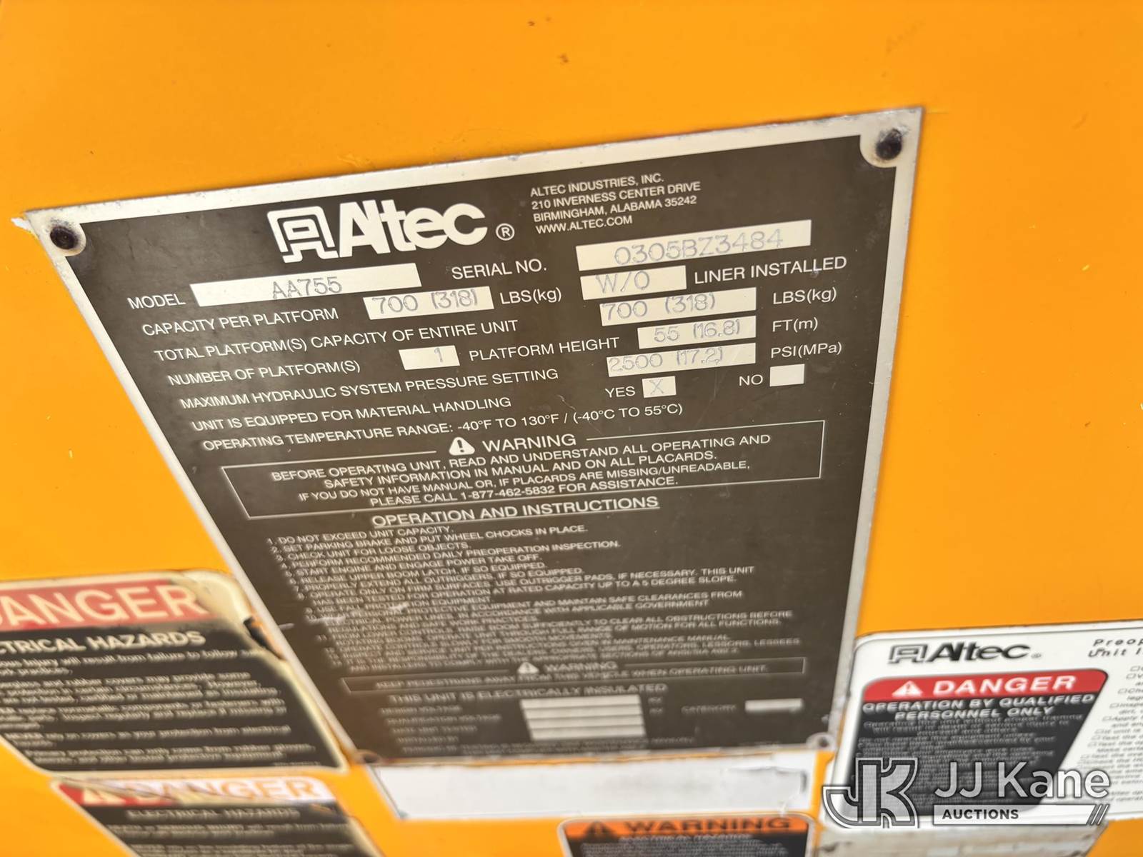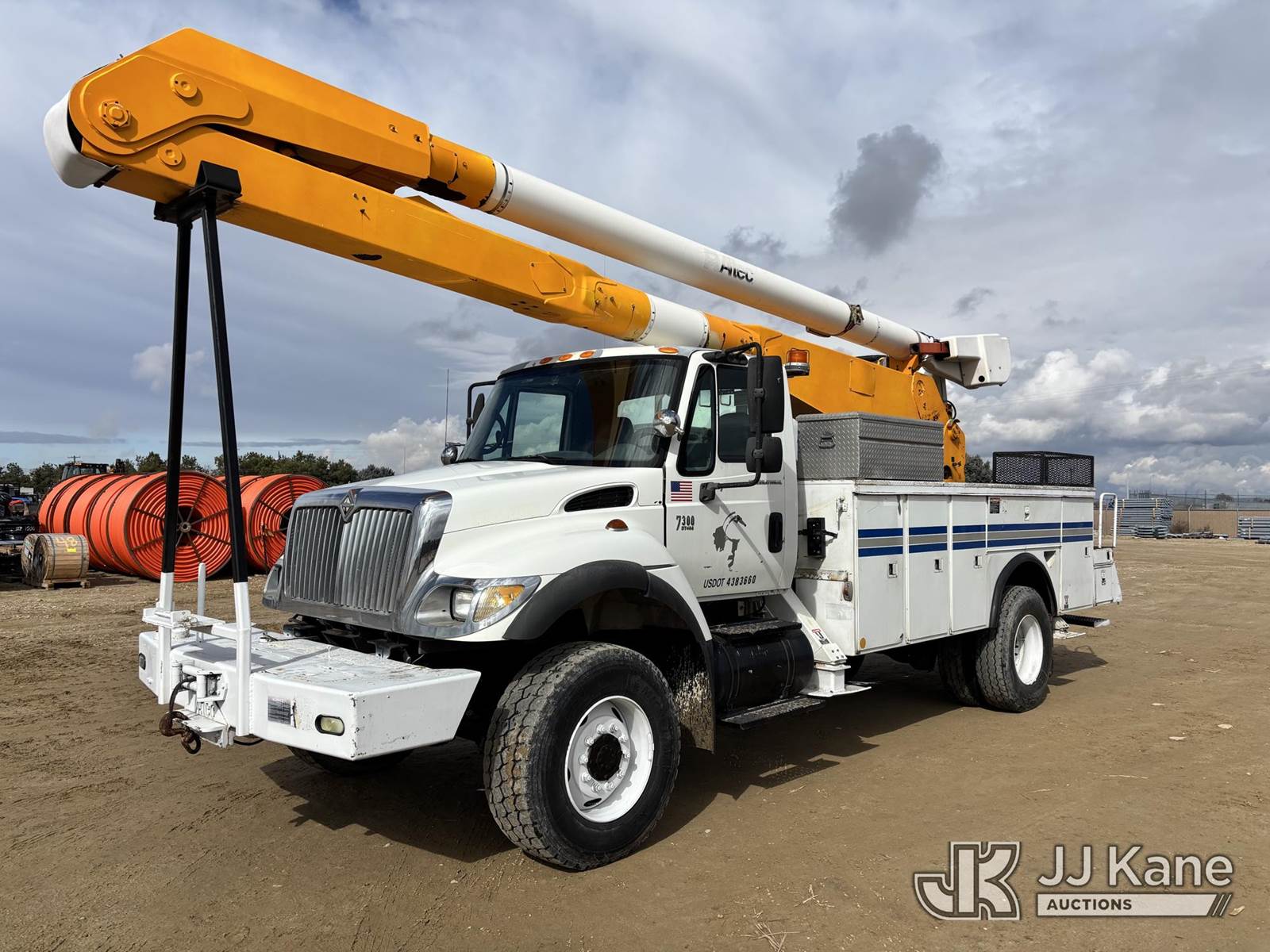 Altec AA755, 60 ft, Material Handling Bucket Truck s/n 0305BZ3484, with two man bucket & 4 hyd outriggers, rear mounted on 2005 International 7300 Utility Truck, s/n 1HTWBAAR85J171431, DT466E 4X4, diesel, Auto, A/C, with 7.6L diesel, front winch, (Exempt from Odometer Disclosure - Reads 203,252 miles) (Runs, Moves & Upper Operates) (The manufacturer has notified JJ Kane that this equipment is subject to an open recall. CSN 526 Hydraulic Platform Tilt Lever Improvement The equipment should not be operated until this is addressed. Buyer is responsible for reviewing the recall notice and contacting the manufacturer to schedule the recommended corrective actions. Associated costs may be covered by the manufacturer in some cases.) (Reads 19,514 hours) This is a Titled Item NOTE: This unit is being sold AS IS/WHERE IS via Timed Auction and is located in Nampa, ID. (Missing manuals, See Auction Company for Manufacturers Information to obtain manuals) (Buyer is responsible for removal. Assistance by consignor or JJ Kane Auctions is not assured.)