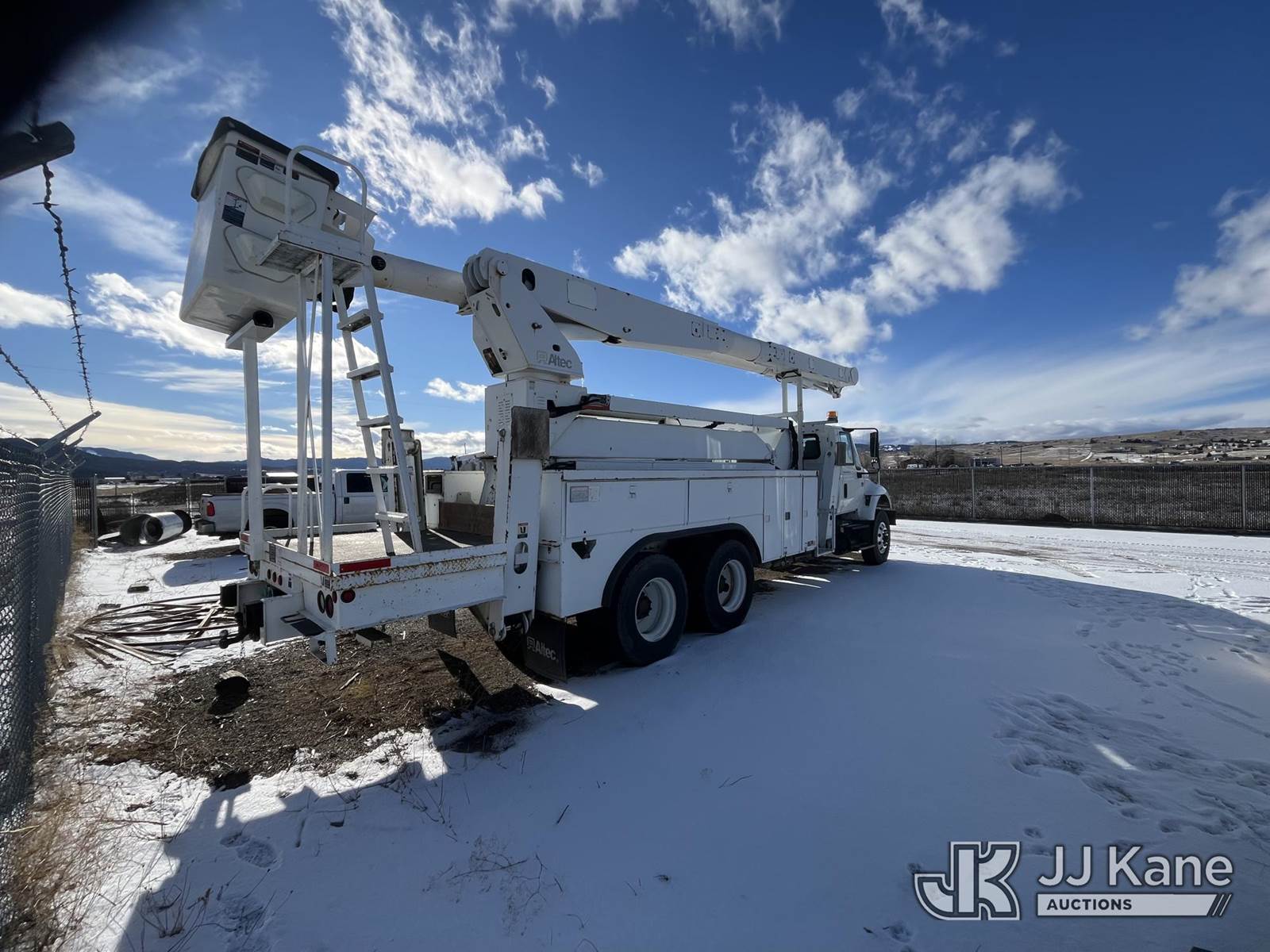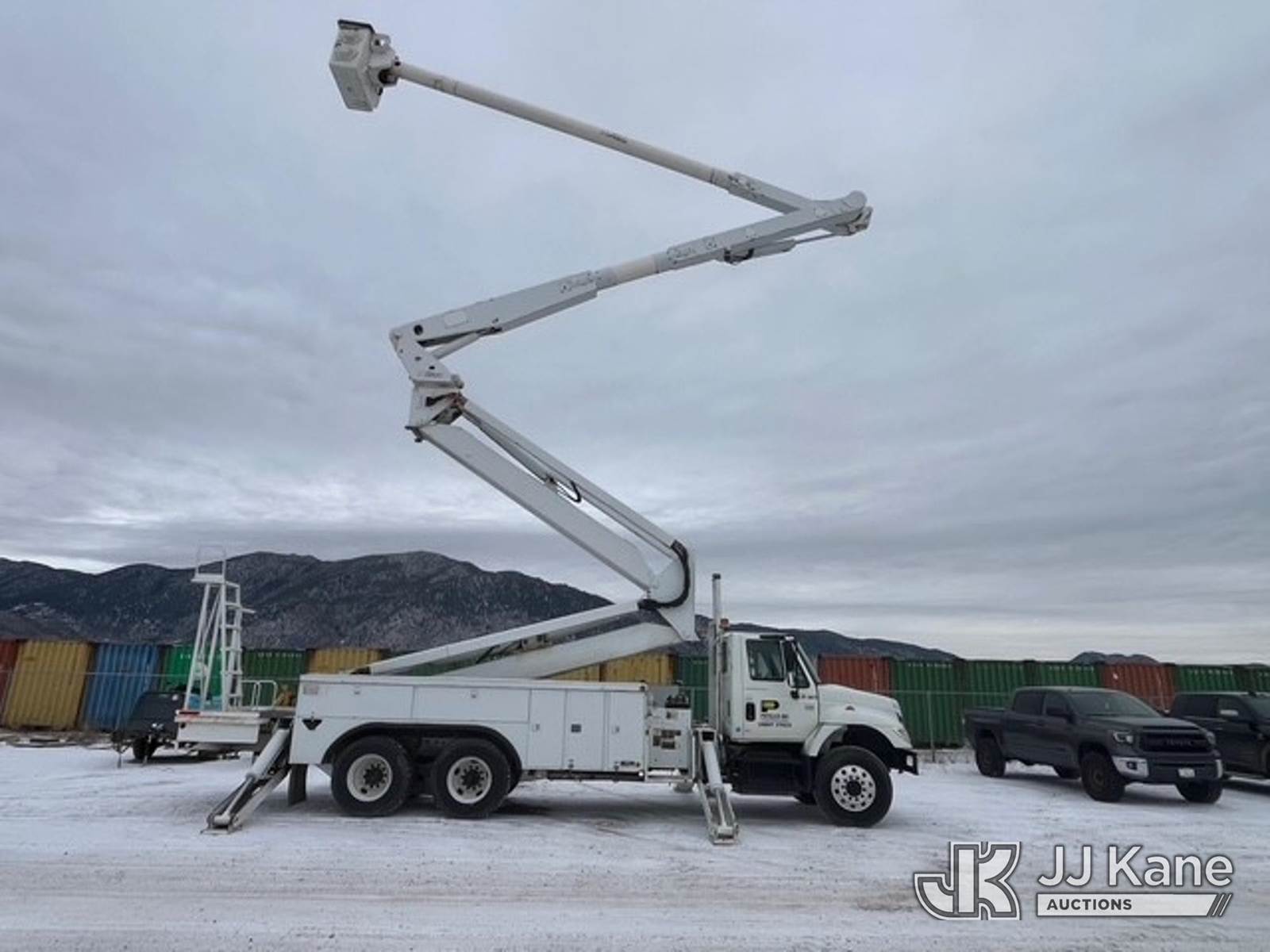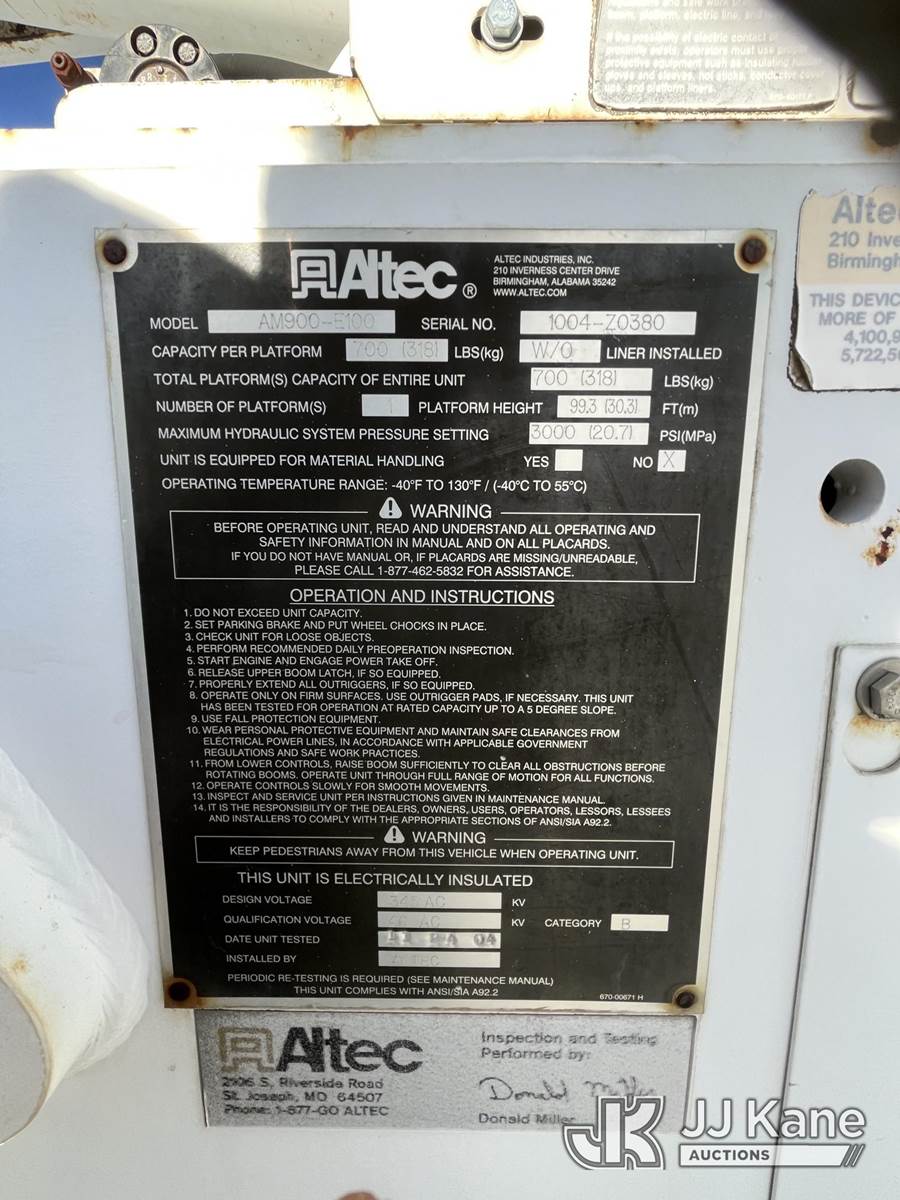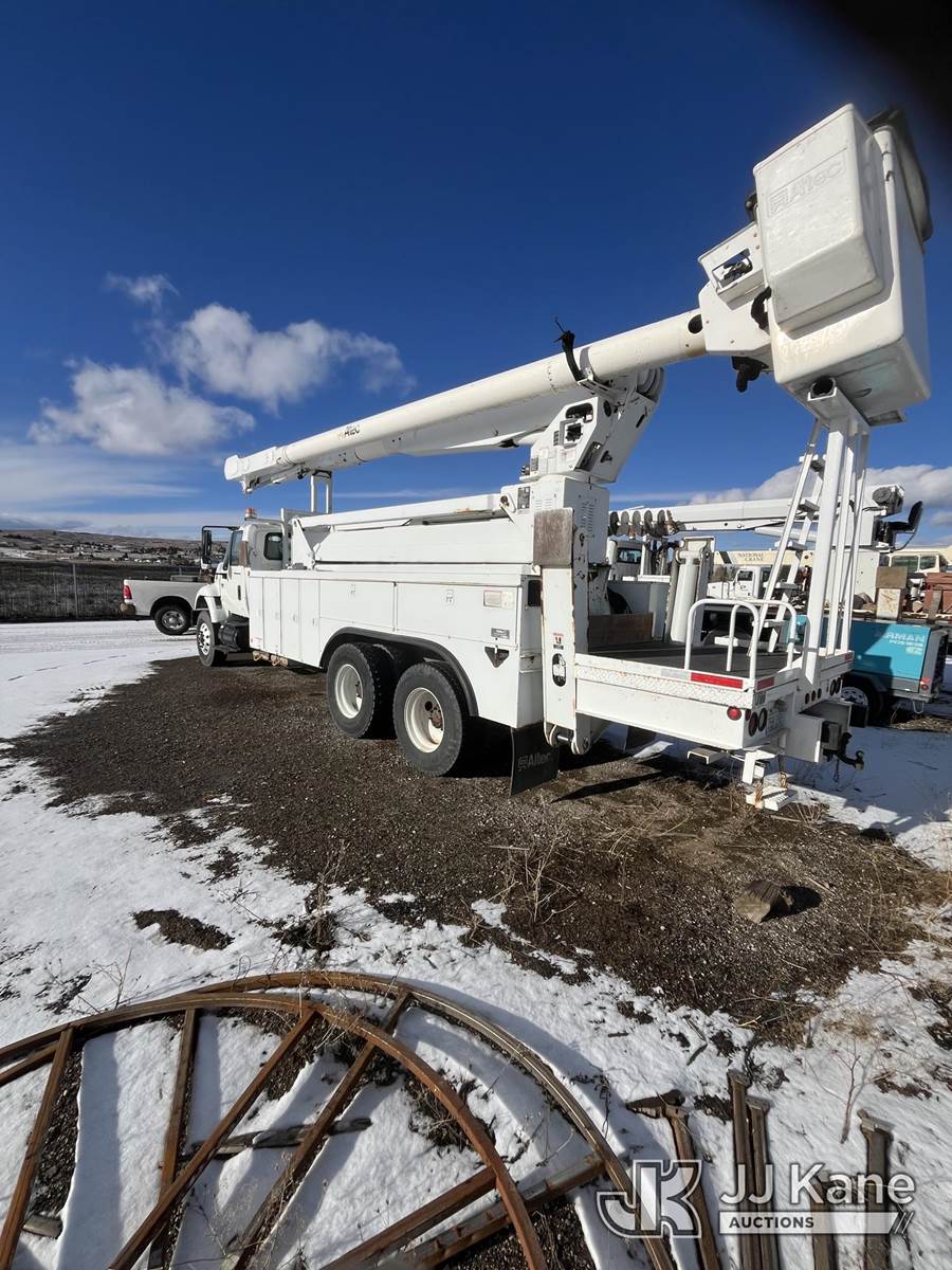 Altec AM900-E100, 105 ft, Double-Elevator Over-Center Bucket Truck s/n 1004-Z0380, with two man bucket, rear mounted on 2005 International 7400 T/A Utility Truck, 7.6L diesel, manual, 6X4, (Exempt from Odometer Disclosure - Reads 54,781 miles) (Run, Moves & Upper Operates) (Seller States: Transmission issues) This is a Titled Item NOTE: This unit is being sold AS IS/WHERE IS via Timed Auction and is located in Laurel, MT. For pre-sale questions or concerns about the vehicle, to schedule an inspection or vehicle pick-up please contact Ry Hampton at 206-247-8928 or ry.hampton@jjkane.com. (Missing manuals, See Auction Company for Manufacturers Information to obtain manuals) (Buyer is responsible for removal. Assistance by consignor or JJ Kane Auctions is not assured.)