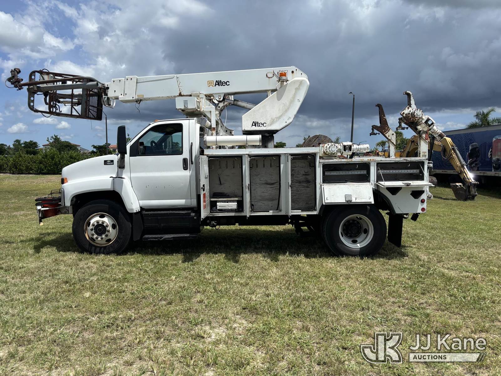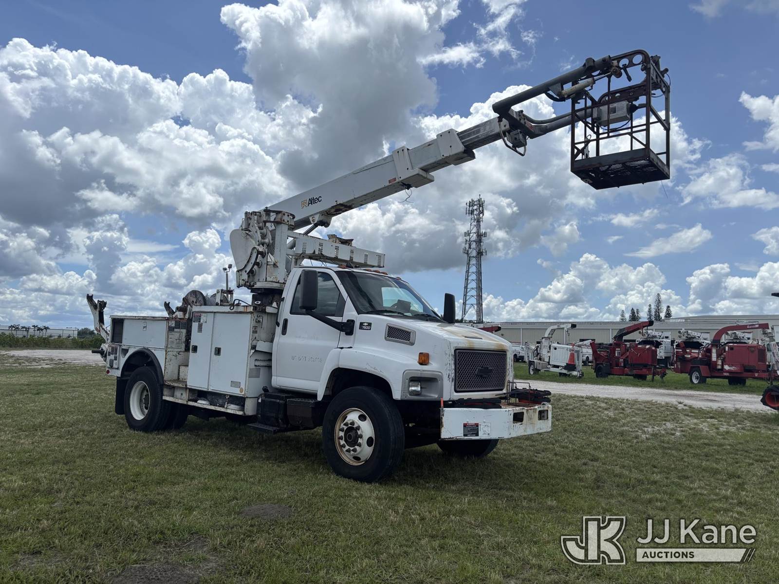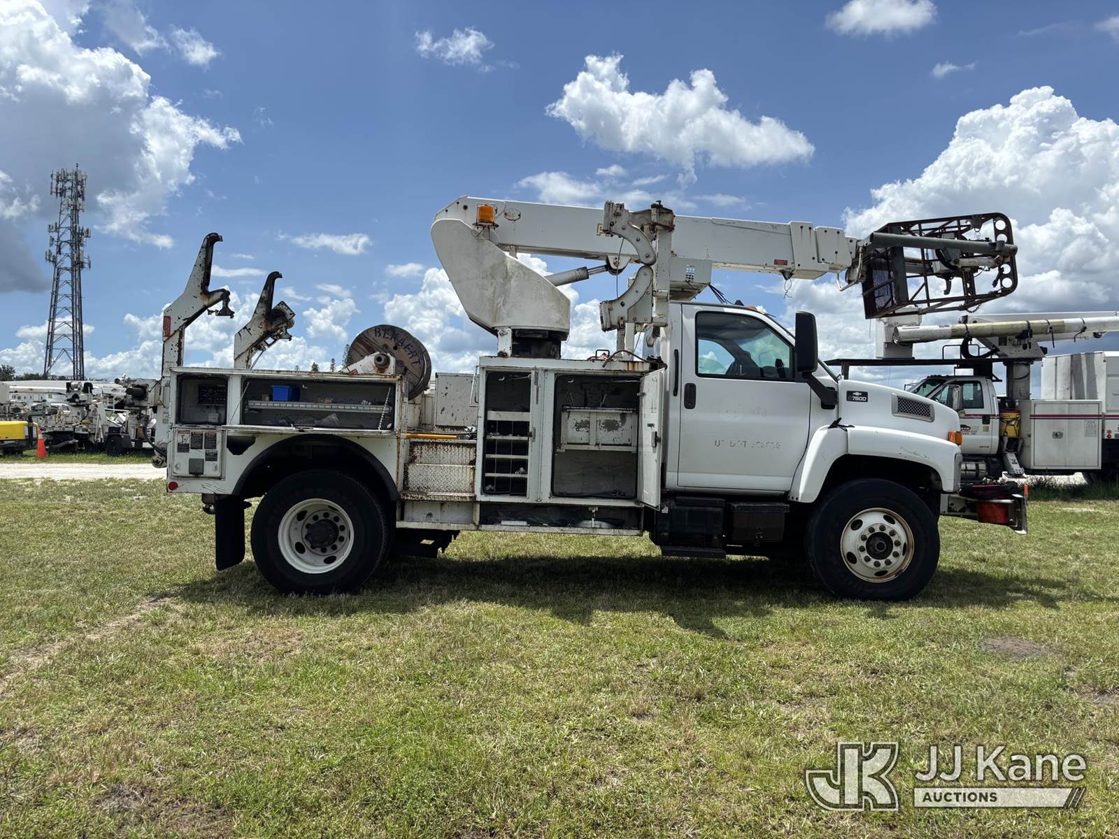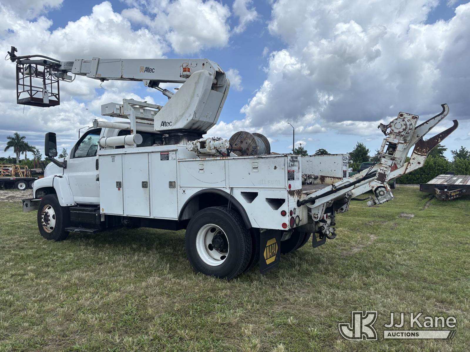 Altec AP45A, 45 ft, Telescopic Non-Insulated Cable Placing Bucket Truck s/n 0805DH0246, with single-man basket, center mounted on 2005 Chevrolet C7500 Utility Truck, Cat C7 diesel, Auto, A/C, with hyd reel loader w/winder, (Exempt from Odometer Disclosure - Reads 130,875 miles) (Runs, Moves, & Operates) (Body & Paint Damage) (FL Residents Purchasing Titled Items - tax, title & registration fees will be collected at the maximum rate of $400.00 under 25,999 and $800.00 for Over 26,000 and $250.00 trailers - Proof of insurance is mandatory; Out of State Residents Purchasing Title Items - tax will be collected based upon your state rate.) This is a Titled Item NOTE: This unit is being sold AS IS/WHERE IS via Timed Auction and is located in Westlake, FL. Inspection & preview days for this unit are the 2 business days prior to the first day of items closing for this auction, item is located at 4003 Seminole Pratt Whitney Rd Westlake, FL 33470 and hours of operations are 8a-4p. FL Residents Purchasing Titled Items - tax, title & registration fees will be collected at the maximum rate of $400.00 under 25,999 and $800.00 for Over 26,000. - Proof of insurance is mandatory; Out of State Residents Purchasing Title Items - tax will be collected based upon your state rate. Buyer must load without assistance from seller. For Pick Up & Removal information, please contact: Matt Johnson @ 205-847-9106. Removals require 24-hr Notice by Appointment Only, Buyer/Hauler must present copy of Paid-in-Full JJ Kane Release Form upon arrival. Purchaser acknowledges ALL lots must be removed within 10 business days of Auction, or a towing & storage fee may be incurred. (Missing manuals, See Auction Company for Manufacturers Information to obtain manuals) (Buyer is responsible for removal. Assistance by consignor or JJ Kane Auctioneers is not assured.)