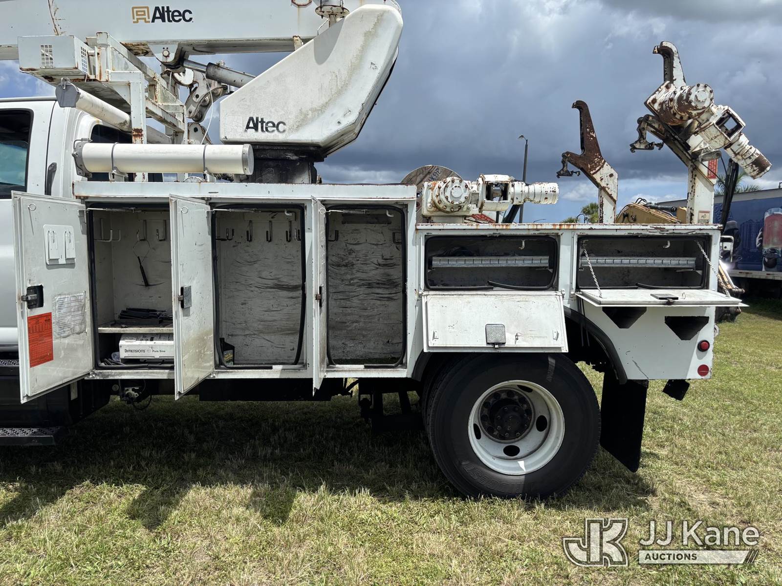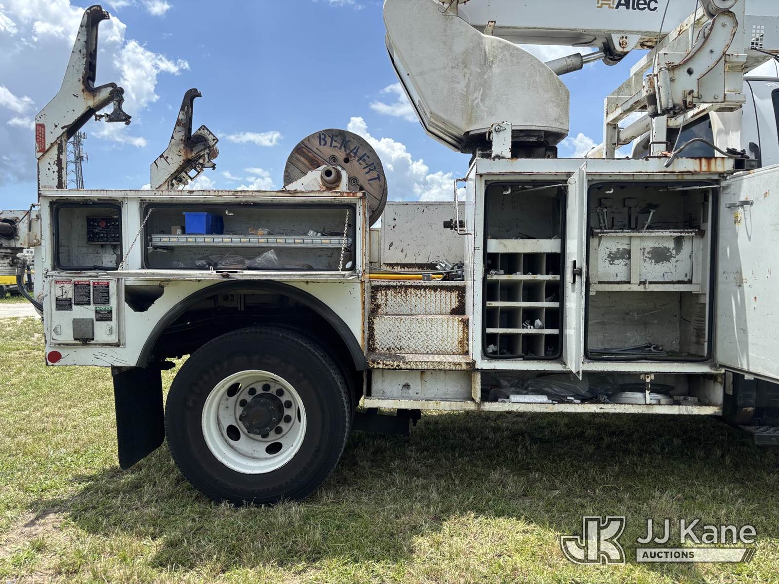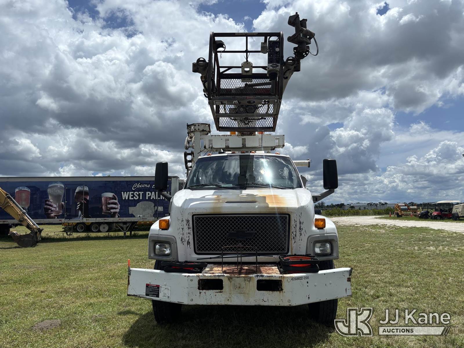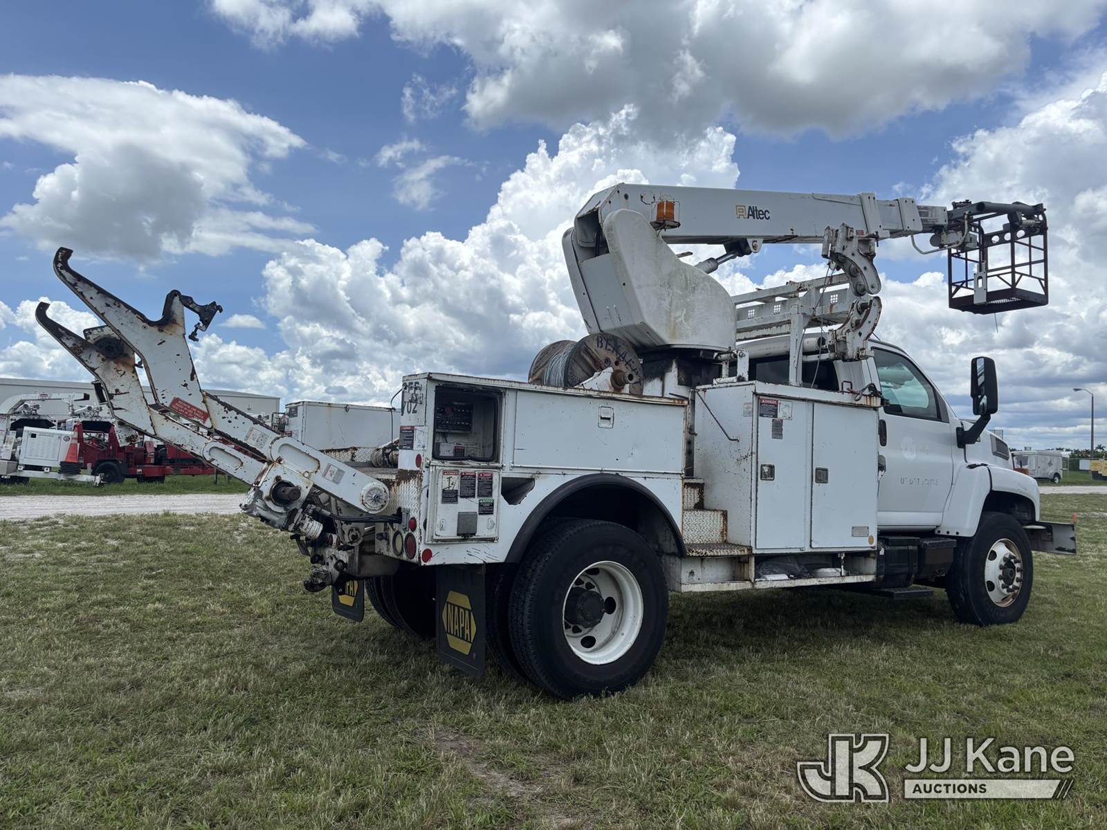 Altec AP45A, 45 ft, Telescopic Non-Insulated Cable Placing Bucket Truck s/n 0805DH0246, with single-man basket, center mounted on 2005 Chevrolet C7500 Utility Truck, Cat C7 diesel, Auto, A/C, with hyd reel loader w/winder, (Exempt from Odometer Disclosure - Reads 130,875 miles) (Runs, Moves, & Operates) (Body & Paint Damage) (FL Residents Purchasing Titled Items - tax, title & registration fees will be collected at the maximum rate of $400.00 under 25,999 and $800.00 for Over 26,000 and $250.00 trailers - Proof of insurance is mandatory; Out of State Residents Purchasing Title Items - tax will be collected based upon your state rate.) This is a Titled Item NOTE: This unit is being sold AS IS/WHERE IS via Timed Auction and is located in Westlake, FL. Inspection & preview days for this unit are the 2 business days prior to the first day of items closing for this auction, item is located at 4003 Seminole Pratt Whitney Rd Westlake, FL 33470 and hours of operations are 8a-4p. FL Residents Purchasing Titled Items - tax, title & registration fees will be collected at the maximum rate of $400.00 under 25,999 and $800.00 for Over 26,000. - Proof of insurance is mandatory; Out of State Residents Purchasing Title Items - tax will be collected based upon your state rate. Buyer must load without assistance from seller. For Pick Up & Removal information, please contact: Matt Johnson @ 205-847-9106. Removals require 24-hr Notice by Appointment Only, Buyer/Hauler must present copy of Paid-in-Full JJ Kane Release Form upon arrival. Purchaser acknowledges ALL lots must be removed within 10 business days of Auction, or a towing & storage fee may be incurred. (Missing manuals, See Auction Company for Manufacturers Information to obtain manuals) (Buyer is responsible for removal. Assistance by consignor or JJ Kane Auctioneers is not assured.)