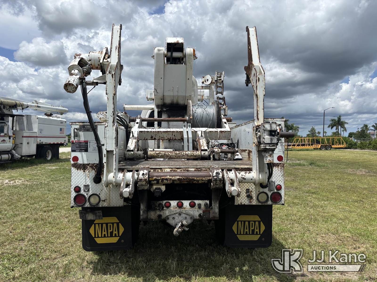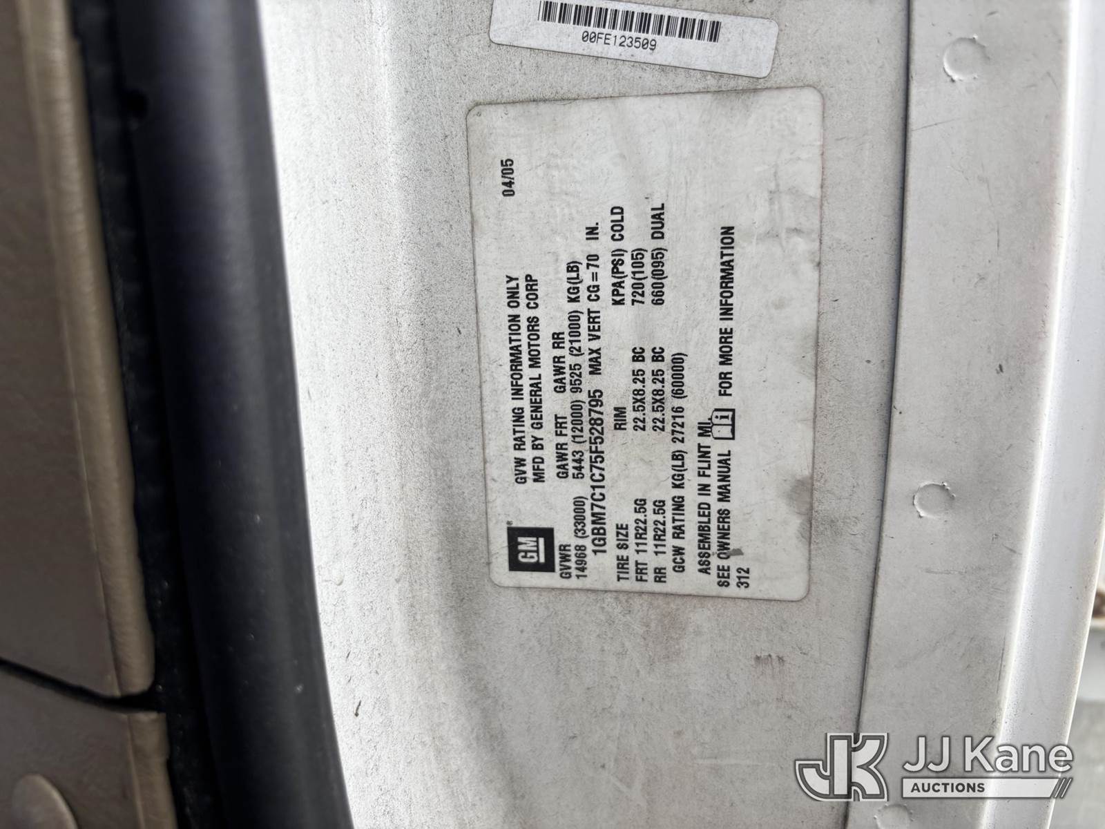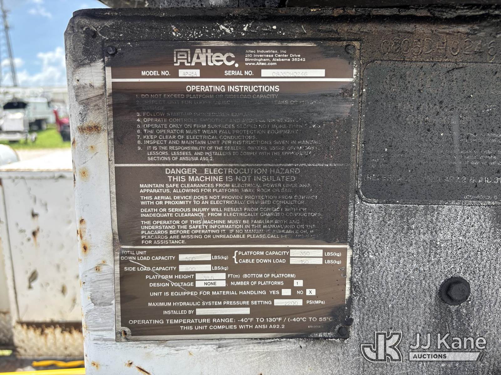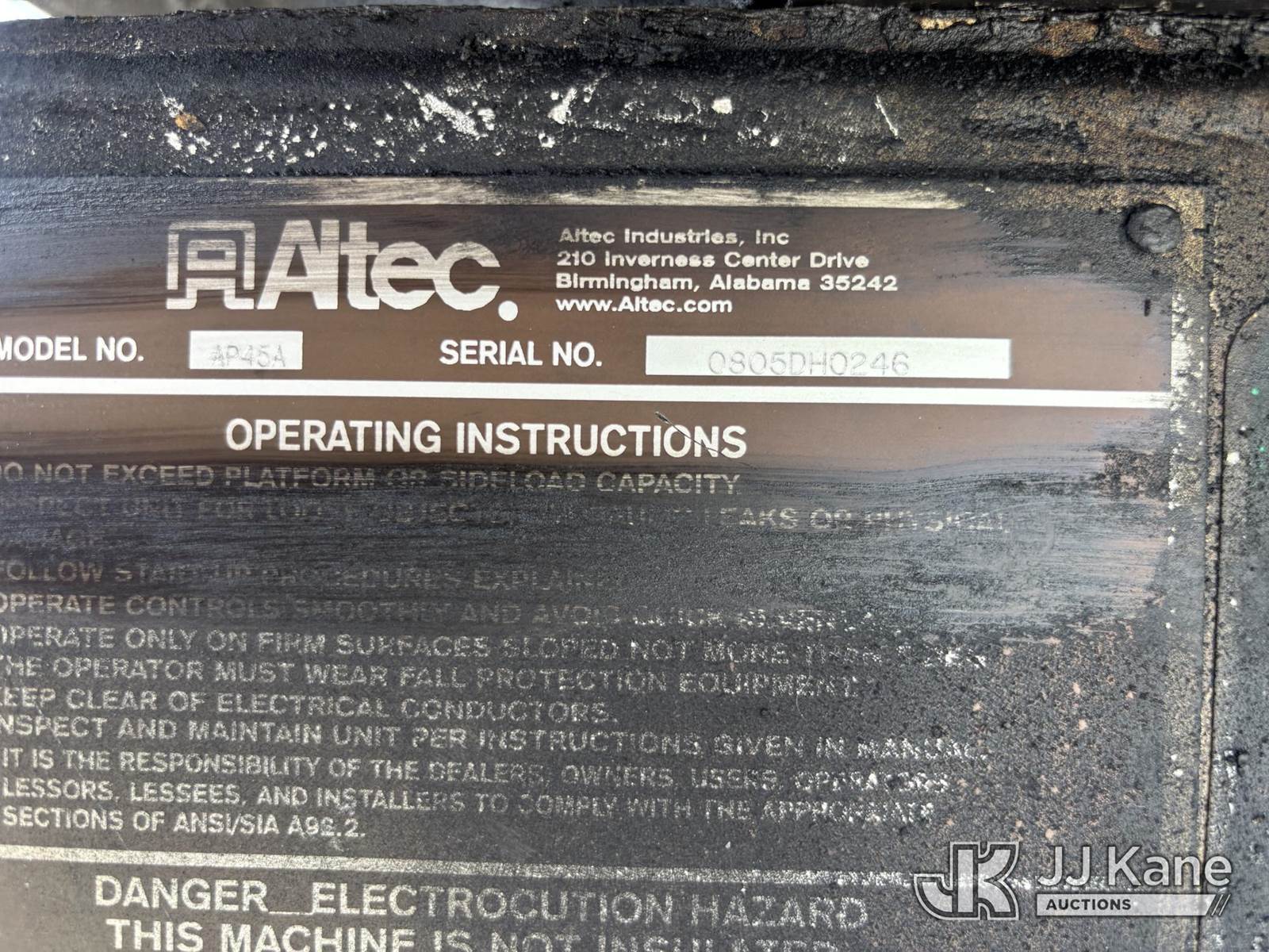 Altec AP45A, 45 ft, Telescopic Non-Insulated Cable Placing Bucket Truck s/n 0805DH0246, with single-man basket, center mounted on 2005 Chevrolet C7500 Utility Truck, Cat C7 diesel, Auto, A/C, with hyd reel loader w/winder, (Exempt from Odometer Disclosure - Reads 130,875 miles) (Runs, Moves, & Operates) (Body & Paint Damage) (FL Residents Purchasing Titled Items - tax, title & registration fees will be collected at the maximum rate of $400.00 under 25,999 and $800.00 for Over 26,000 and $250.00 trailers - Proof of insurance is mandatory; Out of State Residents Purchasing Title Items - tax will be collected based upon your state rate.) This is a Titled Item NOTE: This unit is being sold AS IS/WHERE IS via Timed Auction and is located in Westlake, FL. Inspection & preview days for this unit are the 2 business days prior to the first day of items closing for this auction, item is located at 4003 Seminole Pratt Whitney Rd Westlake, FL 33470 and hours of operations are 8a-4p. FL Residents Purchasing Titled Items - tax, title & registration fees will be collected at the maximum rate of $400.00 under 25,999 and $800.00 for Over 26,000. - Proof of insurance is mandatory; Out of State Residents Purchasing Title Items - tax will be collected based upon your state rate. Buyer must load without assistance from seller. For Pick Up & Removal information, please contact: Matt Johnson @ 205-847-9106. Removals require 24-hr Notice by Appointment Only, Buyer/Hauler must present copy of Paid-in-Full JJ Kane Release Form upon arrival. Purchaser acknowledges ALL lots must be removed within 10 business days of Auction, or a towing & storage fee may be incurred. (Missing manuals, See Auction Company for Manufacturers Information to obtain manuals) (Buyer is responsible for removal. Assistance by consignor or JJ Kane Auctioneers is not assured.)