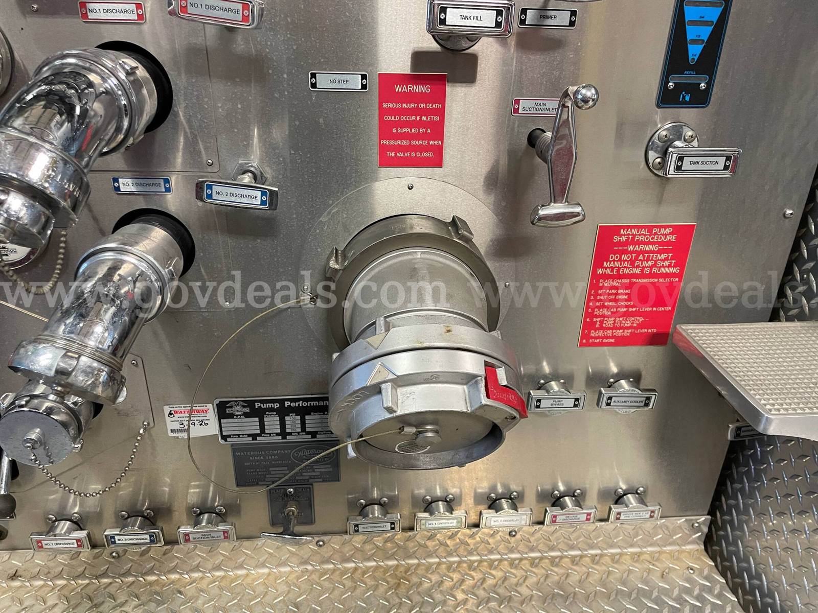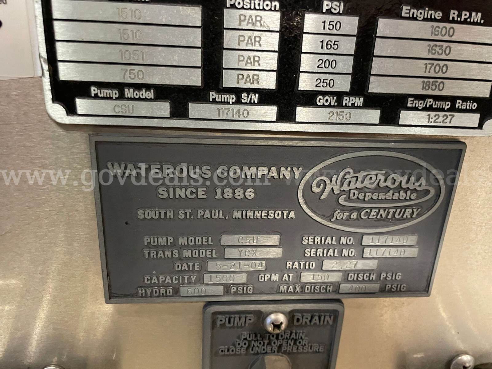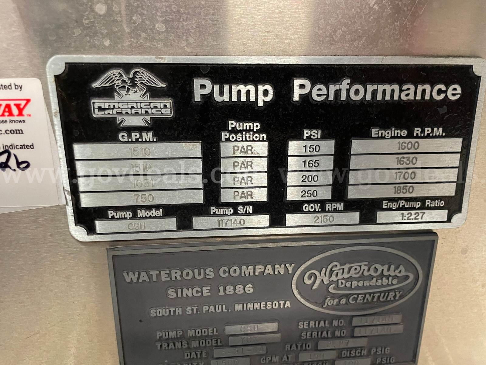 2005 American LeFrance Eagle Rescue Pumper Detroit Diesel Engine / Allison Automatic Transmission Miles: 15,741 Engine Hours: 638.7 Starts & Runs Pump Manu: Waterous Pump Pump Model: CSU Serial #: 117140 Pump Hours: 89.3 GPM: 1500 Last Tested: 03/19/2026 Pump Cert Exp: 03/19/2027 Water Tank: 750 Gallons Intakes: 4 / 260H 40NST / 2 - 3" Aux Discharges: 9 Plus Deck Gun / 3 Driver Side / Front Bumper 2 Aux / Rear Aux Night-scan Deck Gun - Operational Five (5) Hand Lights Generator All Tools & Equipment in Truck Bays to be Removed / None of the Equipment is included with the Truck Linwood Decals to be Removed with Impressions Left Sold As Is / Where Is