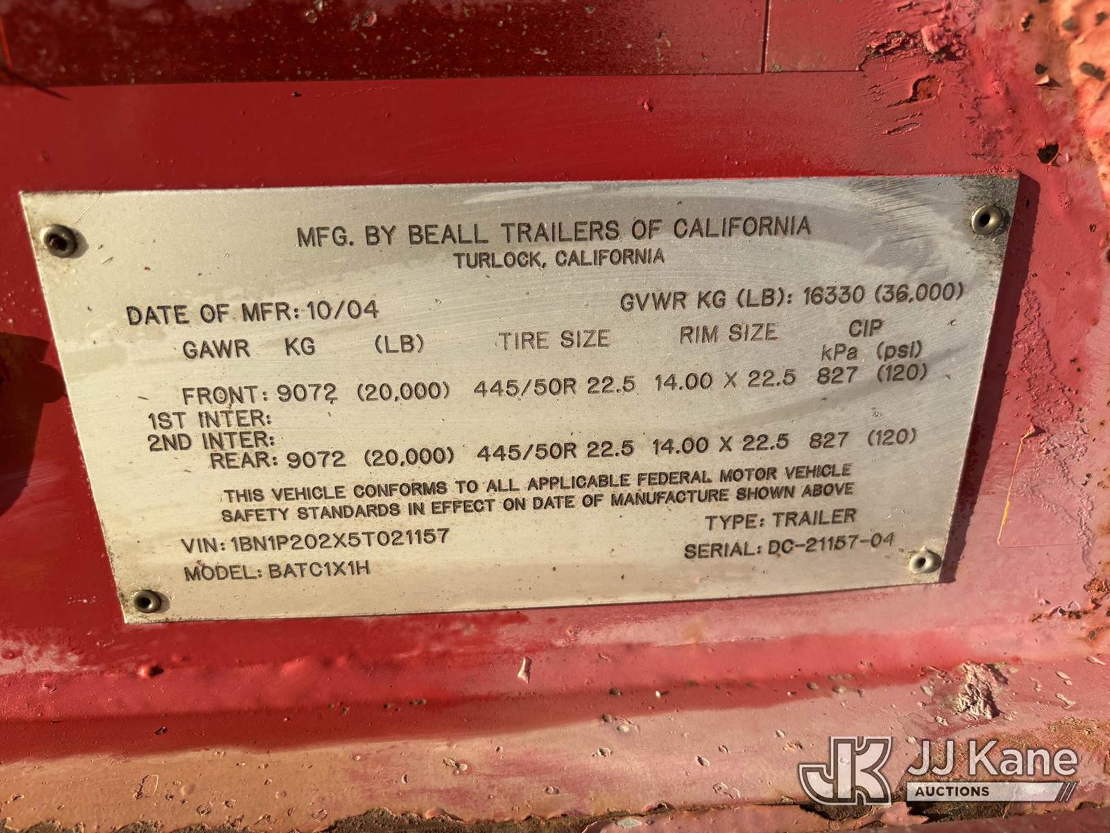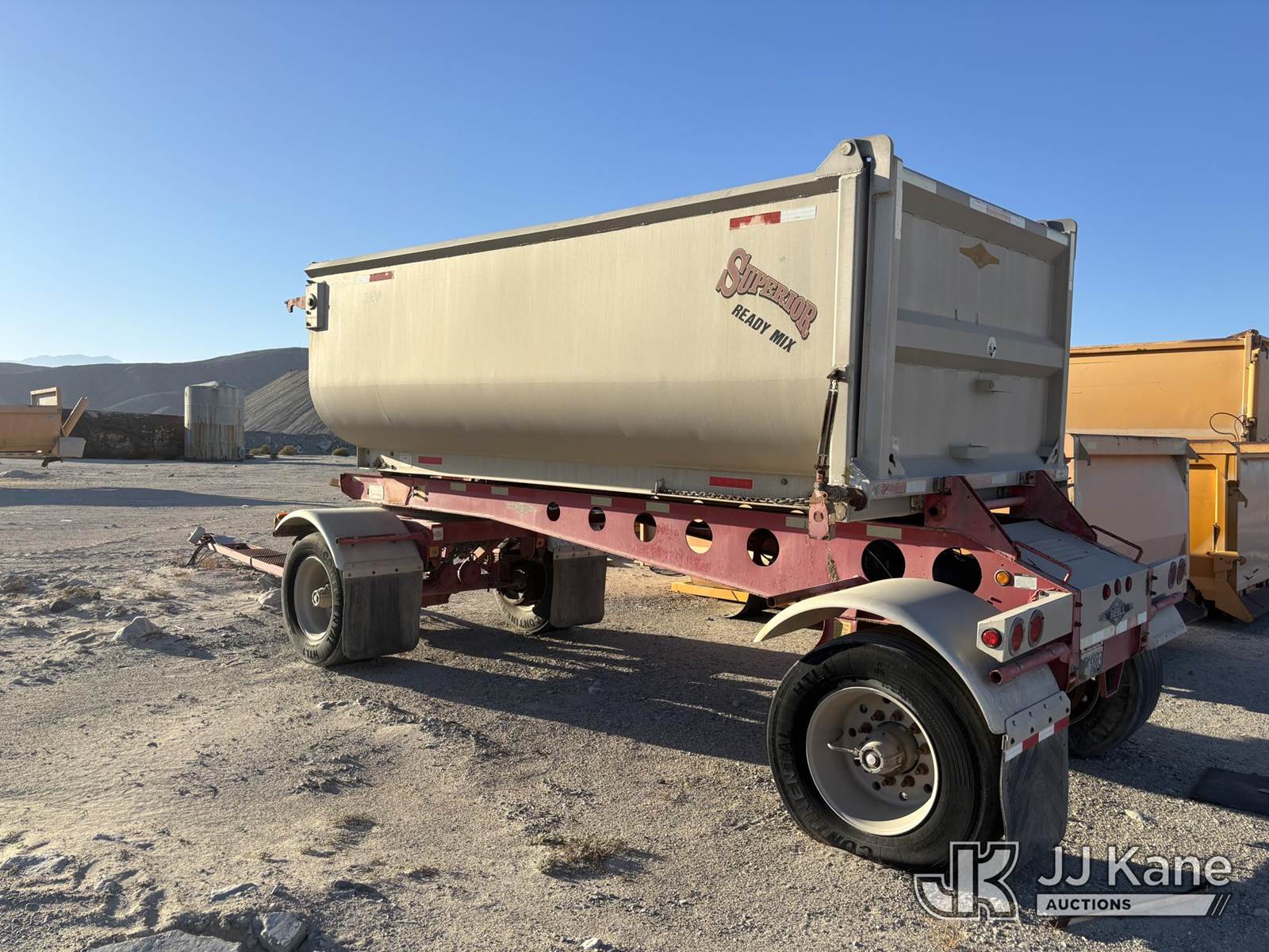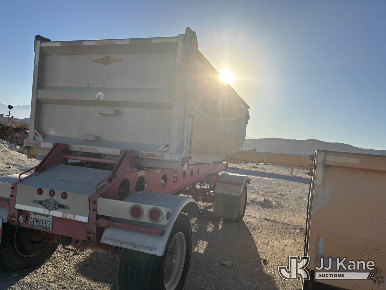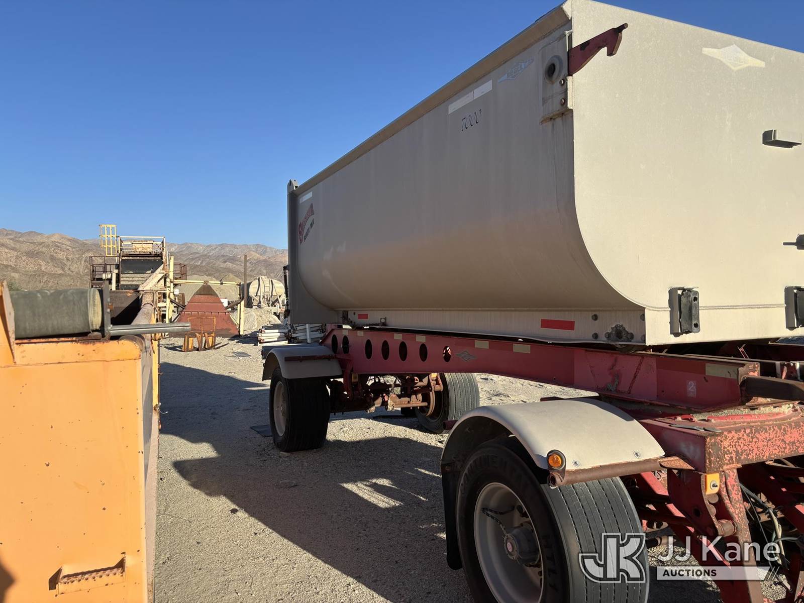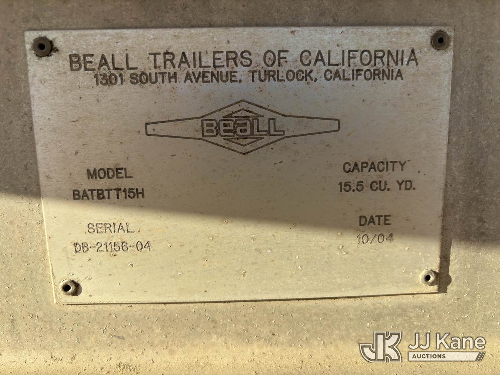 2005 Beall Trailers BATC1X1H "Bathtub" Pup End-Dump, 2005 Beall 15.5-yd Aluminum Bathtub Pup End-Dump (VIN 1BN1P202X5T021157) - 36K GVWR, tandem walking-beam, air brakes, 445/50R22.5 super-singles; straight tub with tailgate cylinders-work-ready with cosmetic rust/wear as shown. (Frame shows surface rust and paint fade; tub straight; tires show mixed wear; typical quarry dust and cosmetics) This is a Titled Item NOTE: This unit is being sold AS IS/WHERE IS via Timed Auction and is located in Desert Hot Springs, CA. (Buyer is responsible for removal. Assistance by consignor or JJ Kane Auctions is not assured.)