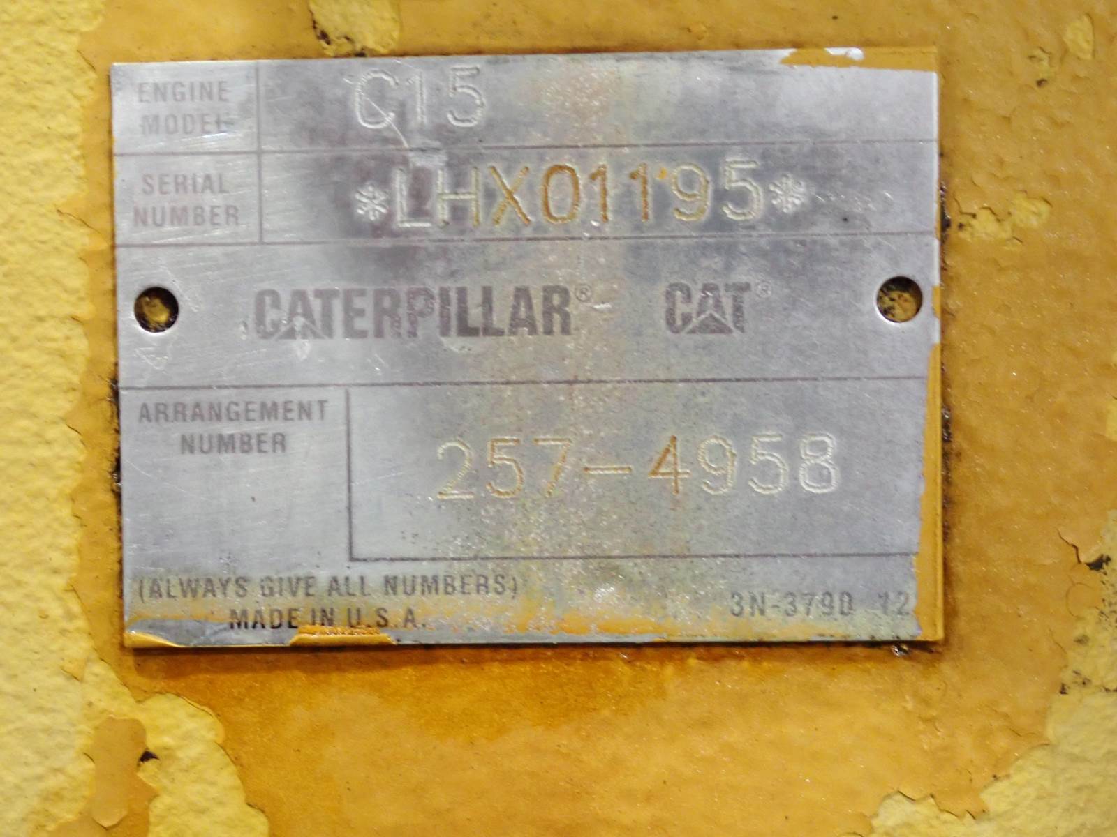 2005 Caterpillar C15 diesel engine, turbocharged, air to air intercooled, arrangement # 257-4958 (2574958,) originally built for a 365C or 365CL excavator but used at a tech school for testing only. ENGINE HAS ONLY 187 ORIGINAL HOURS, ECM VERIFIED. TEST RAN EXCELLENT. 75 PSI OIL PRESSURE, NO SMOKE OR BLOWBY OBSERVED. FLYWHEEL HOUSING HAS BEEN CHANGED FOR EASE OF TEST RUNNING AND DOES NOT MATCH ARRANGEMENT. SEE VIDEO -- ENGINE RUNS LIKE NEW !! ONE OF A KIND -- CAN'T BUY THESE ANYMORE !! DON'T MISS THIS ONE. This engine uses CORE arrangement # 241-5929 (2415929) and will fit the following: 825C, 825H, 826C and 826H COMPACTORS 365C, 365CL, 374D, 374DL EXCAVATORS 770 TRUCKS W/ BZZ PREFIX 583T, 587T, PL83 AND PL87 PIPELAYERS D8R AND D8T DOZERS 824C AND 824H WHEEL DOZERS 621G, 623G, 657E AND 657G SCRAPERS (AND OTHERS) 980H WHEEL LOADERS AND OTHERS !!