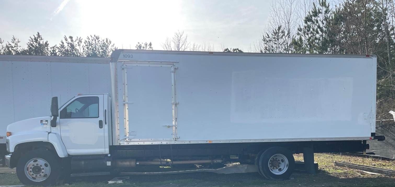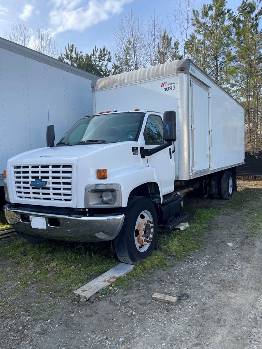 2005 Chevrolet c7500, Catepillar LG5 Diesel, 220k miles, 24' Supreme Box, Class 6, Fuller Manual Trans, Hydraulic Brakes, GVW 26,000 lbs, 90 in high x90 in wide, rear roll up door with ramp, single door on drivers side, double door on passenger side of box, ground to top of box 135.5 in, wheelbase 252 in. Passenger side of box has location that previously had compressor and was covered w painted plywood, does not leak.