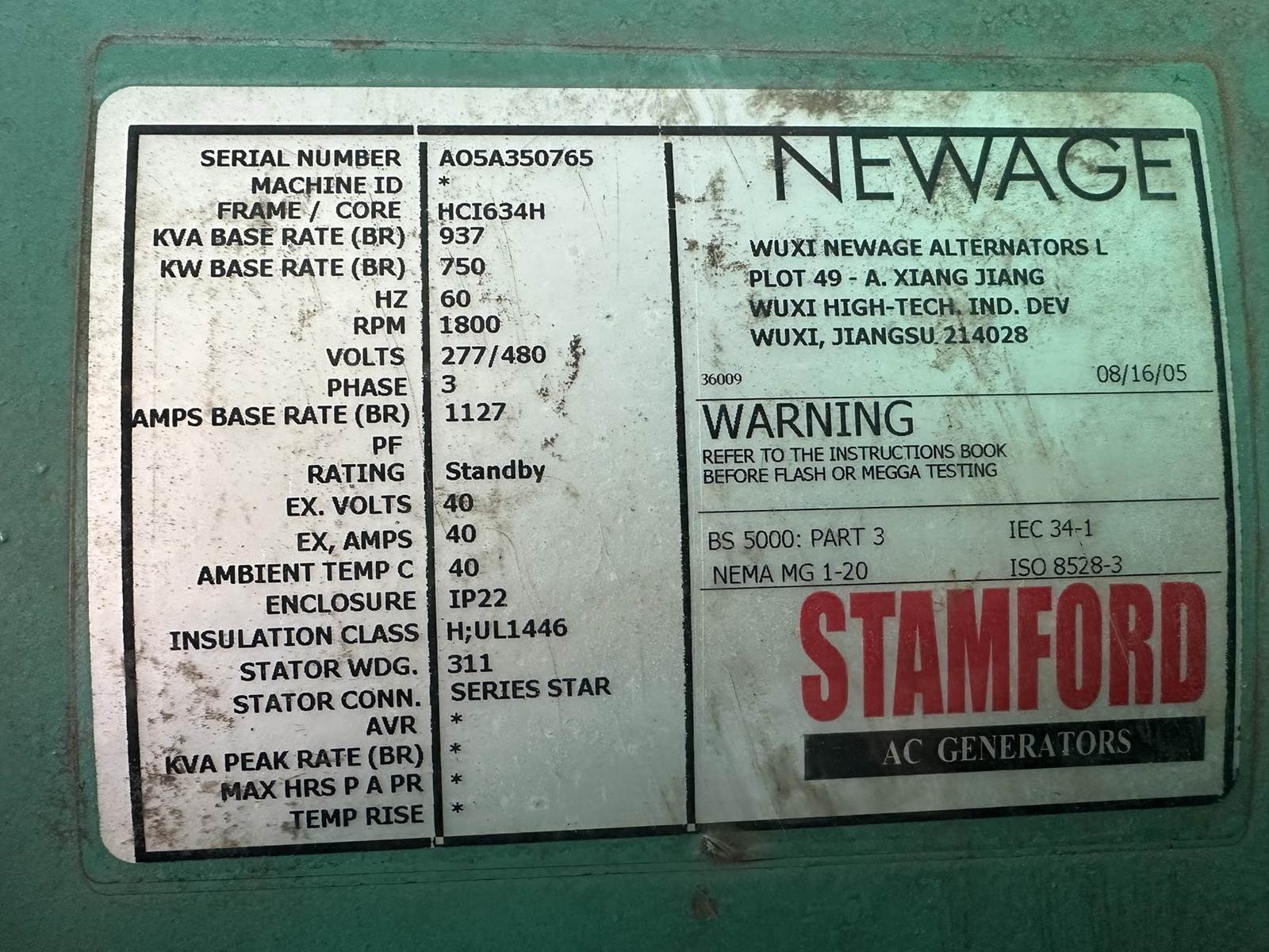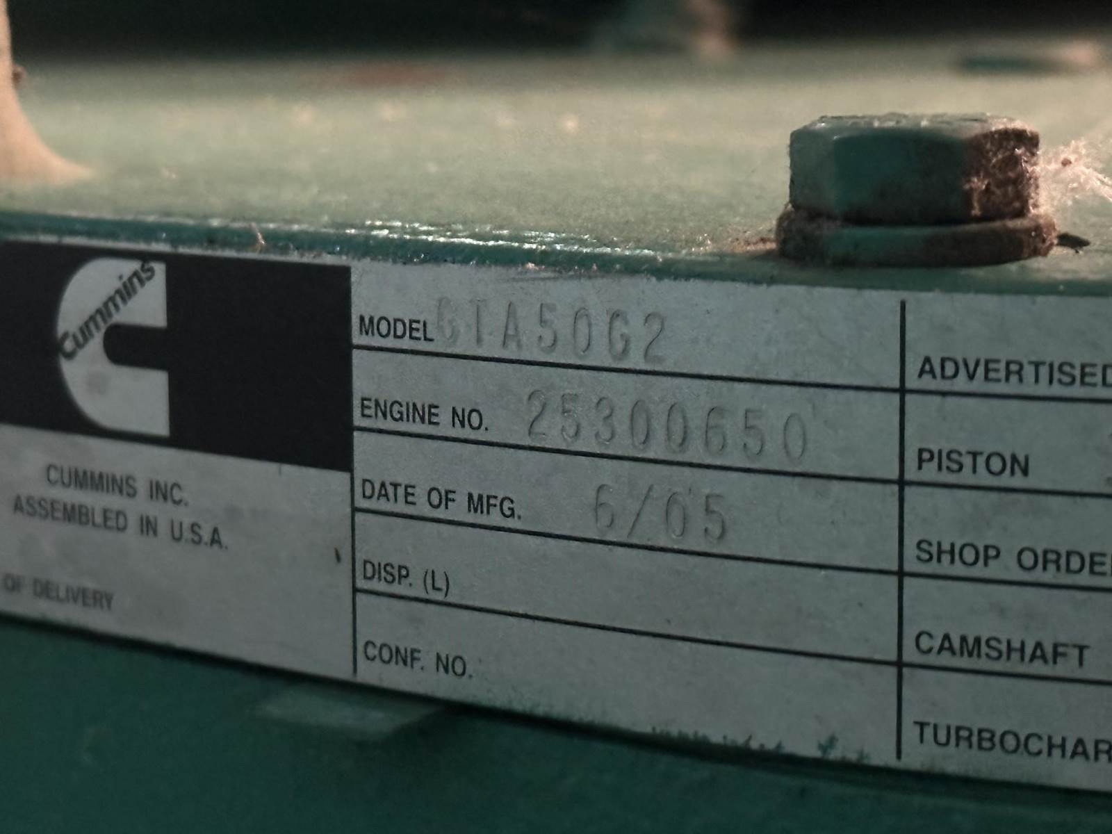 Cummins 750 kW standby natural gas generator set, model 750GFLB, SN-HA05A350765. Cummins GTA50-G2 engine rated 1220 HP at 1800 RPM, SN-25300650. 3/60/277/480V, 12 lead reconnectable to other voltages. 1200A Main-line circuit breaker. PowerCommand 2100 digital control panel. Battery charger. Coolant heater. Sound attenuated enclosure with critical grade silencer. 1433 Hrs, Yr 2005. Load test pending. Overall dimensions 102W x 356L x 132H, 40,000 lbs. FOB Waukesha, WI