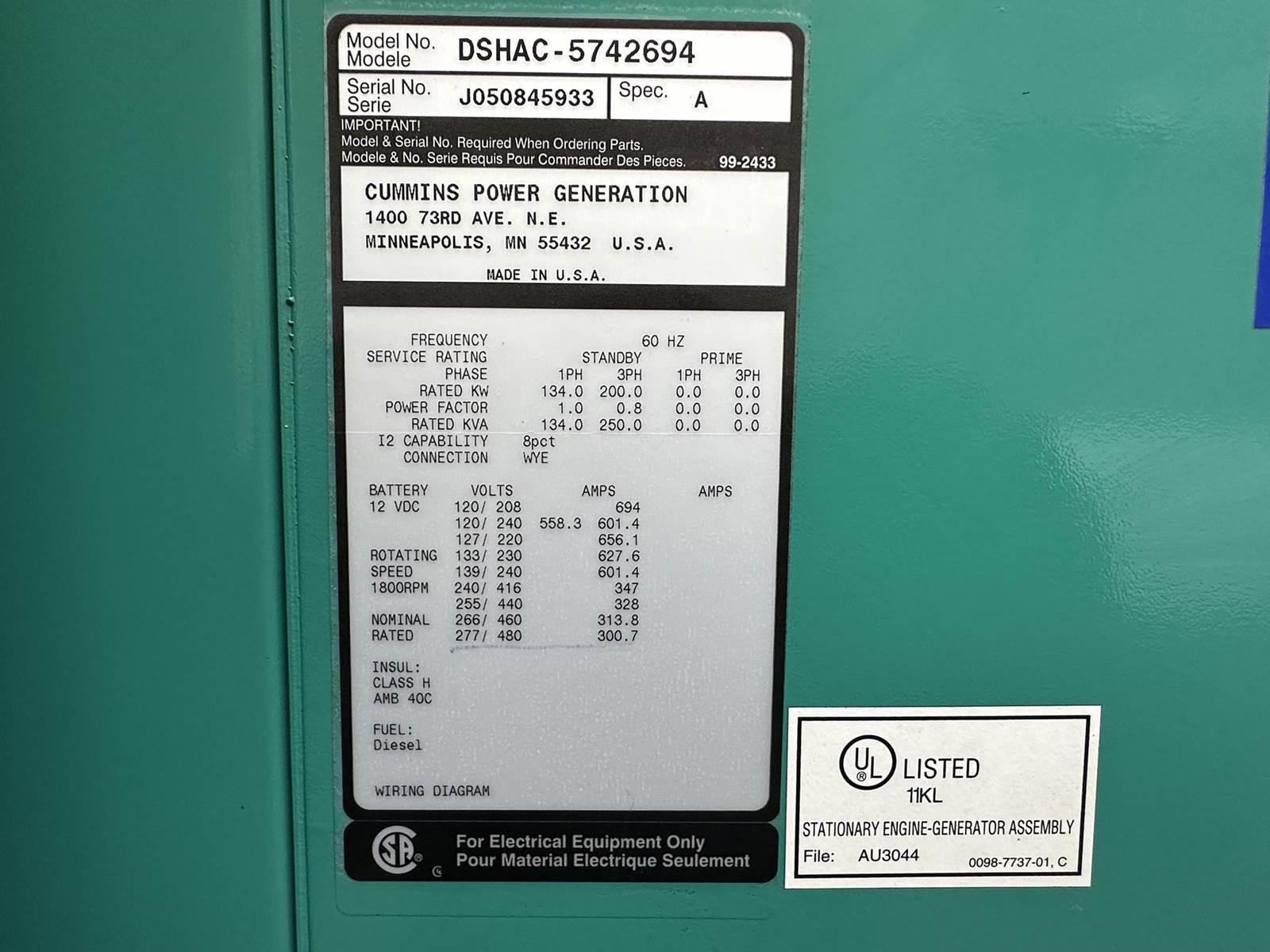 Cummins 200 kW standby (180 kW prime) diesel generator set model DSHAC, SN-J050845933. Cummins QSL9-G2 engine rated 364 HP at 1800 RPM, EPA Tier 3 emissions, SN-46525369. 3/60/277/480V, 12 lead reconnectable to other voltages. 600 Amp main-line circuit breakers. PMG permanent magnet generator. UL listed stationary engine-generator assembly. PowerCommand 2100 digital control panel. Engine cooling radiator rated 50C/122F ambient. UL 2200 listed stationary engine generator assembly. Seismic IBC2000, IBC2003, IBC2006, certified. Battery charger. Coolant heater. Sound attenuated enclosure. 366 gallon UL listed fuel tank with secondary containment. 347 Hrs. Year 2005. Load test pending. Overall dimensions 40W x 143L x 117H on 6H blocks, 6700 lbs. FOB Waukesha, WI