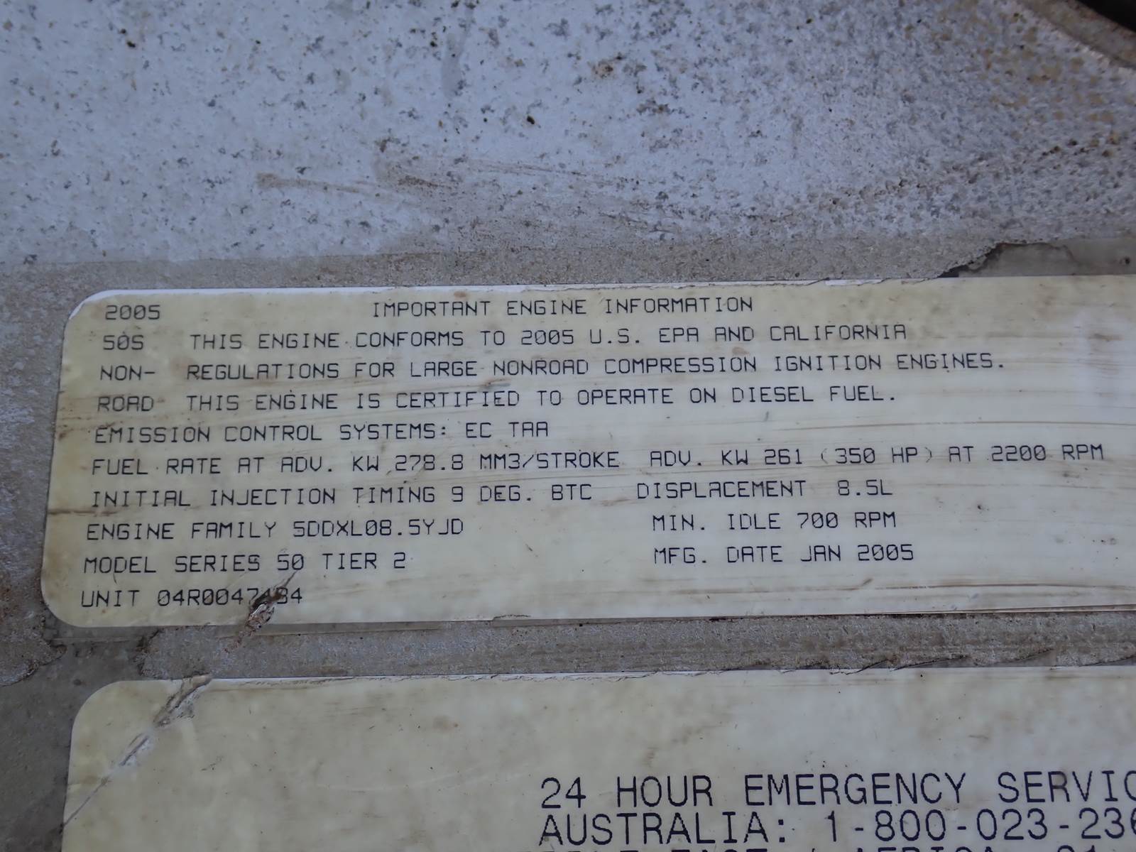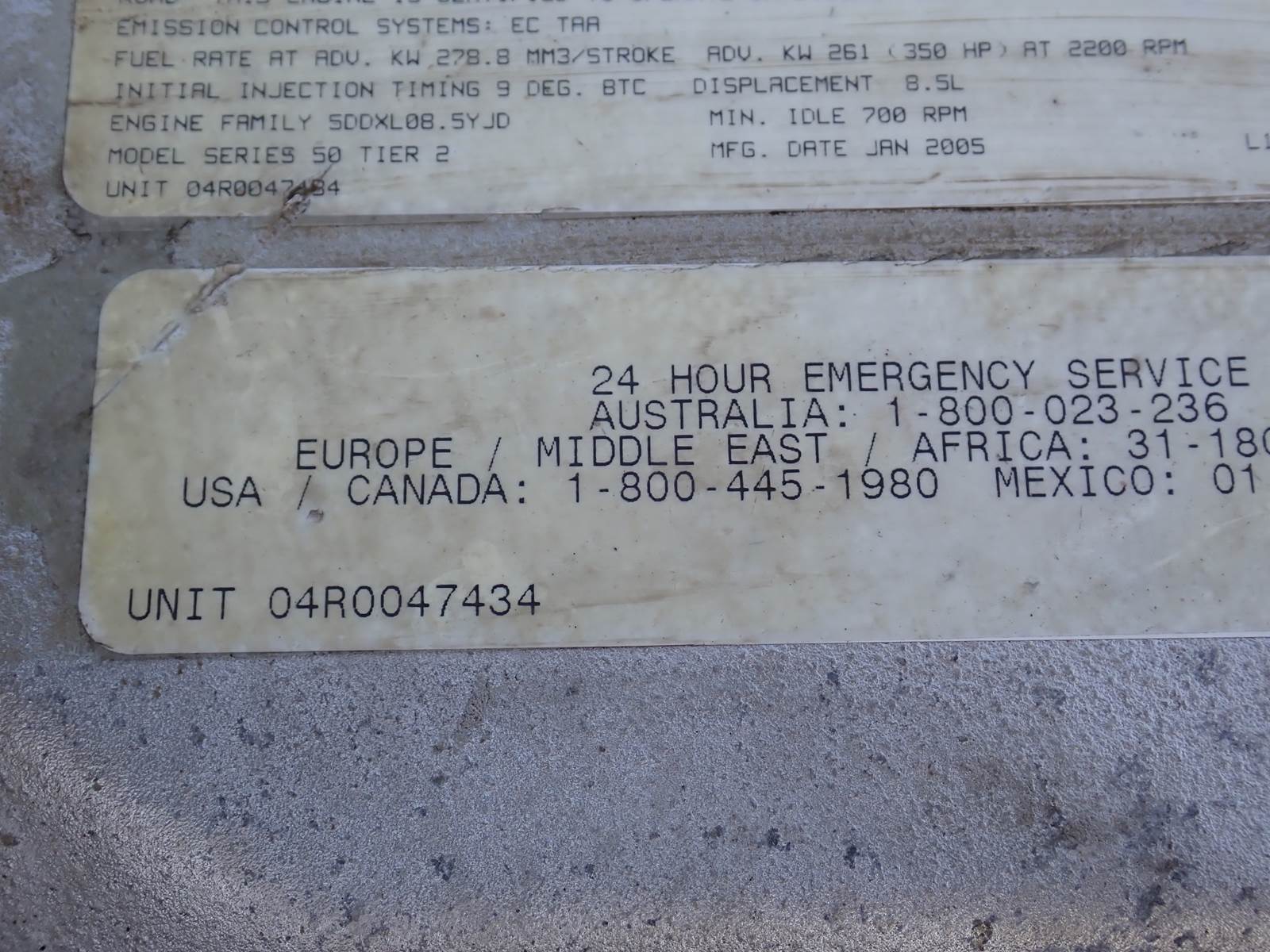 2005 Detroit Diesel 8.5 Liter Series 50 engine, 275 HP at 2100 RPM rating, NO EGR, model # 6054TK33, industrial applications, EPA family # 5DDXL08.5YJD, 6644 total original hours w/ 1826 idle. EXCELLENT RUNNER, SEE VIDEO. TEST RAN CLEAN, NO SMOKE OR BLOWBY OBSERVED DURING COLD TEST RUN. ENGINE HOLDS GOOD COLD OIL PRESSURE.