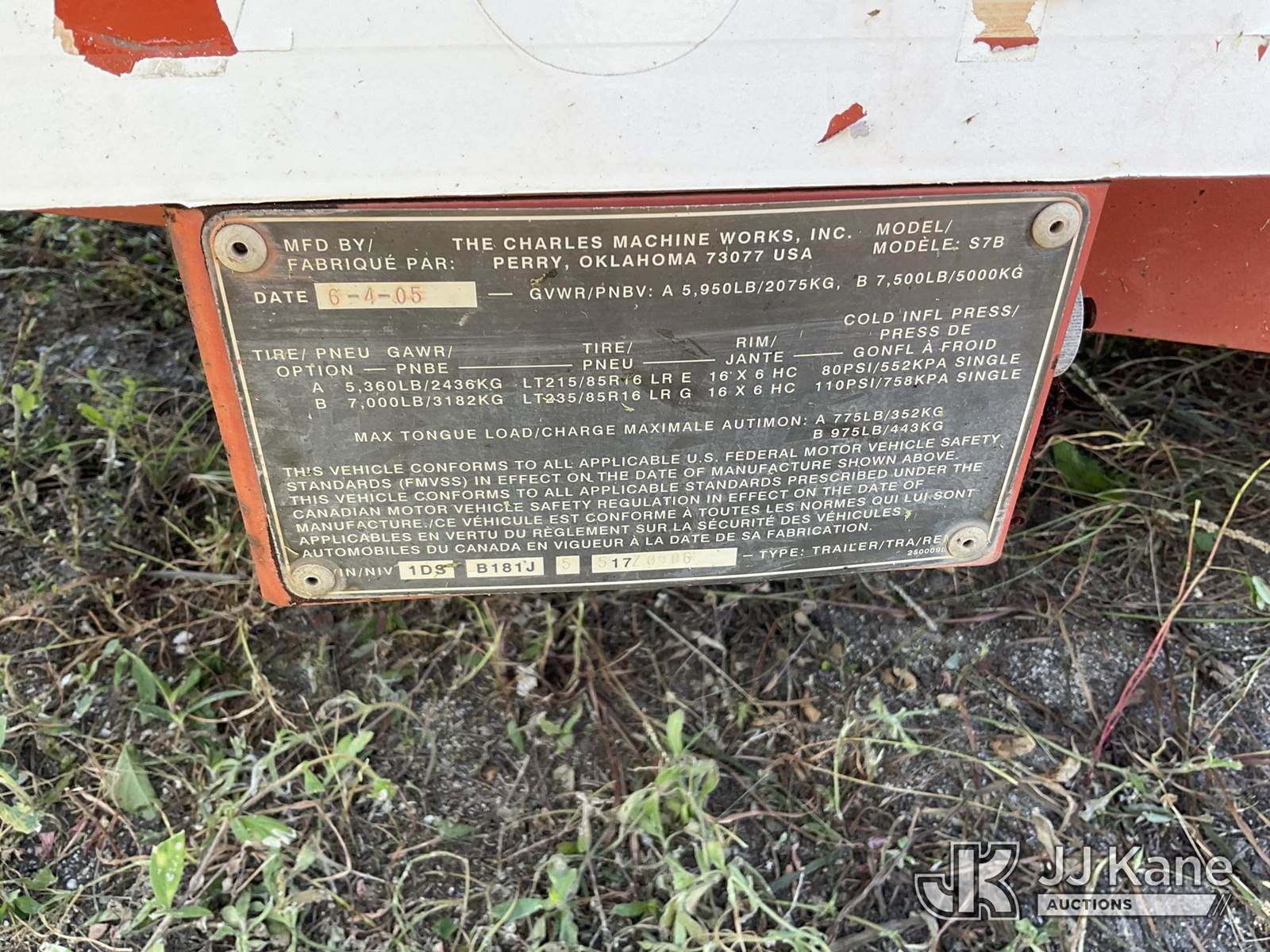 2005 Ditch Witch S7B S/A Tagalong Trailer, with 13 ft. tilt deck between wheels, (Moves)(Paint Damage, Body Damage, Rust) This is a Titled Item NOTE: This unit is being sold AS IS/WHERE IS via Timed Auction and is located in Thonotosassa, FL. For more information & removal arrangements please contact Office Staff @ 813-986-2485. (Buyer is responsible for removal. Assistance by consignor or JJ Kane Auctioneers is not assured.)