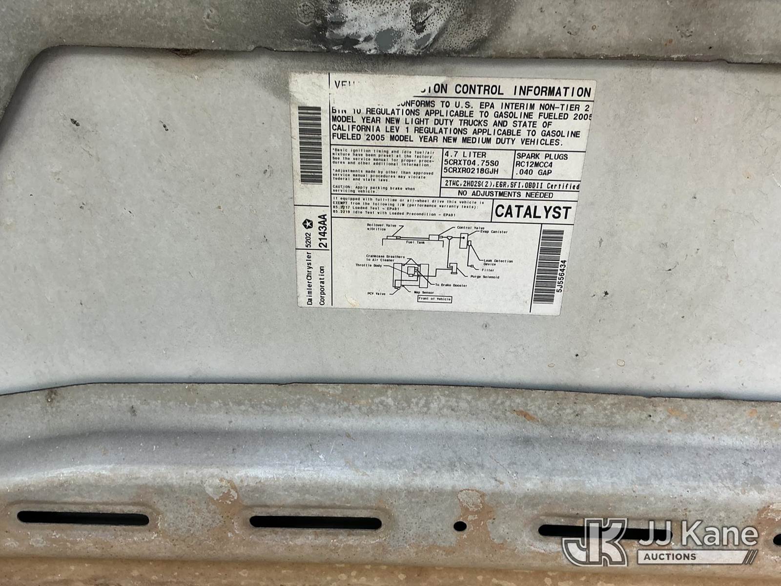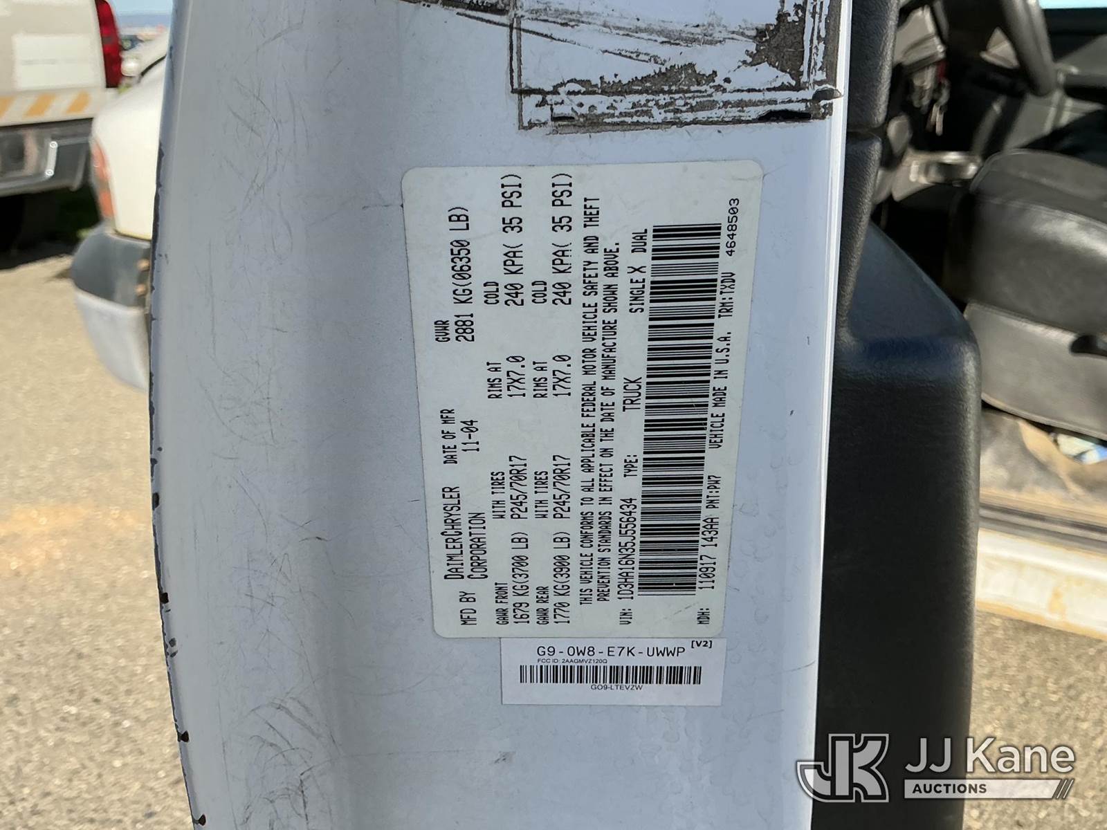2005 Dodge Ram 1500 Pickup Truck, s/n 1D3HA16N35J556434, 4.7L V8 SOHC 16V RWD, GAS, Auto, A/C, with ladder rack, (Exempt from Odometer Disclosure - Reads 123,757 miles) (Runs & Moves)(Hood Does Not Close Properly) This is a Titled Item NOTE: This unit is being sold AS IS/WHERE IS via Timed Auction and is located in Dixon, CA. Inspection & preview days for this unit are the 2 business days prior to the first day of items closing for this auction, item is located at 8668 Sparling Ln Dixon, CA 95620 and hours of operations are 8a-4p. For pre-sale questions, please contact JJ Kane Staff at (707) 678-8060 (dixon@jjkane.com). Dealer License Number 45696. (Buyer is responsible for removal. Assistance by consignor or JJ Kane Auctions is not assured.)