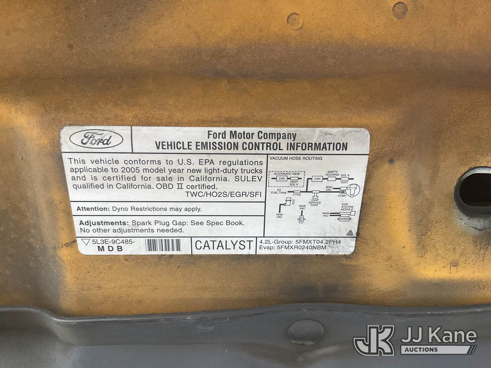 2005 Ford F-150 Pickup Truck, 4.2L V6 OHV 12V Auto, RWD, Gas, A/C, with tow package, True Mileage Unknown (Not Running, No Key, Conditions Unknown) (Passenger Window Broken, Missing Battery, Must Be Towed) (Bidding Restricted to Licensed Vehicle Dealers Only), This is a Titled Item NOTE: This unit is being sold AS IS/WHERE IS via Timed Auction and is located in Jurupa Valley, CA. Inspection & preview days for this unit are the 2 business days prior to the first day of items closing for this auction, item is located at 4510 Muth Way Jurupa Valley, CA 92509 and hours of operations are 8a-4p. For pre-sale questions, please contact please contact Office Staff @ (310) 353-7140. Dealer License Number 45696. (Buyer is responsible for removal. Assistance by consignor or JJ Kane Auctioneers is not assured.)