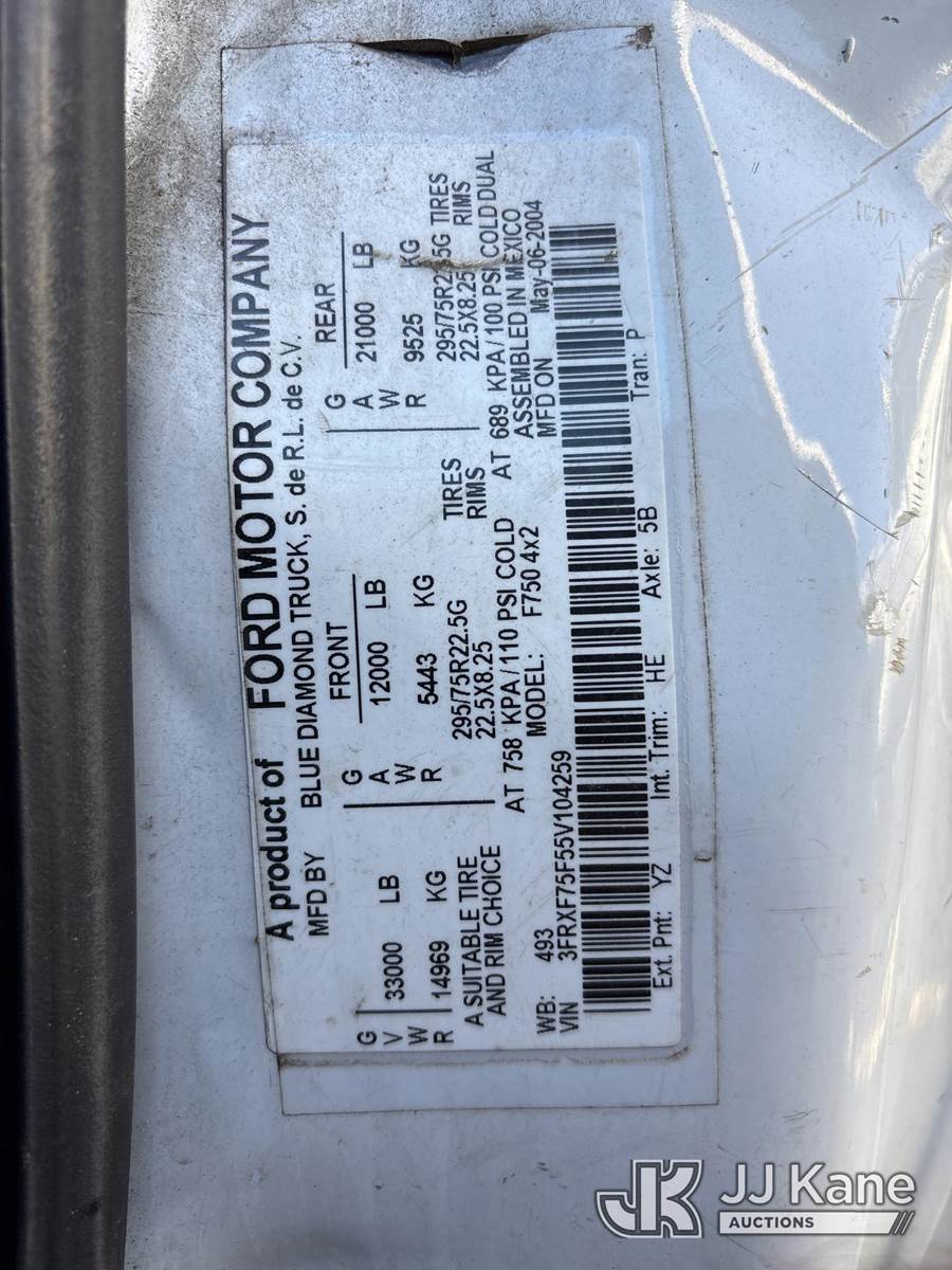 2005 Ford F750 Chipper Dump Truck, 5.9L 7-spd, diesel, with 16 ft Dump Body, (Exempt from Odometer Disclosure - Reads 933,477 miles) (Not Running, Condition Unknown, Dump Operation Unknown, Seller States: FUEL INJECTION PUMP, INJECTORS, REPLACE COMPUTER SYSTEM, Body & Rust Damage, Must Tow) (Removal is by Appointment Only, Buyer MUST make a appointment prior to picking up, Buyer/Transporter Must have PAID IN FULL RELEASE. No onsite assistance available, Please Come prepared.) This is a Titled Item NOTE: This unit is being sold AS IS/WHERE IS via Timed Auction and is located in Bellport, NY. Inspection & preview days for this unit are by appointment only; please contact us at contact@jjkane.com or 84-Go-JJKane for more details. (Buyer is responsible for removal. Assistance by consignor or JJ Kane Auctioneers is not assured.)