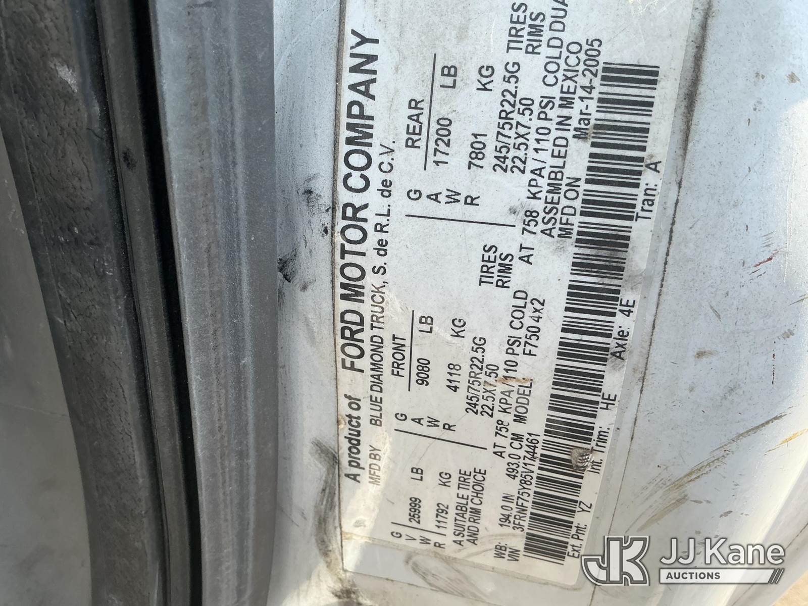 2005 Ford F750 T/A Cab & Chassis, 6.0L V8 DIESEL 4X2, Auto, A/C, (Exempt from Odometer Disclosure - Reads 137,562 miles) (Runs & Moves)(FL Residents Purchasing Titled Items – tax, title & registration fees will be collected at the maximum rate of $400.00 under 25,999 and $800.00 for Over 26,000 and $250.00 trailers – Proof of insurance is mandatory; Out of State Residents Purchasing Title Items – tax will be collected based upon your state rate.) This is a Titled Item NOTE: This unit is being sold AS IS/WHERE IS via Timed Auction and is located in Thonotosassa, FL. Inspection & preview days for this unit are the 2 business days prior to the first day of items closing for this auction, item is located at 11720 N US 301 Thonotosassa, Fl 33592 and hours of operations are 8a-4p. For pre-sale questions, please contact Office Staff @ (813) 986-2485. (Buyer is responsible for removal. Assistance by consignor or JJ Kane Auctions is not assured.)