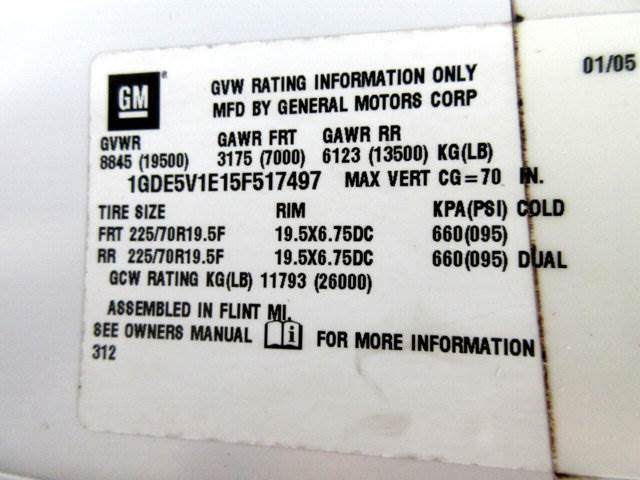 SHUTTLE BUS -(Includes C60 air conditioning UZA roof marker delete N12 rear exit exhaust system UEA tail lamp delete provisions for rear heat on driver side provisions for 100 amp service on driver side battery located under driver door.) aft axle fuel tank with dual auxiliary fuel ports and driver side/passenger side fill capability APL passenger seat delete WE7 passenger door delete). (Frames: With GZG or GZJ GVWRs includes a 6 mm 50 000 psi (344 750 kPa) yield strength steel frame RBM: 381 500 Section Modulus 7.63. With GW2 or GW4 GVWR Sales packages includes a 80 000 psi (551 600 kPa) yield strength steel frame RBM: 824 800 Section Modulus 10.31)