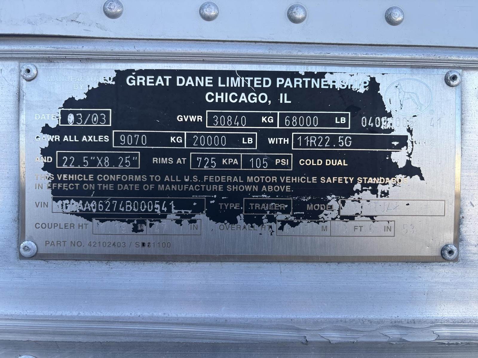 2003 53’ GREAT DANE SWING DOOR DRY VAN DV-4155, 53’ X 102” X 13’6”, 36” KING PIN, TANDEM AIR RIDE SLIDER, 295/22.5 TIRES, STEEL WHEELS,...