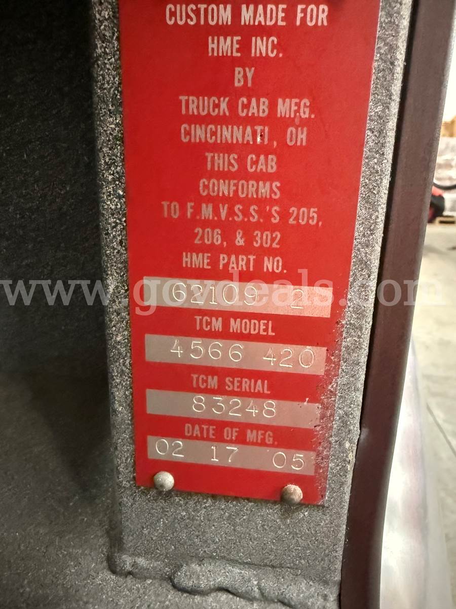 Description: 2005 Ferrara HME Pumper Fire Truck - Pumper Apparatus Condition: Starts and operable as of last use. Removed from service 2/6/2026 Engine is Cummins ISL- 400, Diesel. Maintained every 7,500 Miles. Engine is operable but oil leaks. Transmission is Allison 3000 EUS, automatic and operable. Pump Manufacturer: Hale. Model: QMAX. GPM: 1500 Tank size: 500 gallons. 2 intakes Exterior: Color- Red & White. Chassis - Black. Minor dents, scratches, and dings to body. Interior: Grey Vinyl, rips in seats and cracked dash due to regular use of vehicle. Additional features: emergency lights, 6 seats in cab, no ladders, fee con foam system. Interior equipment: air pack brackets in 5 seats, kussmaul charger.
