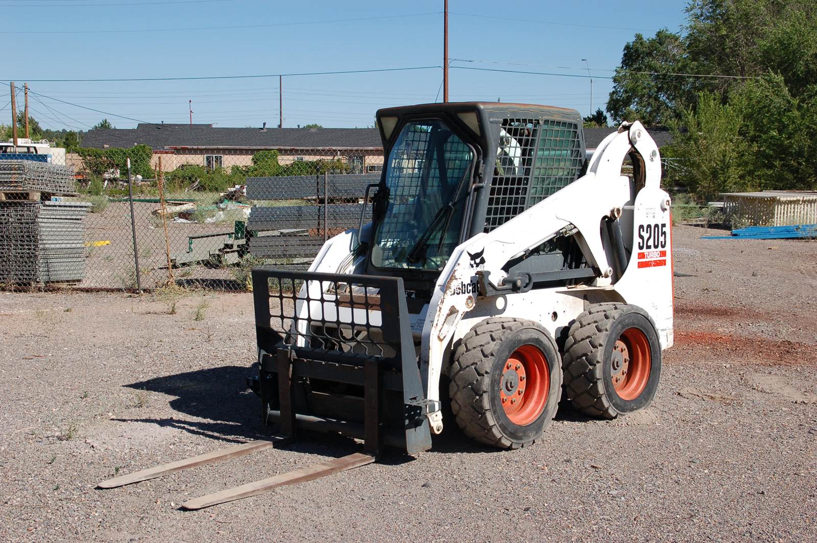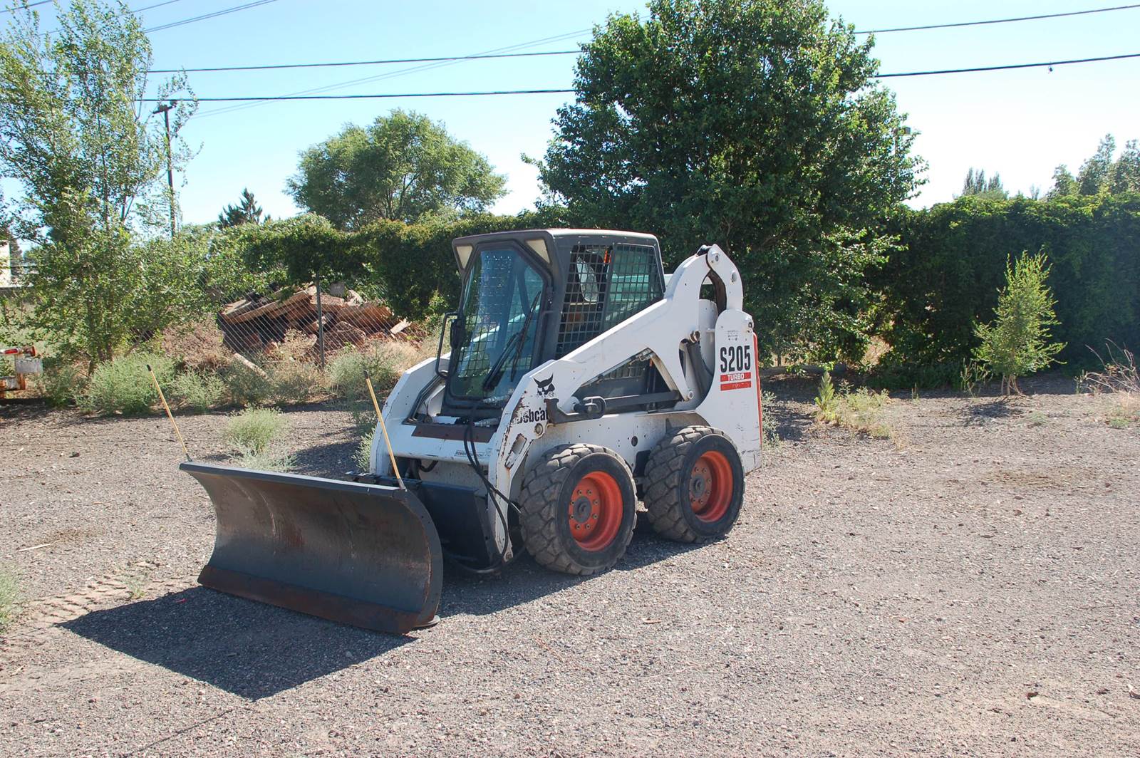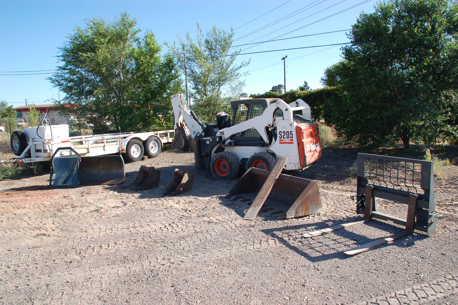 2005 Bobcat skid steer loader with four attachments and trailer.(1) Backhoe 709 with stabilizers and 12" ,16", and 24" buckets. (2) Material bucket 72" with rip teeth and grading blade. (3) Snow plow 72" and (4) forklift. Power attachment system and enclosed cab with heat. Also includes 2005 (18') Trailmaster trailer with 12,000 pound load capacity. Also includes mounted Weatherguard tool box and fuel tank.