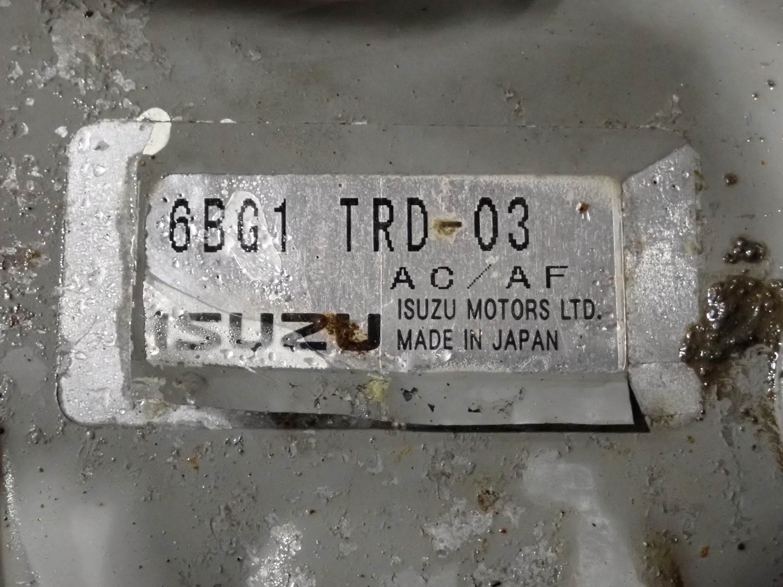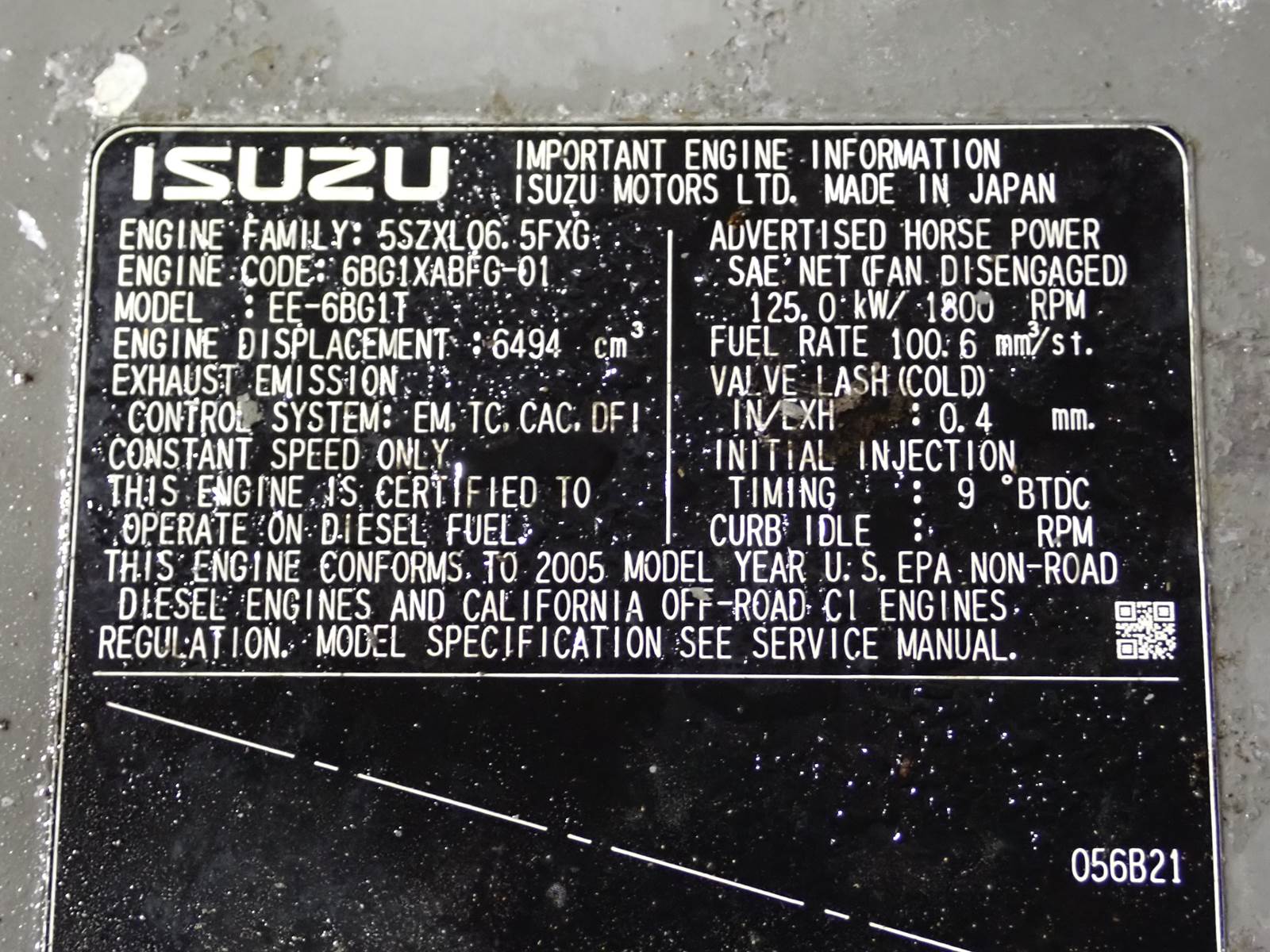 2005 Isuzu 6BG1TRD-03 diesel engine, turbocharged, air to air intercooled, mechanical fuel system, EPA family # 5SZXL06.5FXG, 167 HP at 1800 RPM rating, engine code 6BG1ZABFG-01, complete as pictured. TEST RAN CLEAN, SEE VIDEO. GOOD RUNNING ENGINE, NO SMOKE OR BLOWBY OBSERVED DURING COLD TEST RUN, GOOD OIL PRESSURE, HARD TO FIND ENGINE !!