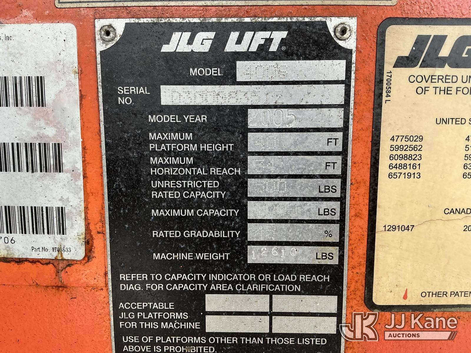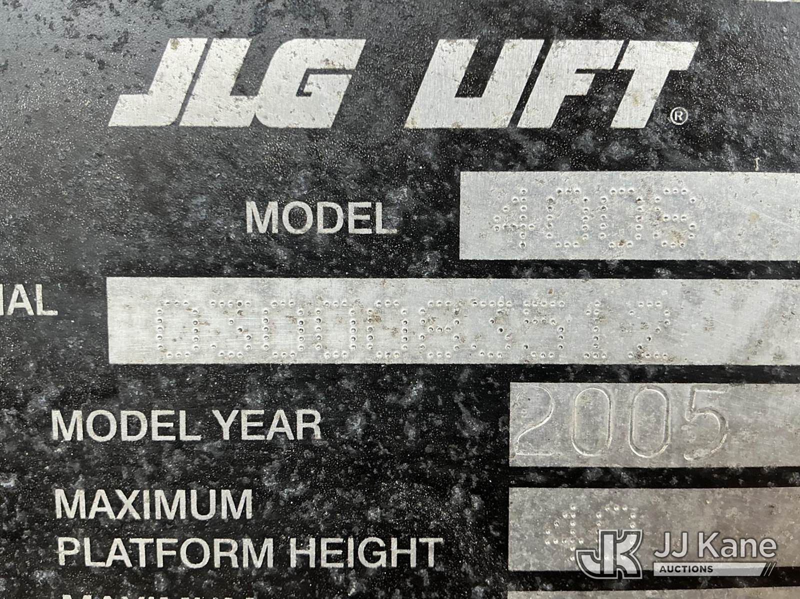 2005 JLG 400S Self-Propelled Telescopic Manlift, s/n 0300083512, Deutz diesel, Hydraulic Driven, with 40 ft. max platform height, (Runs, Moves & Operates) (Reads 3,503 hours) NOTE: This unit is being sold AS IS/WHERE IS via Timed Auction and is located in Shrewsbury, MA. Inspection & preview days for this unit are the 2 business days prior to the first day of items closing for this auction, item is located at 11 Fortune Blvd Shrewsbury, MA 01545 and hours of operations are 8a-4p. For pre-sale questions, please contact Rob Gifford @ (508) 864-4126. (Buyer is responsible for removal. Assistance by consignor or JJ Kane Auctions is not assured.)