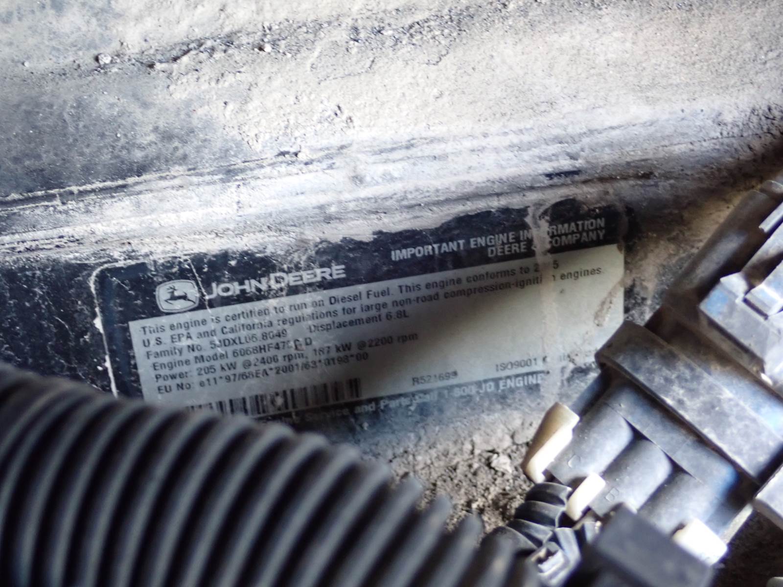 2005 John Deere 6068HF475 diesel engine, turbocharged, air to air intercooled, common rail fuel system, 24 valve cylinder head, 275 HP at 2200 RPM rating, complete power unit as pictured. CORE ONLY, NON RUNNING ENGINE FOR PARTS OR REBUILD.