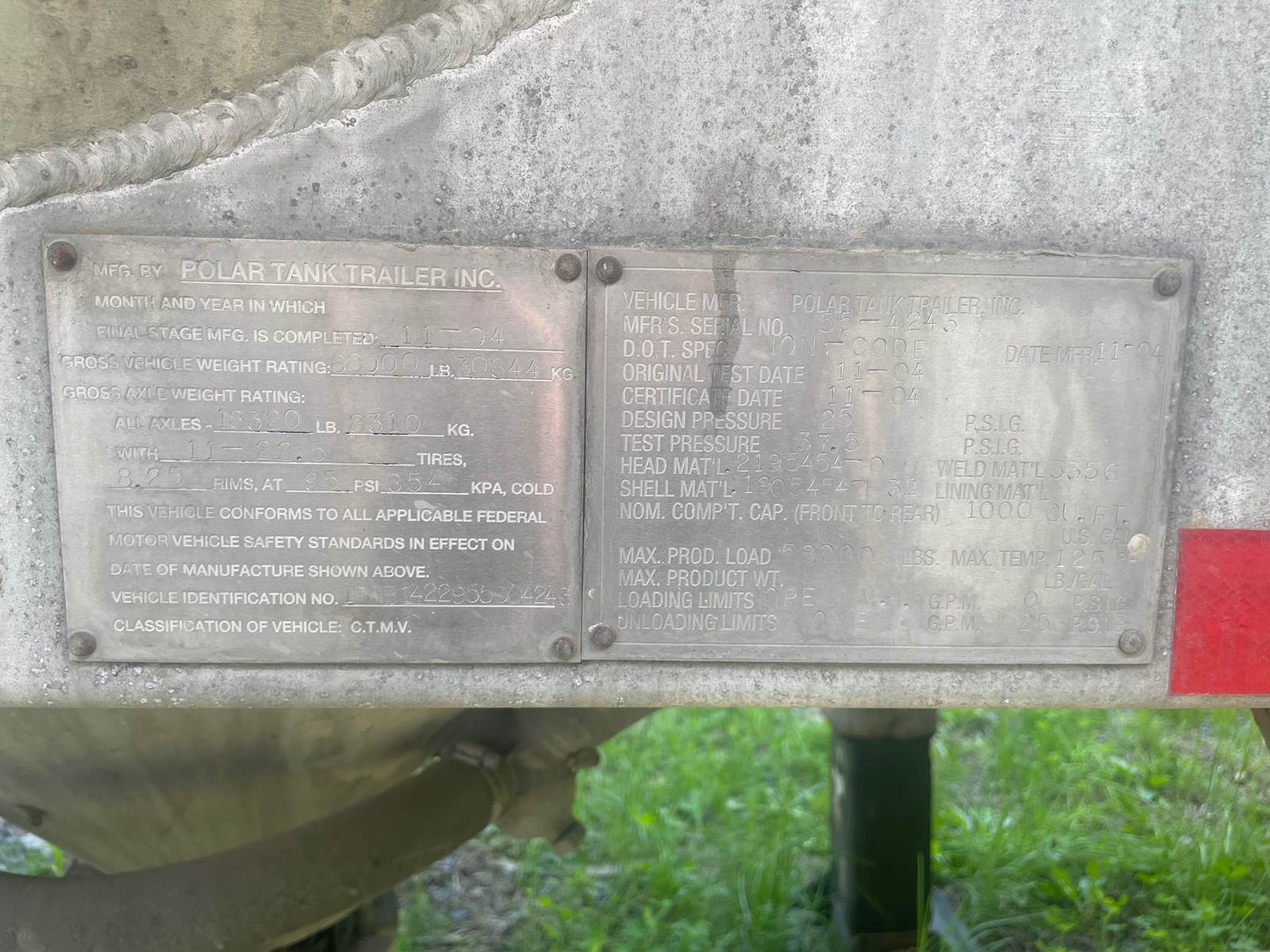 2002 Polar Bulk Tanker- 1,000 Cu FT Capacity, GVWR- 68,000 LBS., 20K Each Axle Capacity, 44'X102". #4000. CALL FOR MORE INFO!!