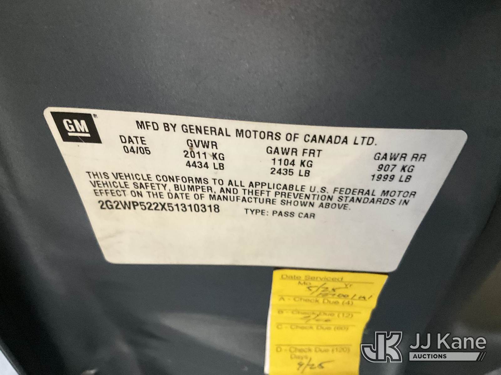2005 Pontiac Grand Prix Base 4-Door Sedan, s/n 2G2WP522X51310318, 3.8L V6 OHV 12V FWD, GAS, 4-Speed Automatic, A/C, (Exempt from Odometer Disclosure - Reads 129,485 miles) (Runs & Moves, Check Engine Light on) (Bidding Restricted to Licensed Vehicle Dealers Only), This is a Titled Item NOTE: This unit is being sold AS IS/WHERE IS via Timed Auction and is located in Jurupa Valley, CA. Inspection & preview days for this unit are the 2 business days prior to the first day of items closing for this auction, item is located at 4510 Muth Way Jurupa Valley, CA 92509 and hours of operations are 8a-4p. For pre-sale questions, please contact please contact Office Staff @ (310) 353-7140. Dealer License Number 45696. (Buyer is responsible for removal. Assistance by consignor or JJ Kane Auctions is not assured.)
