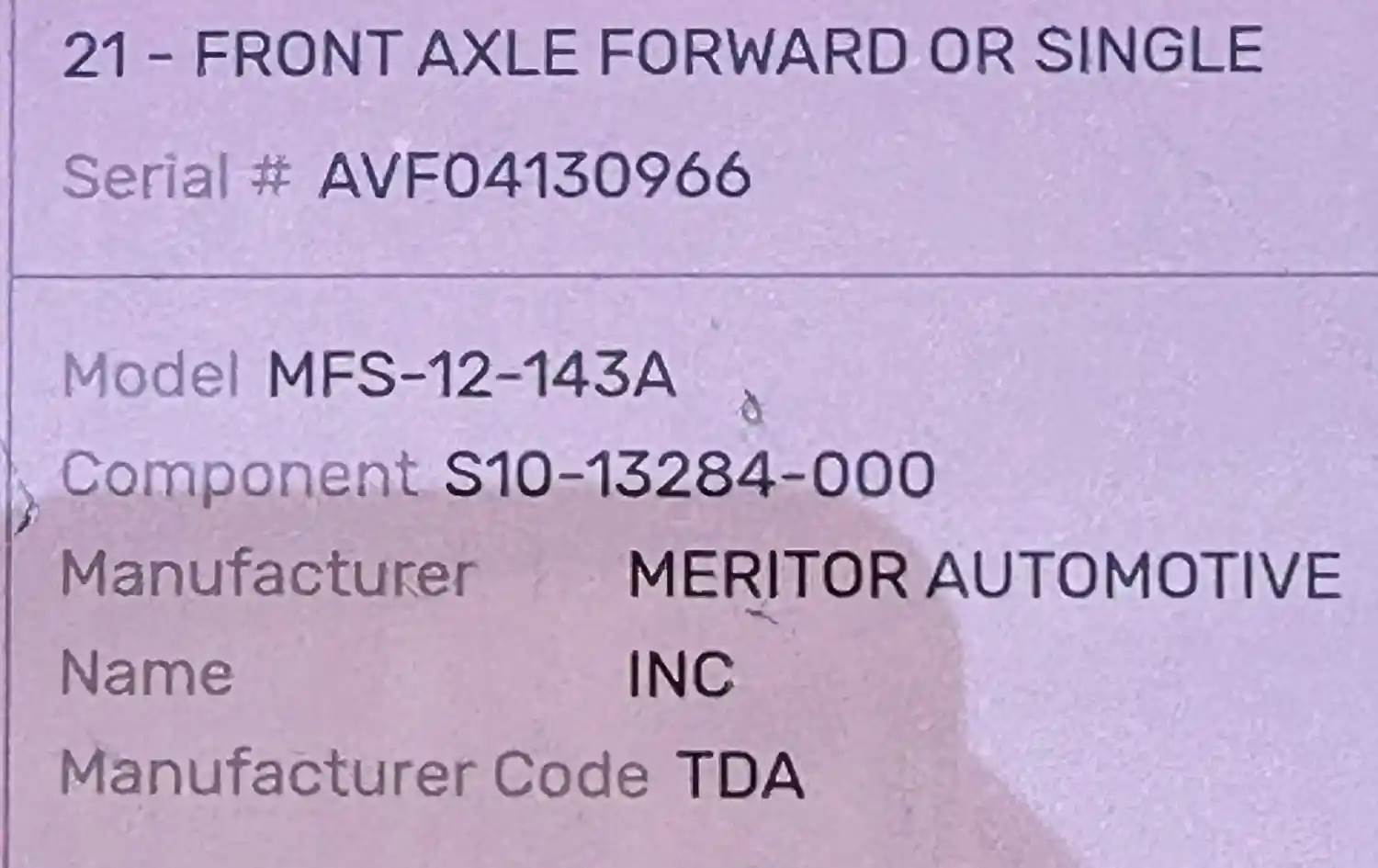 (Used) 2005 Sterling A9500, COMPLETE FRONT AXLE- Part Number: MFS12143ANN115, Serial Number: AVF04130966, Center Leaf to Center Leaf: 33", Make: Meritor/Rockwell, Model: MFS-12-143A, Capacity: 12,000 Lbs, Hub Bolts: 10, Brake Type: Air Drum, For more information about this item, give us a call. We ship Worldwide! (CRG HEAVY TRUCK PARTS) 929 W PULASKI HWY, ELKTON, MD 21921, Capacity: 12,000 Lbs, Serial#: AVF04130966, Hub Bolts: 10”, Axle Make: Meritor/Rockwell