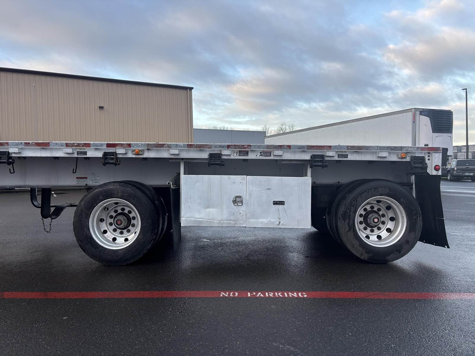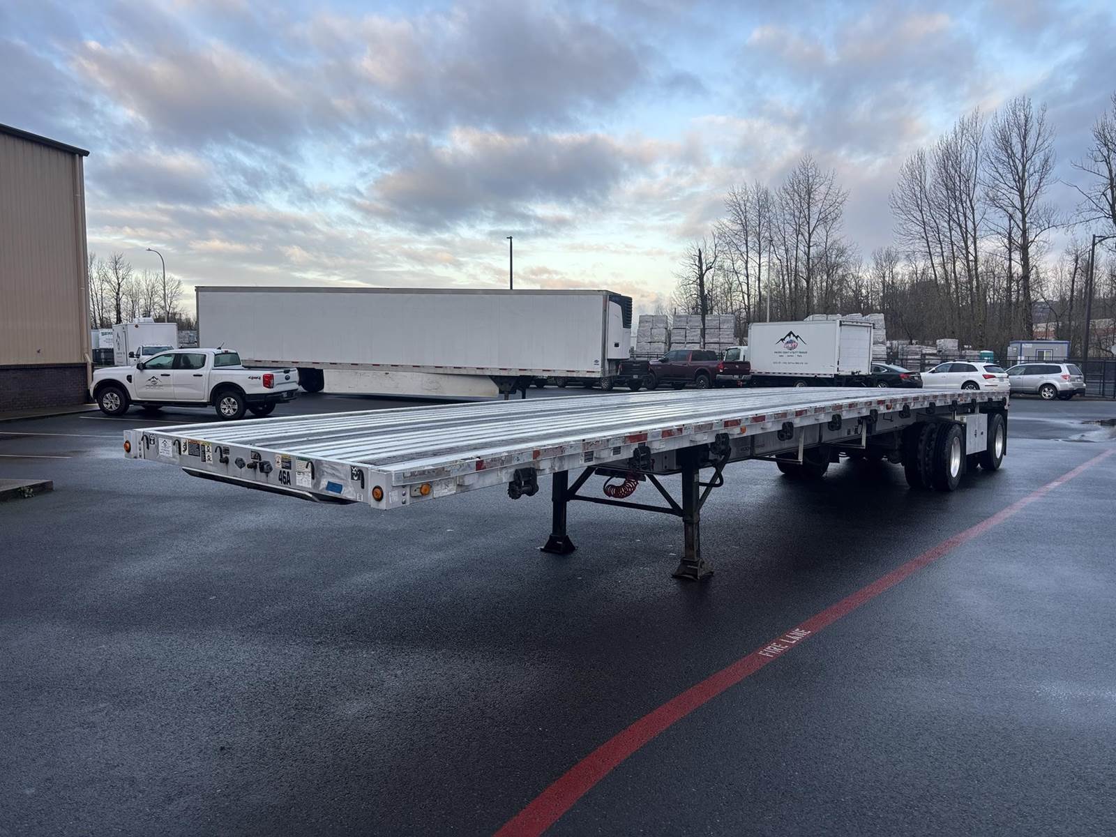 48’ X 96” ALL ALUMINUM FLATBED, 32” KING PIN, TANDEM AIR RIDE FIXED SPREAD, 10’2 SPREAD, 295/22.5 TIRES, ALUMINUM WHEELS, NEW AXLES WITH...
