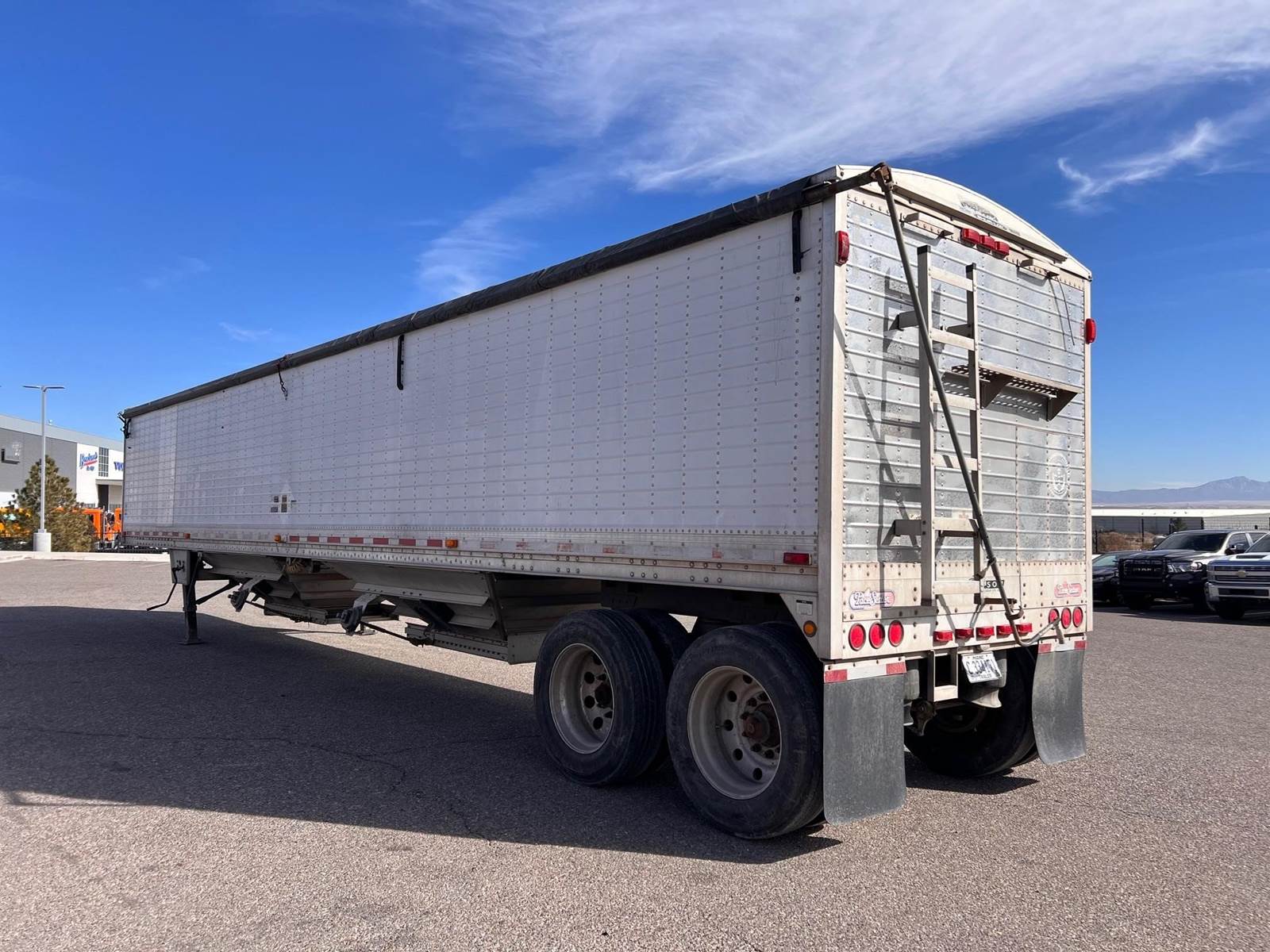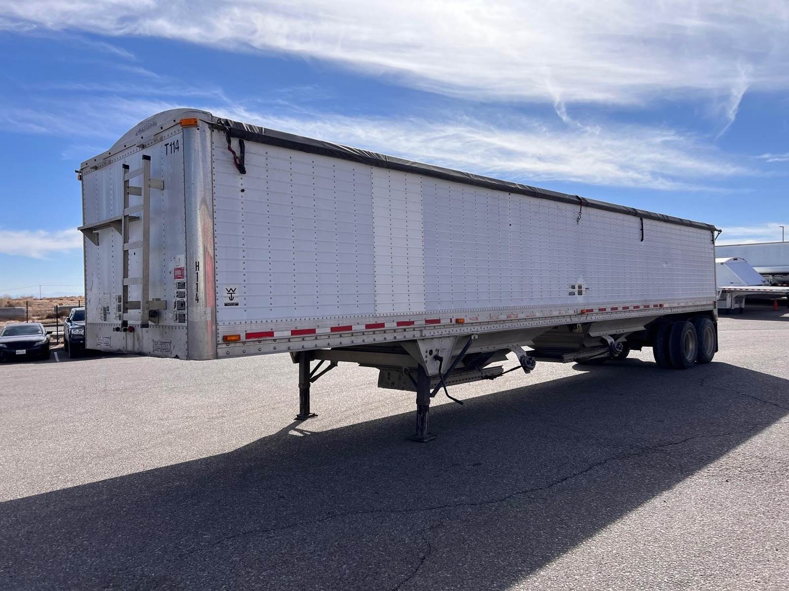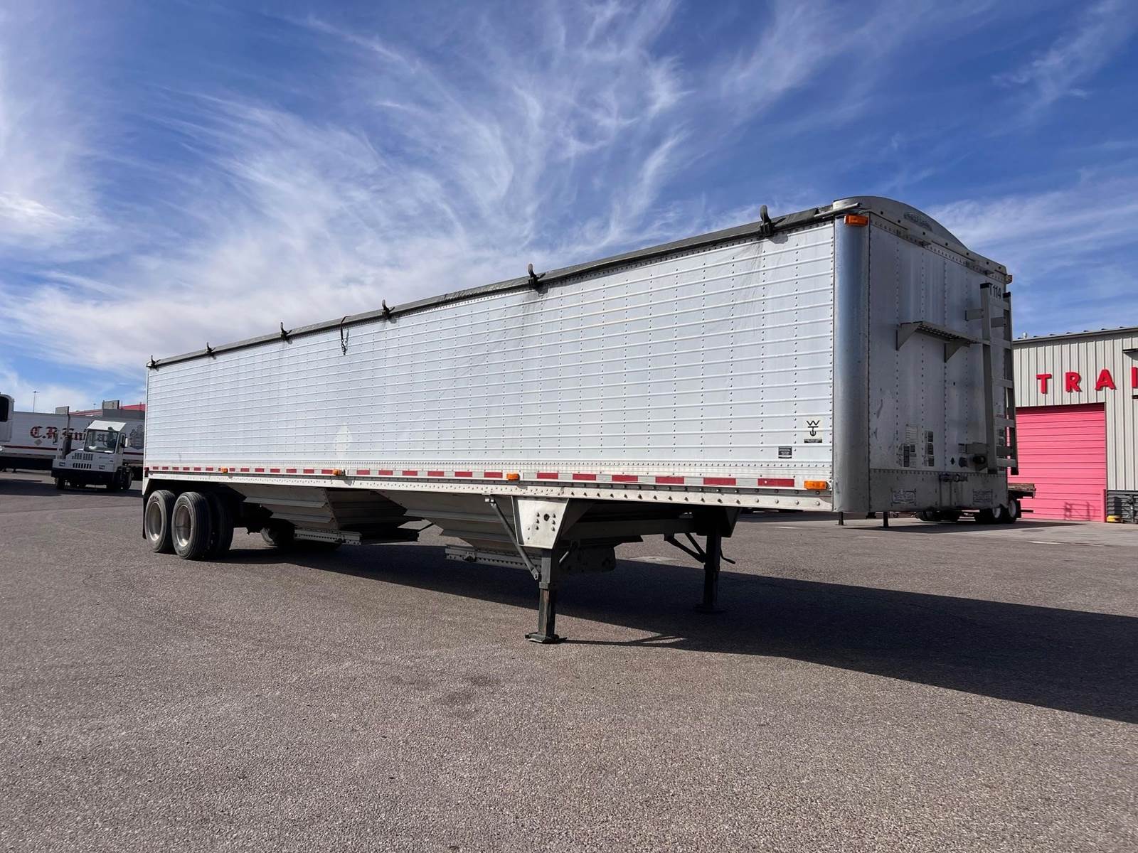 2005 Wilson Pacesetter Grain Trailer, 43' x 102", SST Front Corners, Corrugated Panels, 66" Sides, 2 Hoppers, Manual Rollover Tarp, Front and Rear Ladder w Catwalk, Closed Tandem, Air Ride, Outside Aluminum Wheels, Inside Steel Wheels, Full Rear SST Panel.