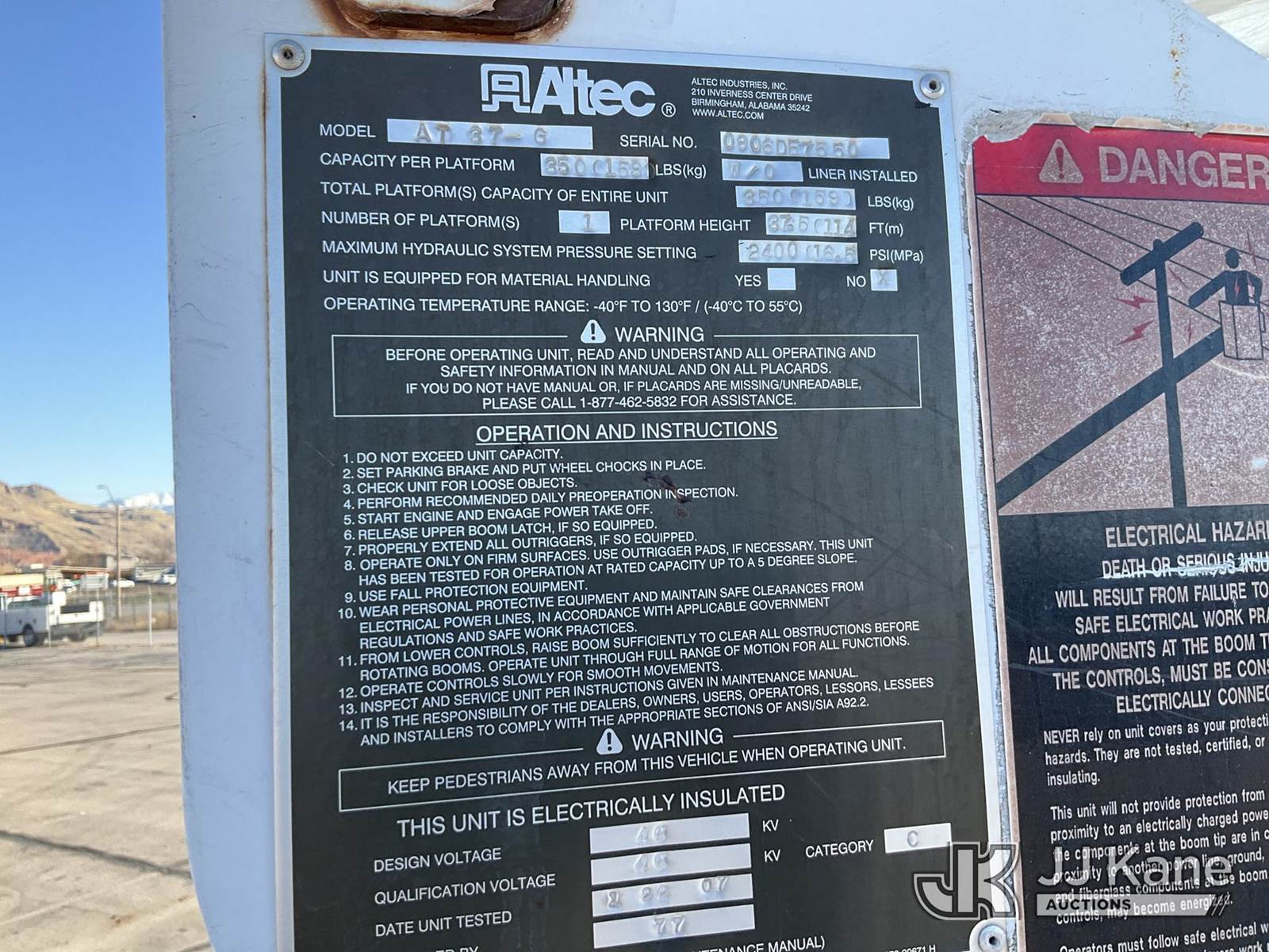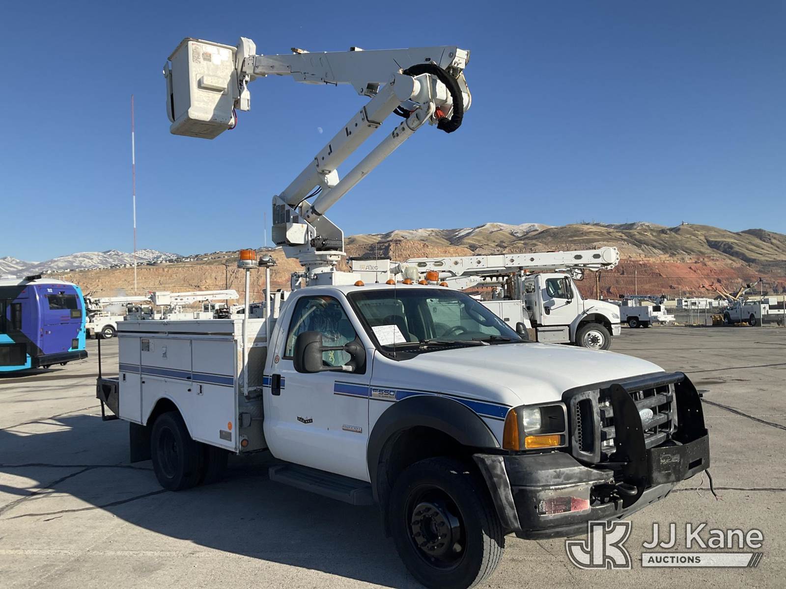 Altec AT37G, 42 ft, Articulating & Telescopic Bucket s/n 0906DE7550, with Single-Man Bucket, mounted behind cab on 2006 Ford F550 4x4 Service Truck, 6.0L Auto, diesel, A/C, (275,076 miles) (Runs, Moves & Upper Operates) This is a Titled Item NOTE: This unit is being sold AS IS/WHERE IS via Timed Auction and is located in Salt Lake City, UT. Inspection & preview days for this unit are the 2 business days prior to the first day of items closing for this auction, item is located at 2353 N Redwood Rd Salt Lake City, UT 84116 and hours of operations are 8a-4p. Titles executed exactly as bidder registered. Ensure your name and/or business name and address in JJ Kane and/or ProxiBid is correct before bidding. For more information & removal arrangements please contact office staff @ (801) 519-0123. (Missing manuals, See Auction Company for Manufacturers Information to obtain manuals) (Buyer is responsible for removal. Assistance by consignor or JJ Kane Auctions is not assured.)