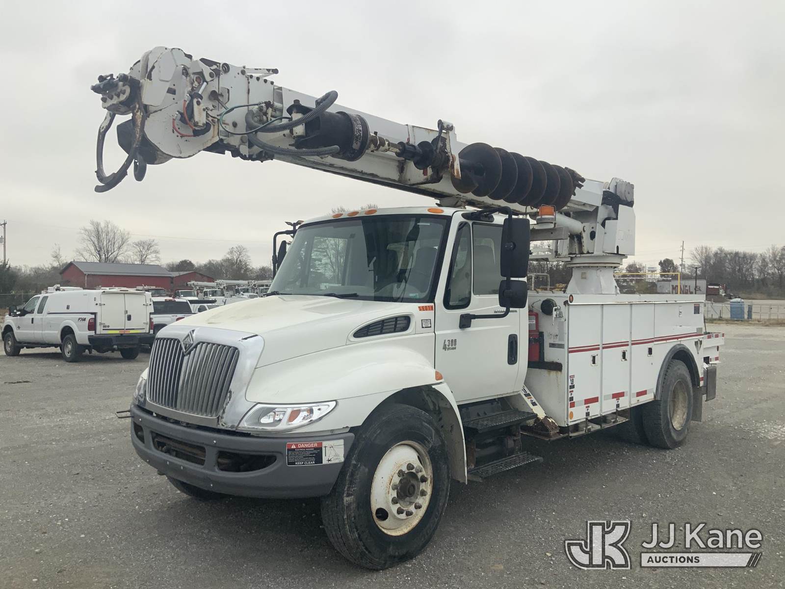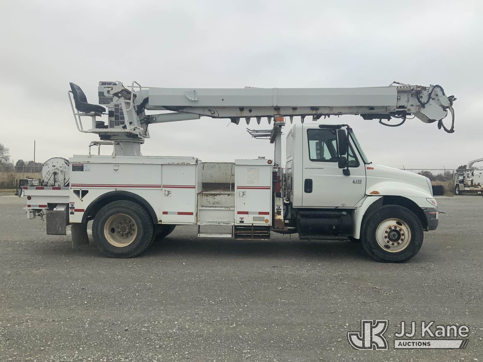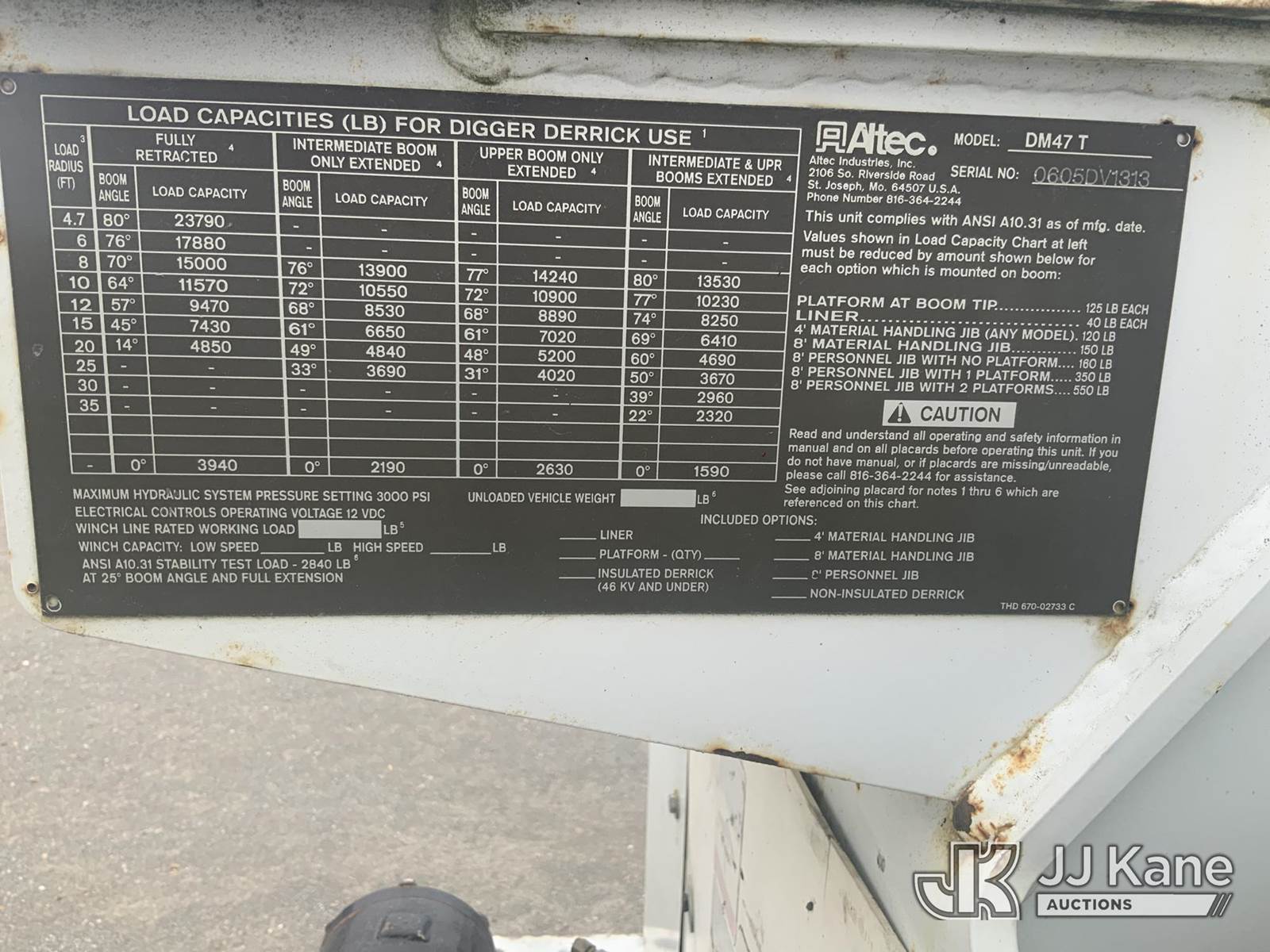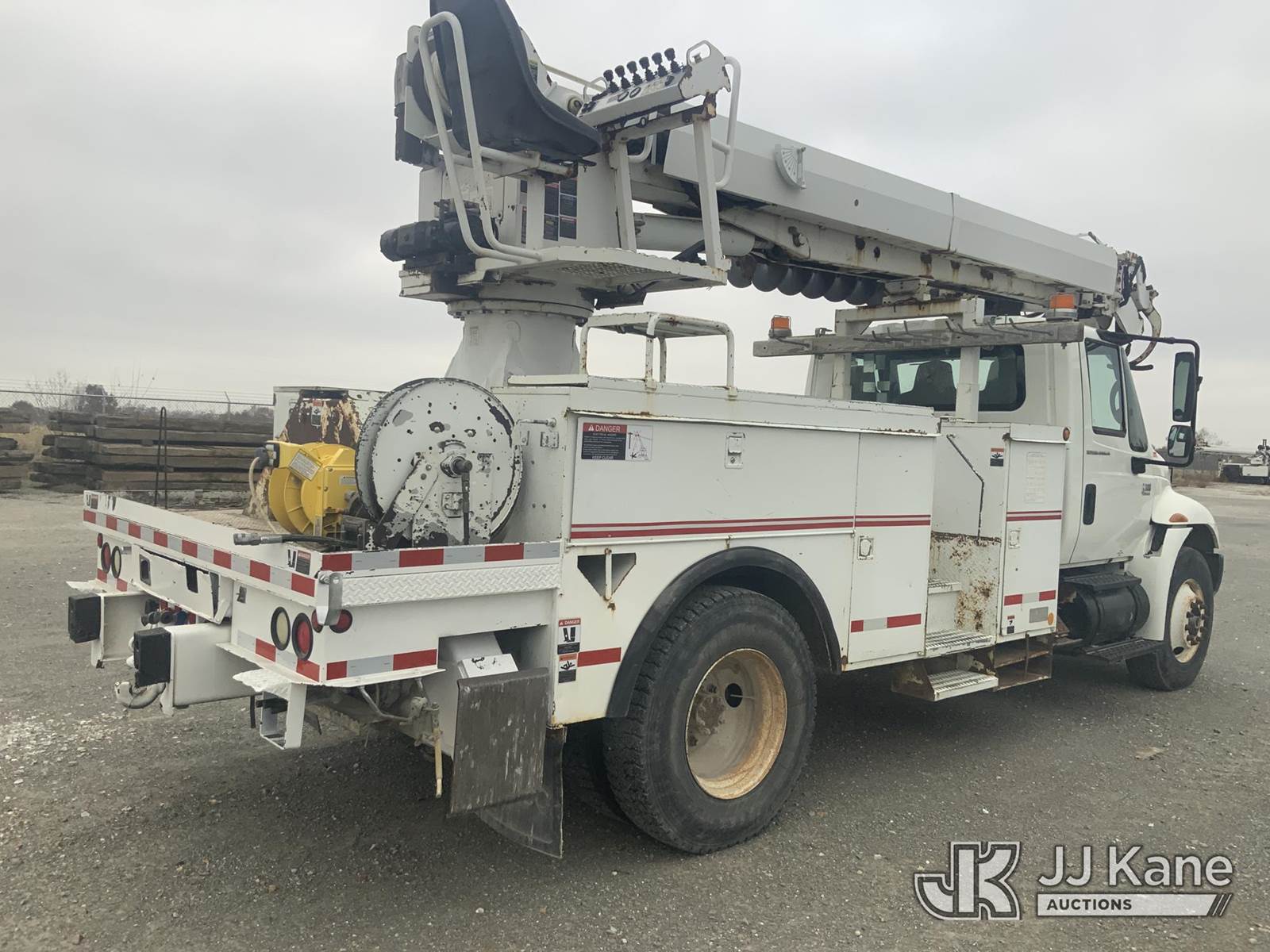 Altec DM47-T, 23,790 Lb Digger Derrick s/n 0605DV1313, with 47ft sheave height, 2spd digger, pole guides, heel winch & riding console, rear mounted on 2006 International 4300 Utility Truck, 7.6L Auto, 4X2, diesel, A/C, (125,770 miles) (Runs, Moves & Upper Operates) (Body Damage) This is a Titled Item NOTE: This unit is being sold AS IS/WHERE IS via Timed Auction and is located in Hawk Point, MO. Inspection & preview days for this unit are the 2 business days prior to the first day of items closing for this auction, item is located at 25 State Highway A Hawk Point, MO 63349 and hours of operations are 8a-4p. For pre-sale questions, please contact Adam Stanek at (636) 295-1594. (Missing manuals, See Auction Company for Manufacturers Information to obtain manuals) (Buyer is responsible for removal. Assistance by consignor or JJ Kane Auctioneers is not assured.)