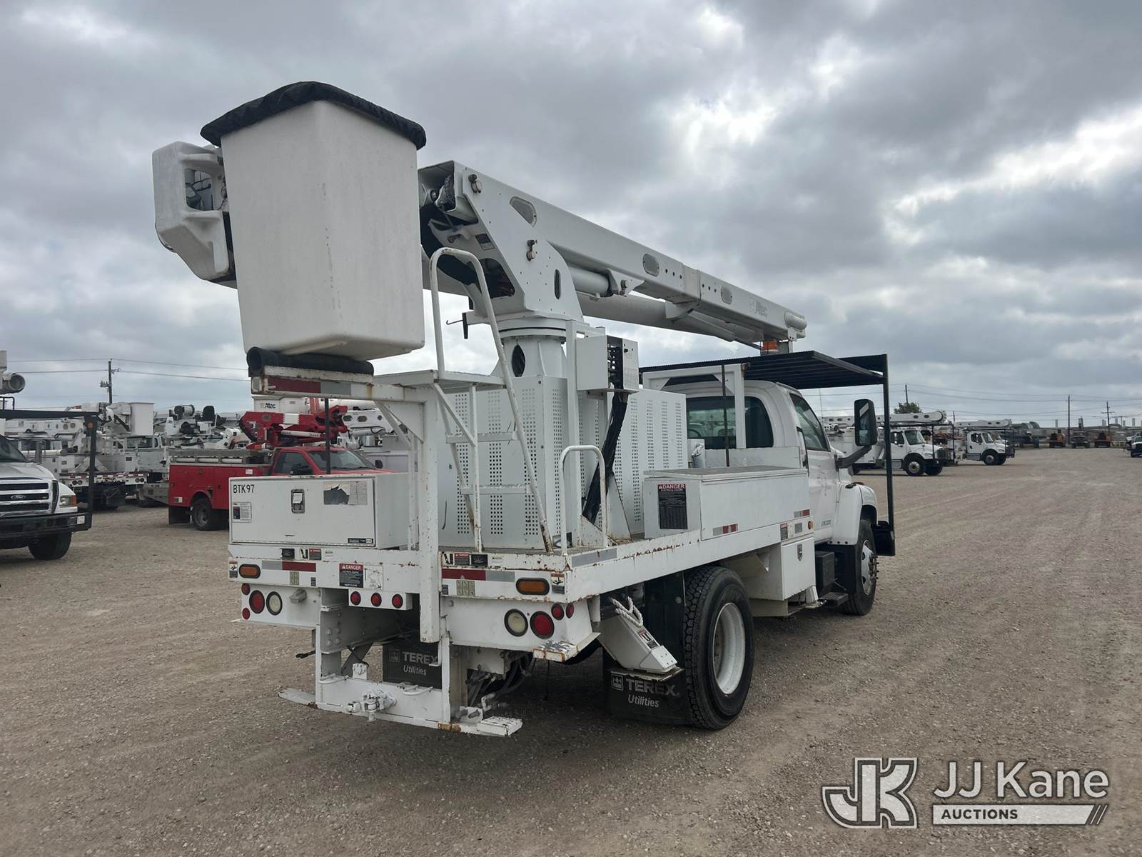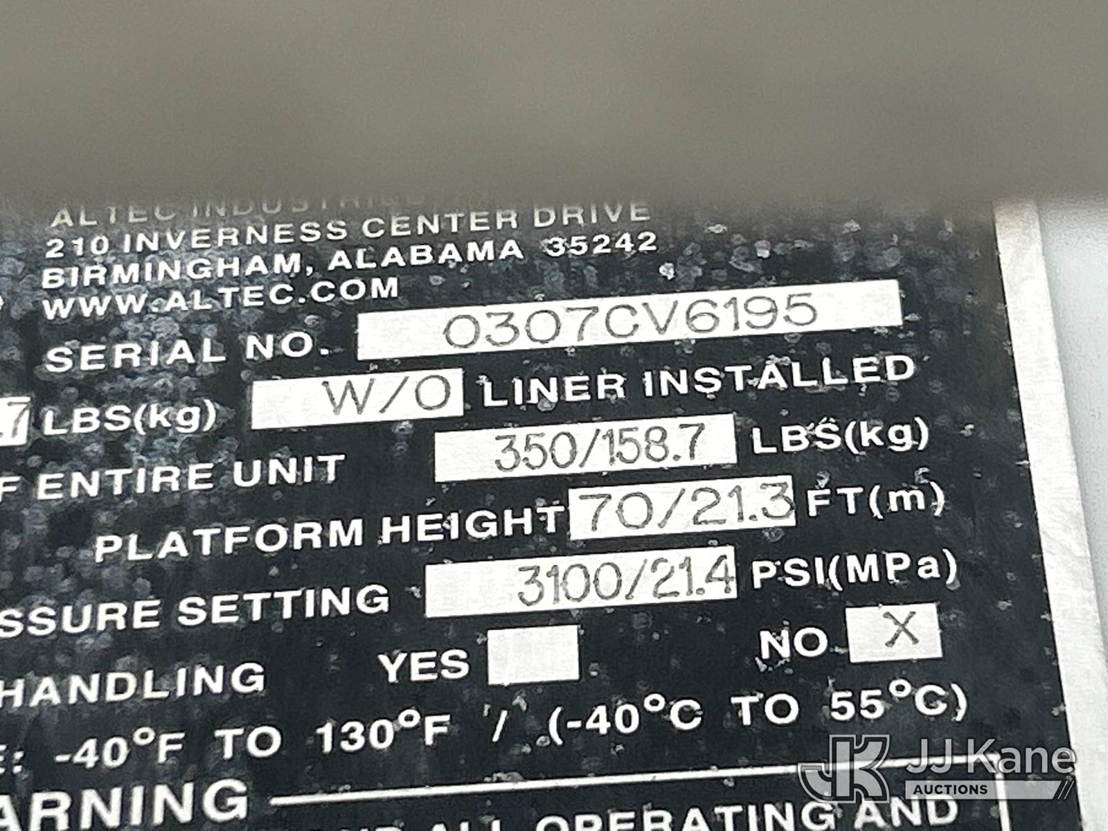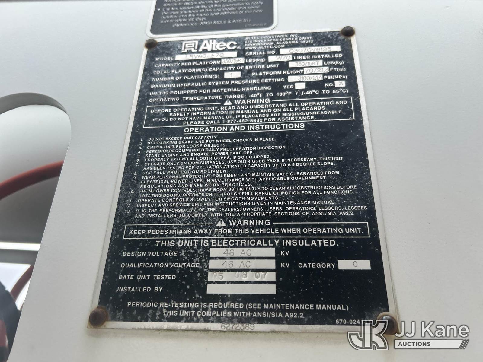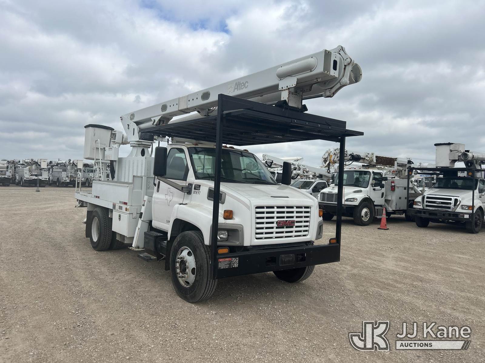 Altec LRV-60E70, 75 ft, Over-Center Elevator Bucket Truck s/n 0307CV6195, with Single-Man Bucket, 4 hydraulic outriggers, rear mounted on 2006 GMC C7C042 Flatbed/Service Truck, 7.2L L6 TURBO DIESEL 4X2, manual, A/C, (Exempt from Odometer Disclosure - Reads 122,009 miles) (Runs, Moves & Upper Condition Unknown) (Outriggers Condition Unknown, PTO Grinds, Jump To Start) This is a Titled Item NOTE: This unit is being sold AS IS/WHERE IS via Timed Auction and is located in Waxahachie, TX. Inspection & preview days for this unit are the 2 business days prior to the first day of items closing for this auction, item is located at 999 Solon Rd Waxahachie, TX 75165 and hours of operations are 8a-4p. For pre-sale questions, please contact Alex Bayless @ (469) 550-4938. (Missing manuals, See Auction Company for Manufacturers Information to obtain manuals) (Buyer is responsible for removal. Assistance by consignor or JJ Kane Auctions is not assured.)