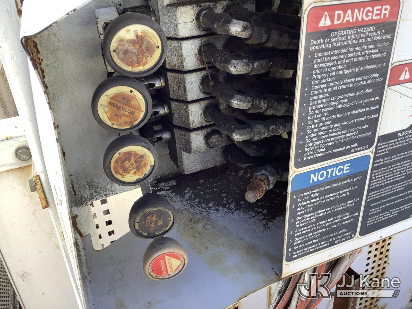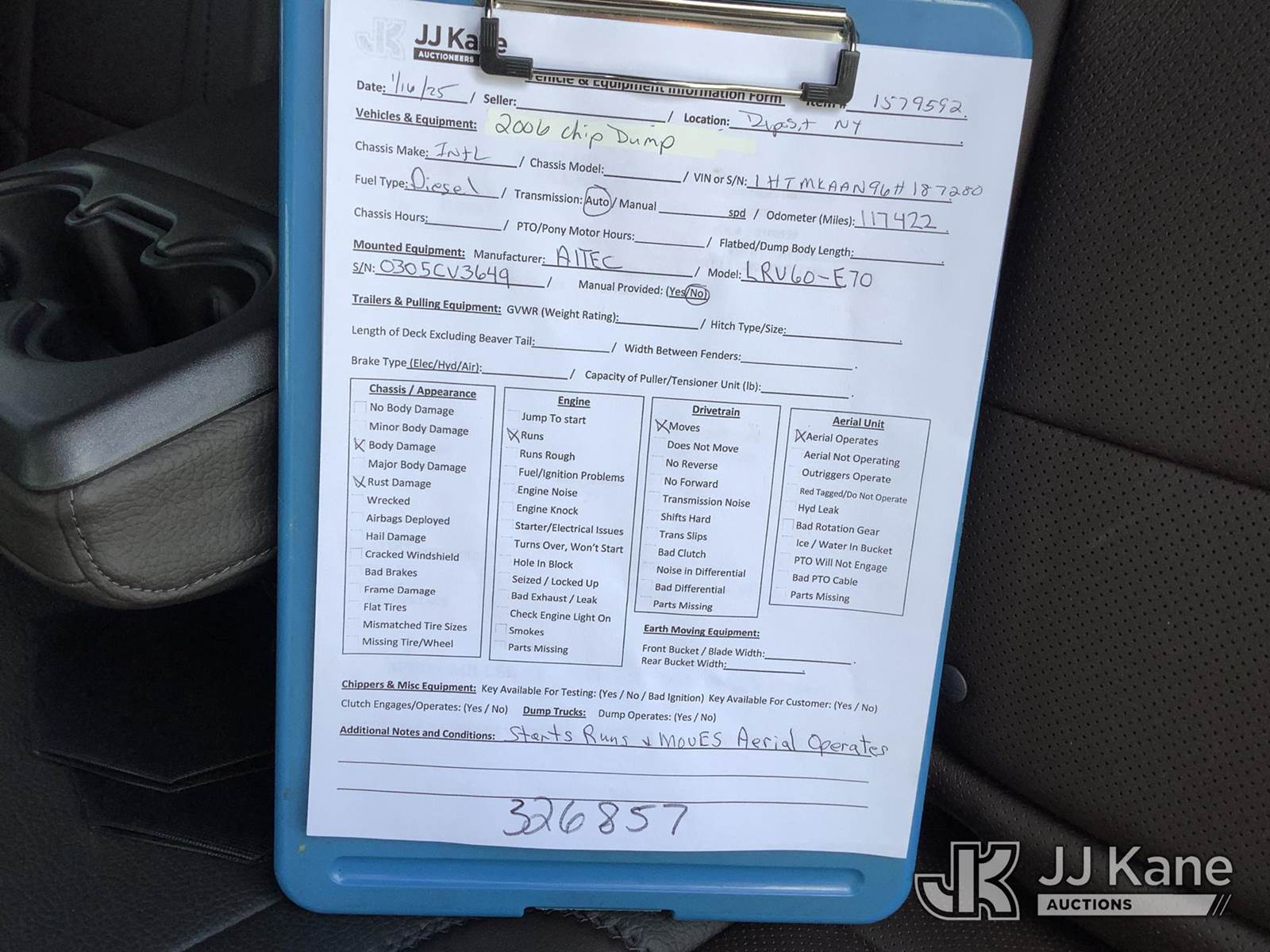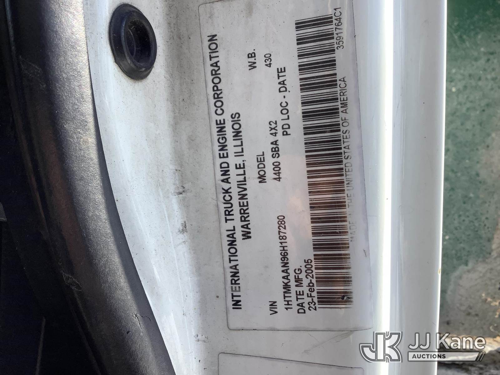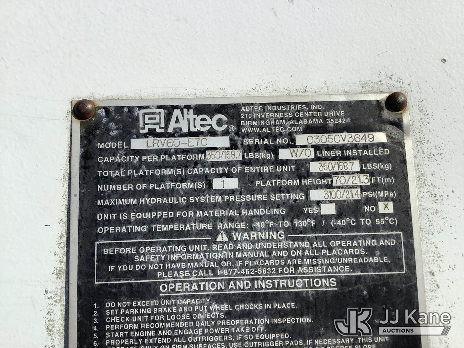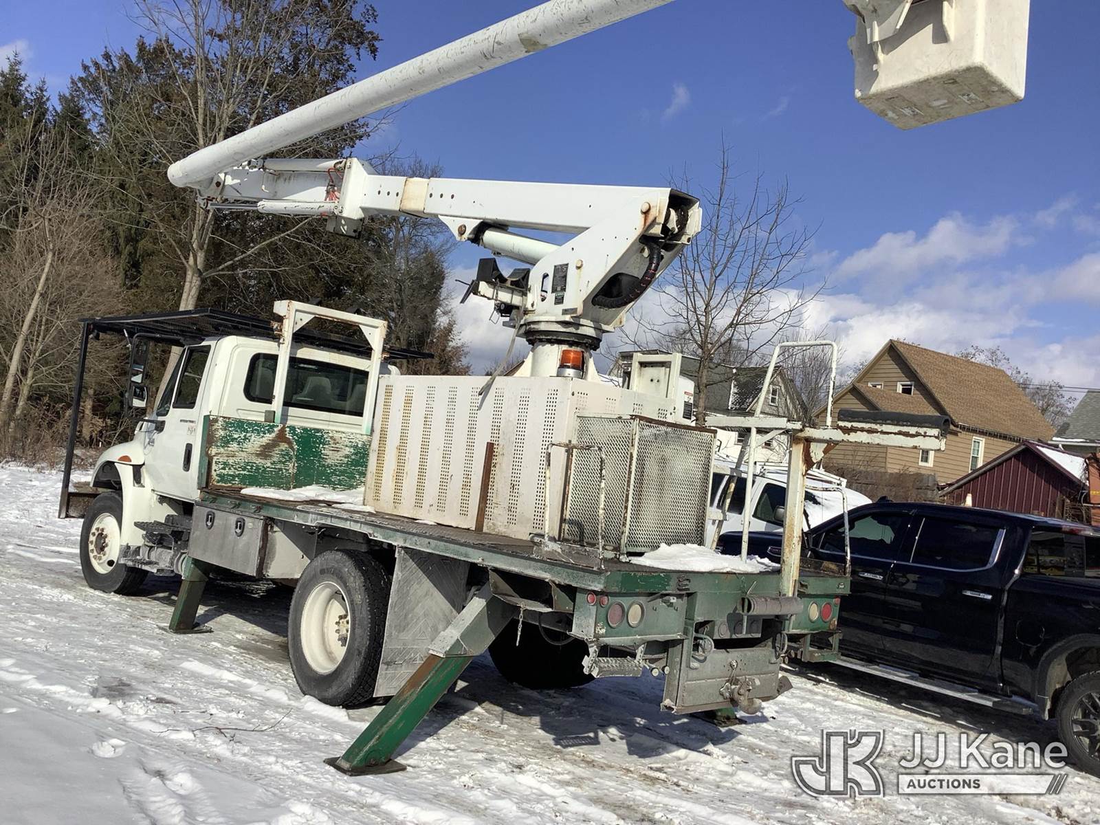 Altec LRV60-E70, 75 ft, Over-Center Elevator Bucket Truck s/n 0305CV3649, with single-man bucket & 4 hyd outriggers, rear mounted on 2006 International 4400 Flatbed Truck, DT466 diesel, 4X2, Auto, (Exempt from Odometer Disclosure - Reads 117,422 miles) (Runs, Moves & Upper Operates) (Body Damage) This is a Titled Item NOTE: This unit is being sold AS IS/WHERE IS via Timed Auction and is located in Deposit, NY. Inspection & preview days for this unit are by appointment only; please contact us at contact@jjkane.com or 84-Go-JJKane for more details. (Missing manuals, See Auction Company for Manufacturers Information to obtain manuals) (Buyer is responsible for removal. Assistance by consignor or JJ Kane Auctions is not assured.)