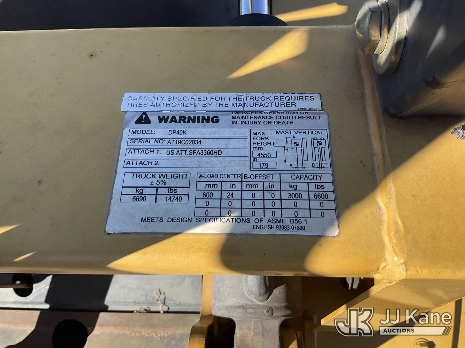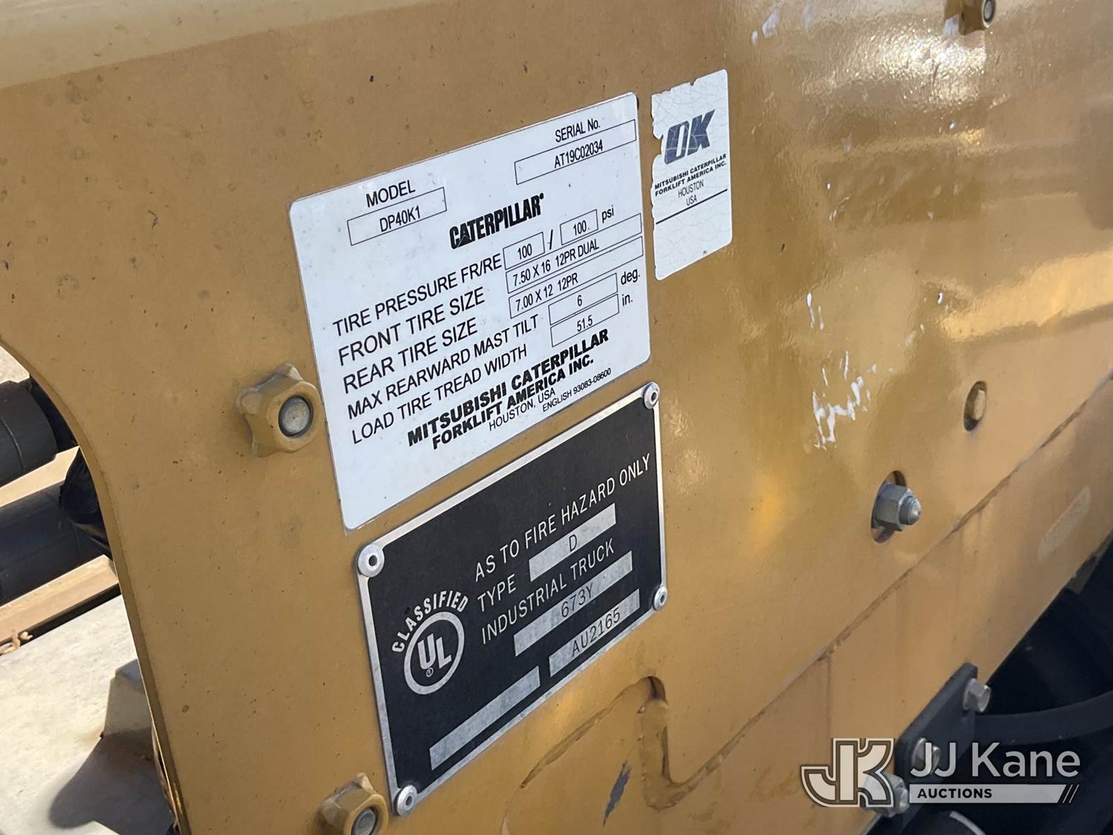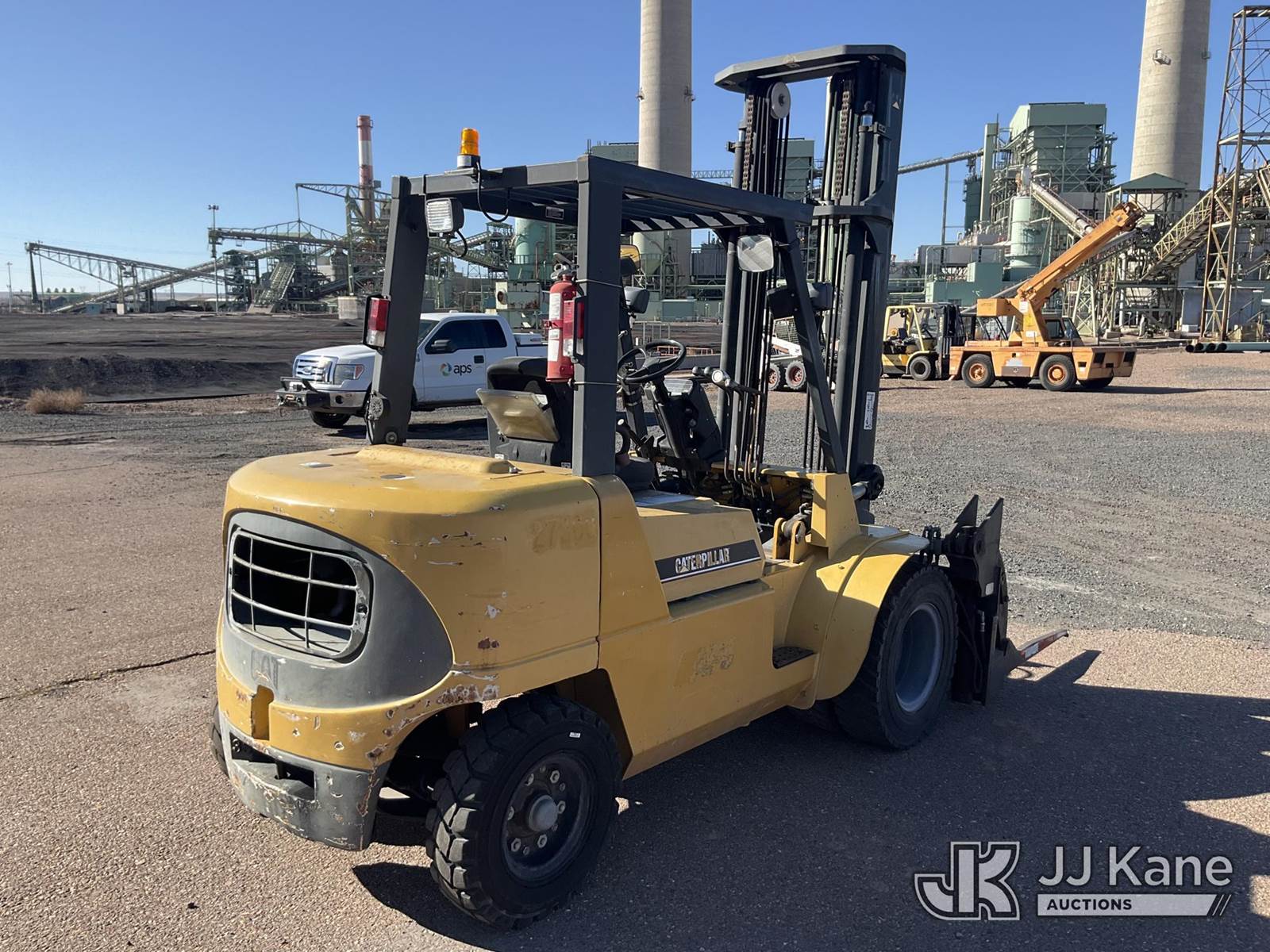 2006 Caterpillar DP40K1 Pneumatic Tired Forklift, s/n AT19C02034, diesel, Shuttle, with 6600 lbs capacity, 179in fork height, (Runs, Moves & Operates) (Reads 2,062 hours) NOTE: This unit is being sold AS IS/WHERE IS via Timed Auction and is located in Joseph City, AZ. For more information & removal arrangements please contact Carson Wenner @ (480) 617-3620. (Buyer is responsible for removal. Assistance by consignor or JJ Kane Auctions is not assured.)