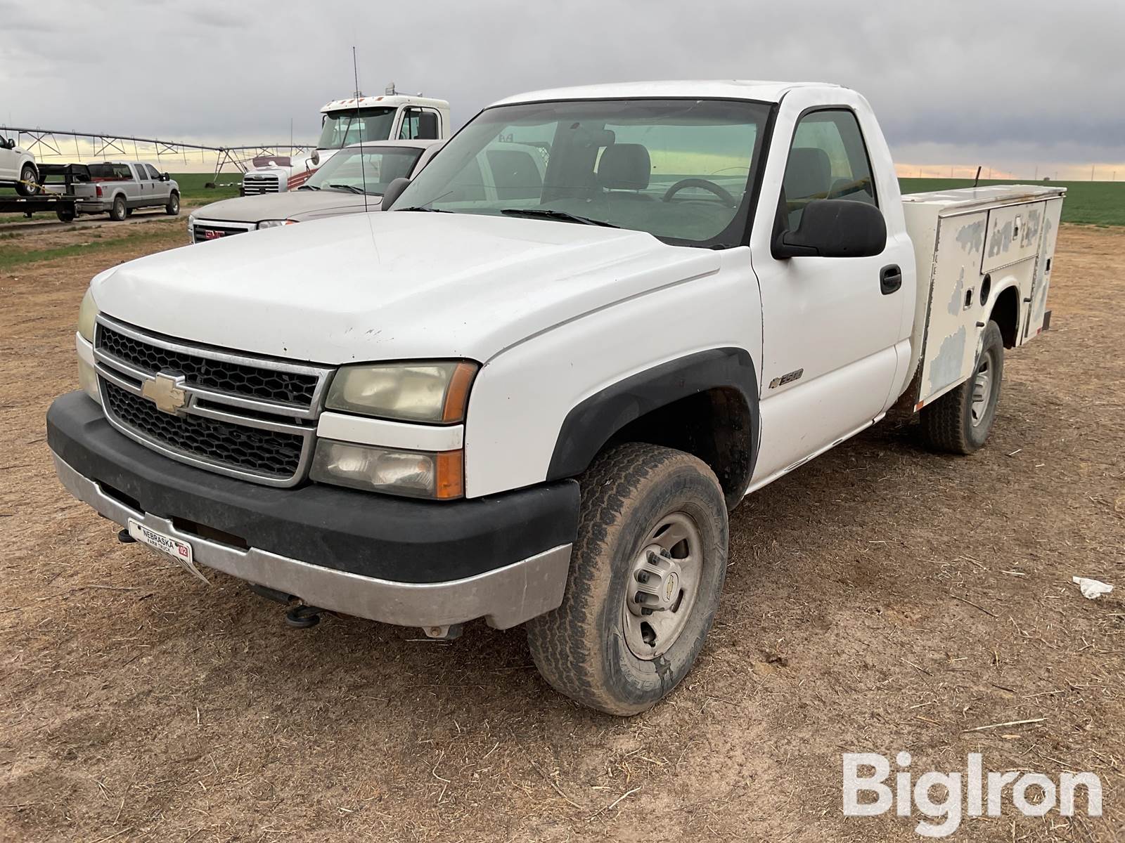 2006 Chevrolet 3500 4WD Pickup, 288,046 miles showing, Title Will Be Marked Miles Exempt, GM 6.0L V-8 Gas Engine, Automatic Transmission, Manual 4WD Shift, 265/75R16 Tires, Knapheide Service Body, Receiver Hitch, Step Bumper, Engine Powered Air Compressor (See Video), 40/20/40 Seat, Heater, Air Conditioning, Radio, Note: Windshield Is Cracked, Dent In Upper Left Cab Corner, VIN: 1GBHK34U36E280993