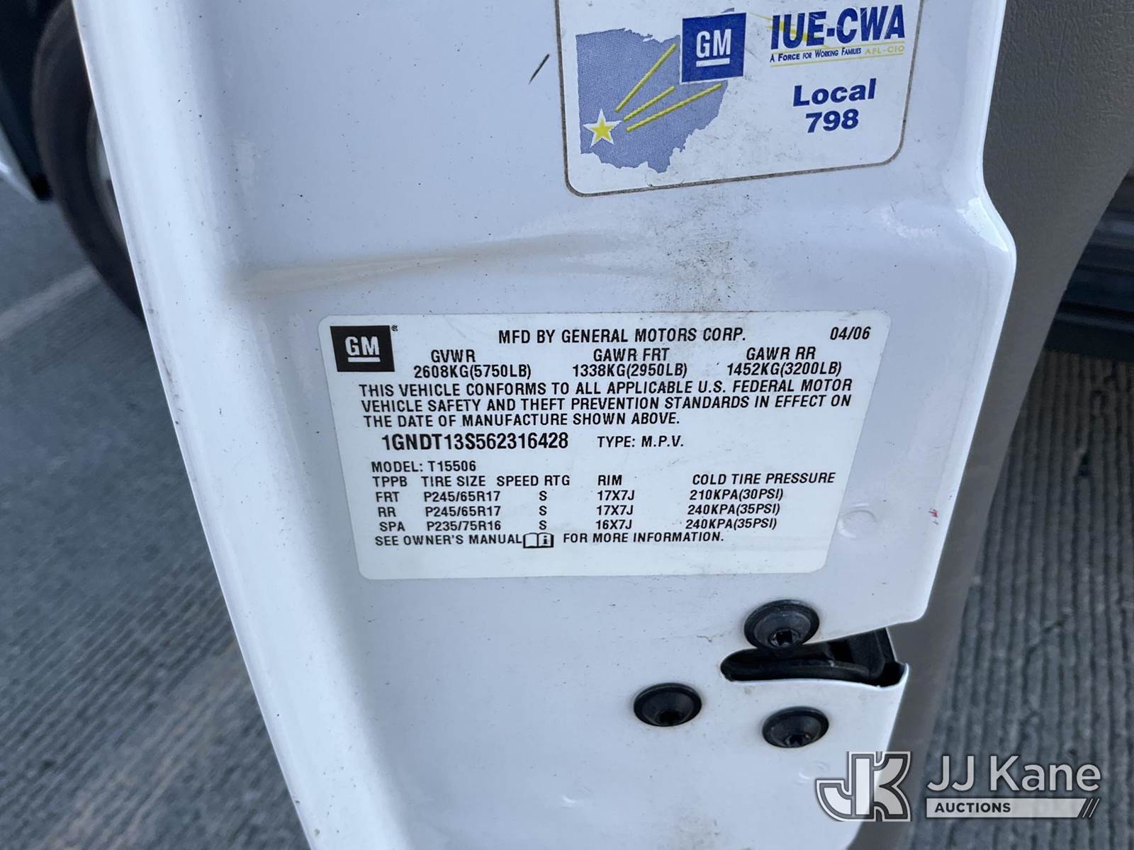 2006 Chevrolet TrailBlazer 4-Door Sport Utility Vehicle, s/n 1GNDT13S562316428, 4.2L L6 DOHC 24V 4WD, GAS, 4-Speed Automatic, A/C, with Tow package, (Exempt from Odometer Disclosure - Reads 59,540 miles) (Runs & Moves) This is a Titled Item NOTE: This unit is being sold AS IS/WHERE IS via Timed Auction and is located in Dixon, CA. Inspection & preview days for this unit are the 2 business days prior to the first day of items closing for this auction, item is located at 8668 Sparling Ln Dixon, CA 95620 and hours of operations are 8a-4p. For pre-sale questions, please contact JJ Kane Staff at (707) 678-8060 (dixon@jjkane.com). Dealer License Number 45696. (Buyer is responsible for removal. Assistance by consignor or JJ Kane Auctions is not assured.)
