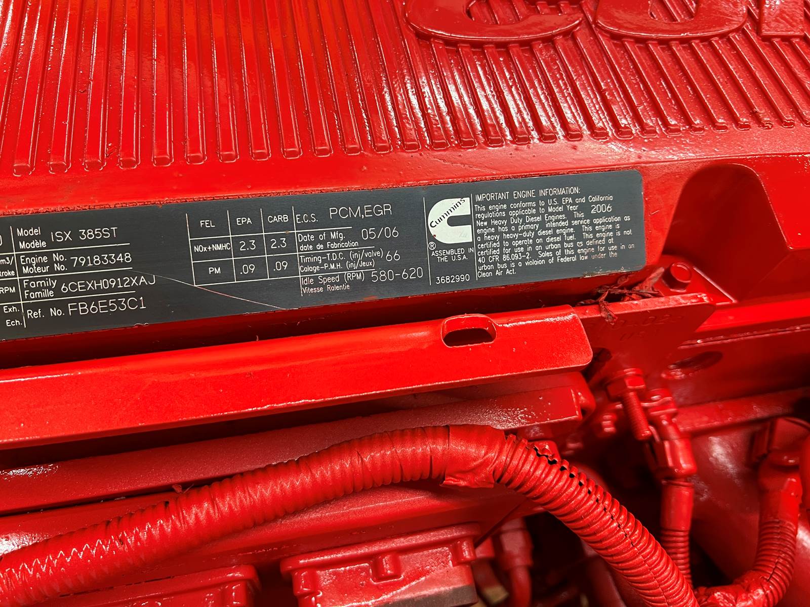 (GOOD USED & TEST RUN & INTERNALLY INSPECTED) 2006 Cummins ISX Diesel Engine For Sale, CPL# 8520, (EPA04) Family# 6CEXH0912XAJ, 385HP @ 2000RPM, MAX 450HP, Fits 2004 2005 2006, ENGINE SERIAL# 79183348, CM870, 15.0L, 6 Cylinders, Stock# 9568 ***ECM SOLD SEPARATELY***