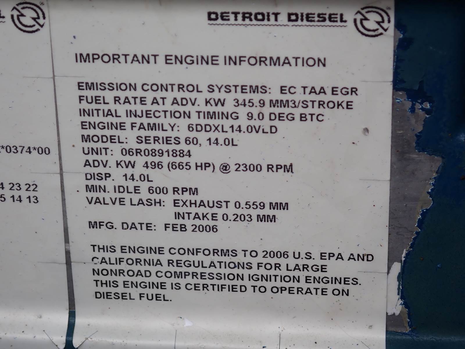 2006 Detroit Diesel Series 60 engine, 14 liter displacement, 665 HP tag rating, DDEC V ECM, model 6063HV39 industrial spec, NO EGR, complete power unit w/ skid, cooling package & accessories as pictured. TEST RAN EXCELLENT, NO SMOKE OR BLOWBY OBSERVED. 55 PSI OIL PRESSURE DURING COLD TEST RUN AT IDLE. ENGINE HAS JUST 2321 TOTAL HOURS ON ECM W/ 799 IDLE -- ALMOST NO WORK TIME ON THIS UNIT !! GOOD RUNNER -- SEE VIDEO. VERY HARD TO FIND HIGH HORSEPOWER INDUSTRIAL UNIT HERE -- DON'T MISS IT !!