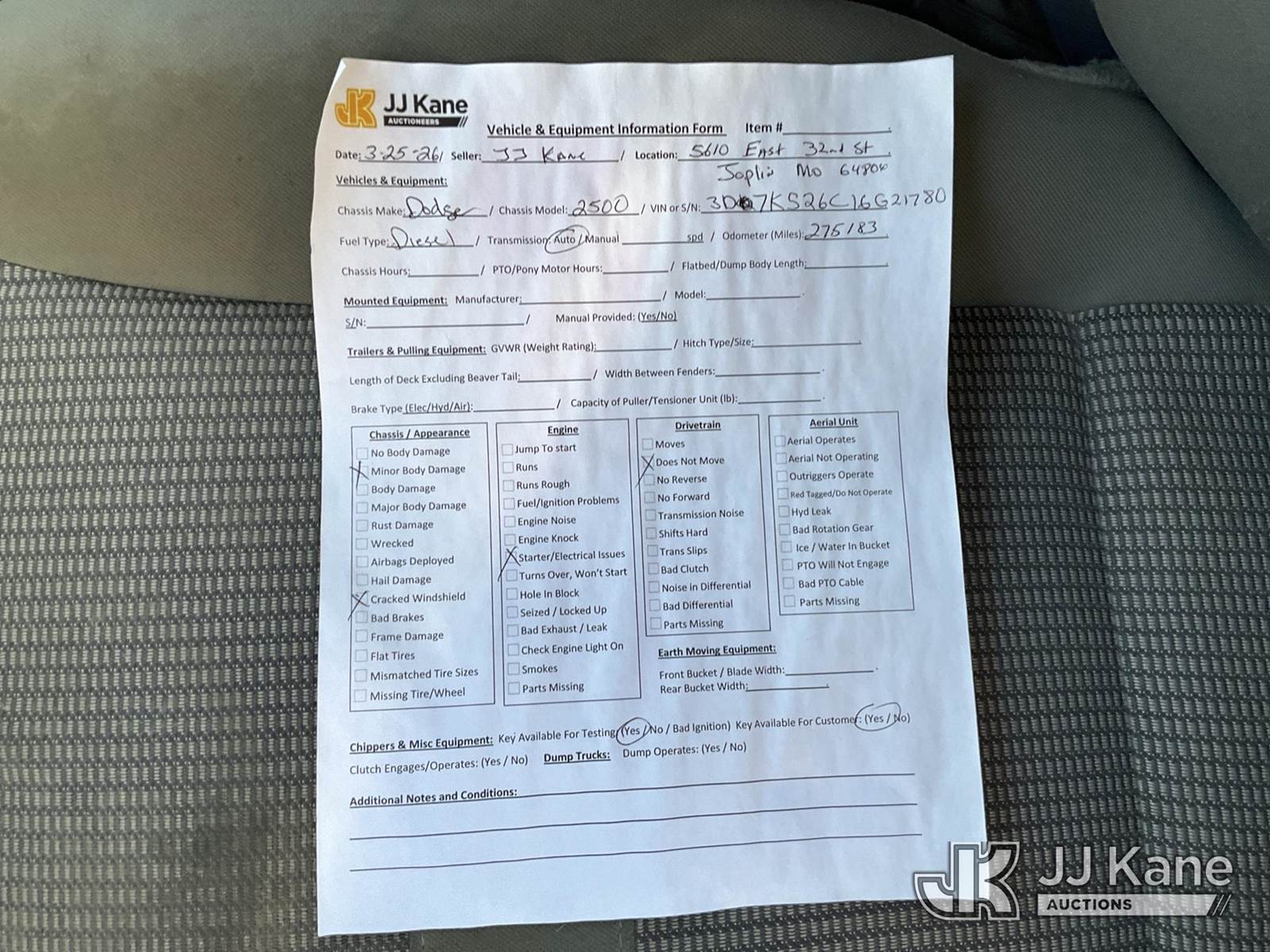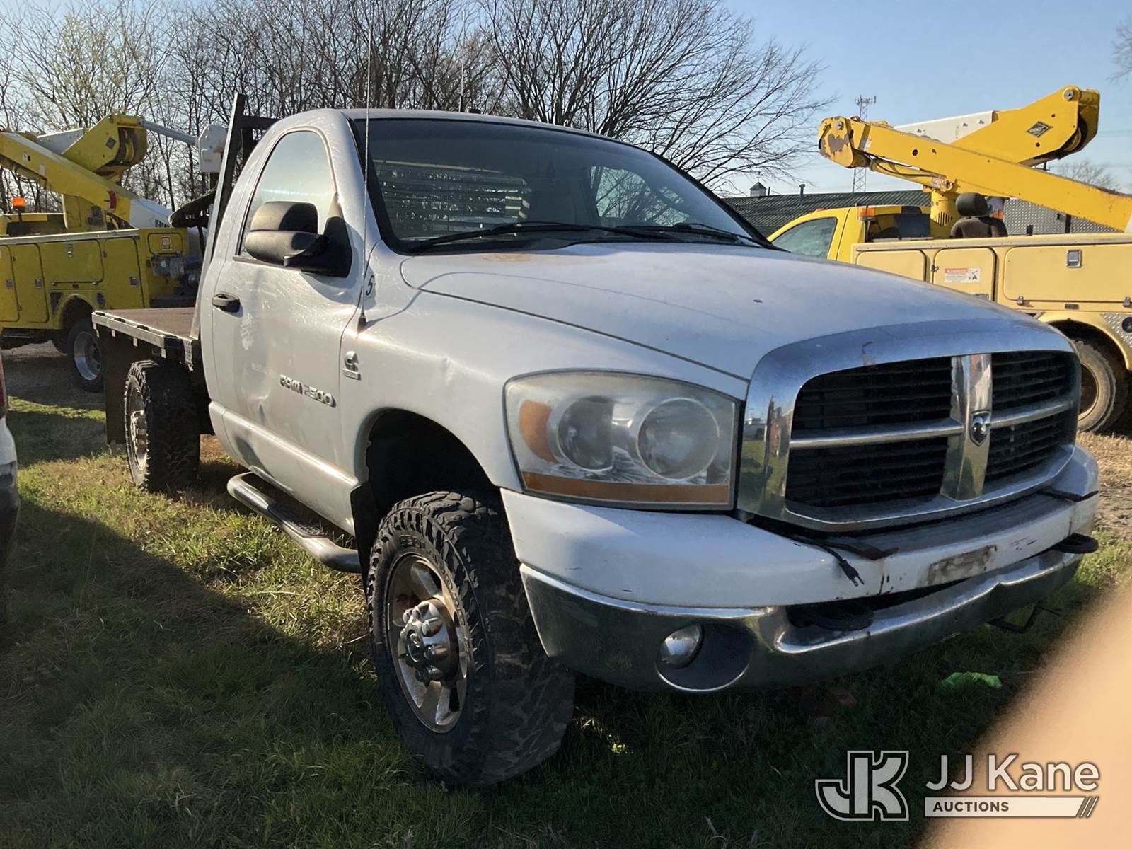 2006 Dodge Ram 2500 Flatbed Truck, 5.9L diesel, 4wd, Auto, A/C, (Exempt from Odometer Disclosure - Reads 275,183 miles) (Not Running, Condition Unknown, Check Engine Light On, Has Starter/Electrical Issues, Cracked Windshield, Minor Body Damage) This is a Titled Item NOTE: This unit is being sold AS IS/WHERE IS via Timed Auction and is located in Joplin, MO. Inspection & preview days for this unit are by appointment only; please contact us at contact@jjkane.com or 84-Go-JJKane for more details. (Buyer is responsible for removal. Assistance by consignor or JJ Kane Auctions is not assured.)