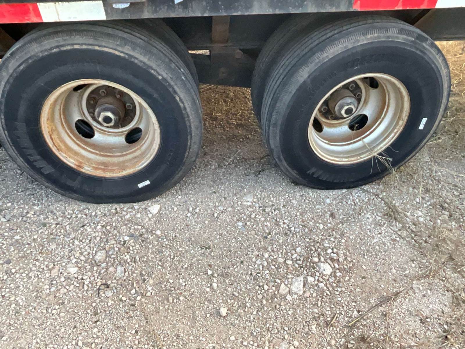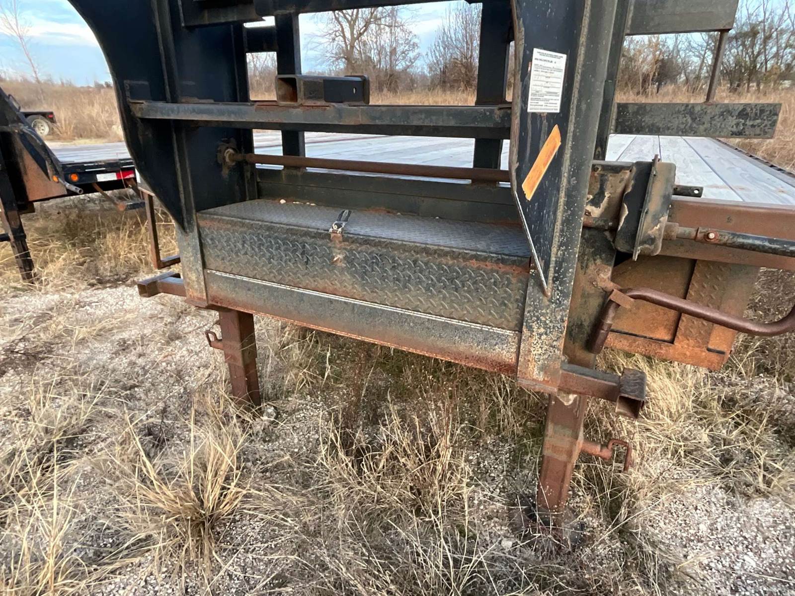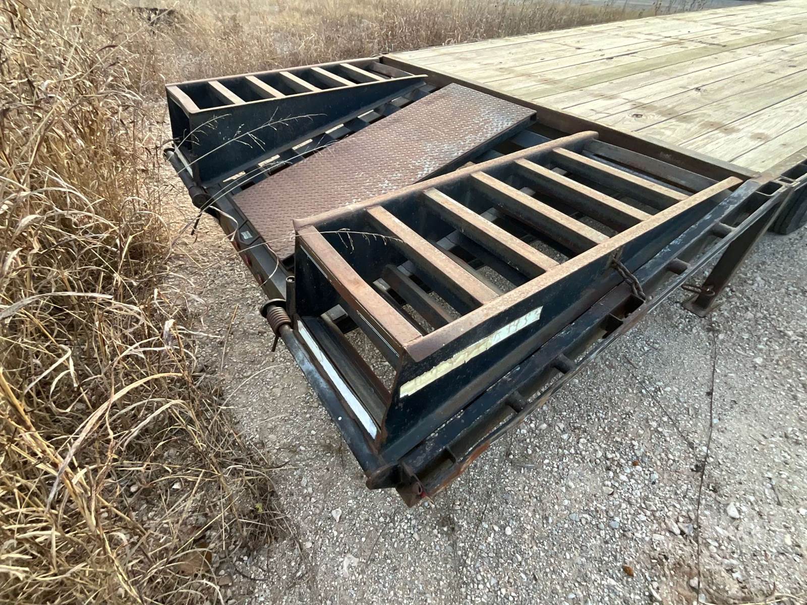 30' FLATBED TRAILER, 8' WIDE, 2 AXLE, SPREAD AXLE, SPRING SUSPENSION, WOOD DECKING, GOOSENECK HITCH, DOVETAIL WITH RAMPS, TOOL BOX, 23900...