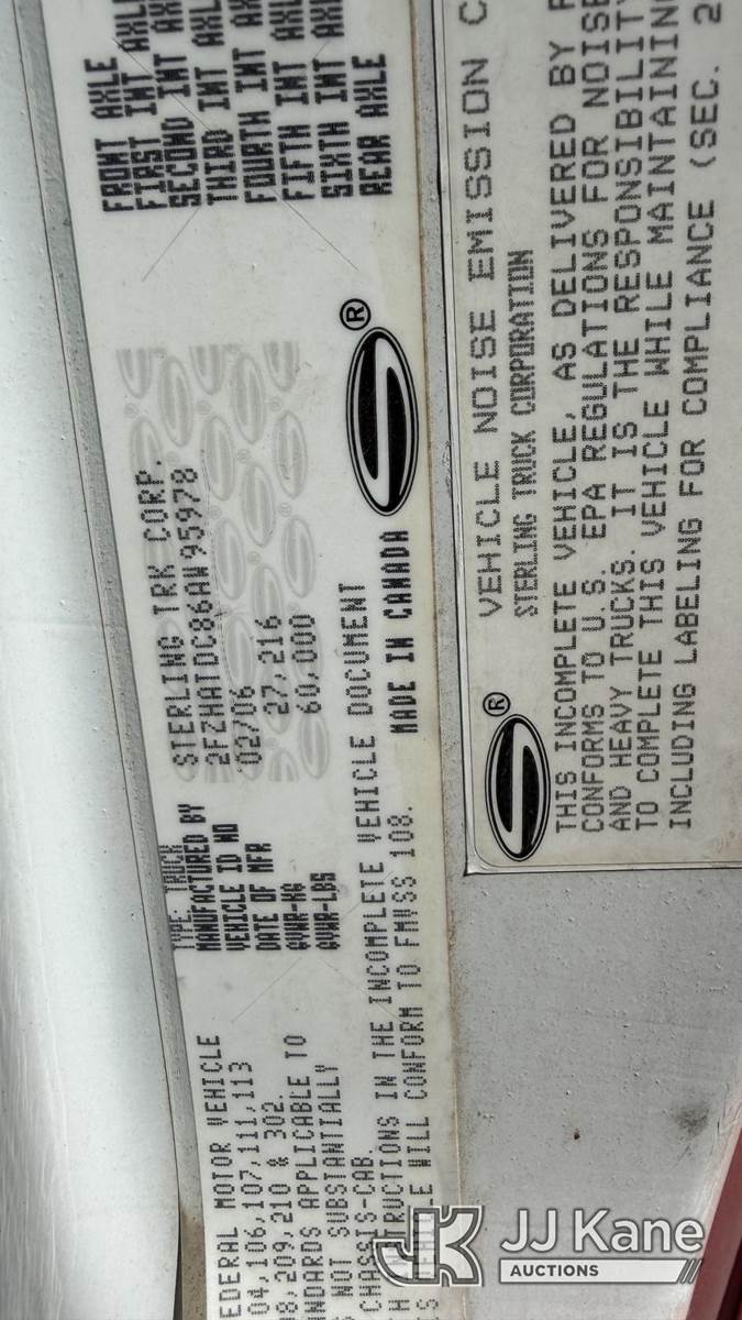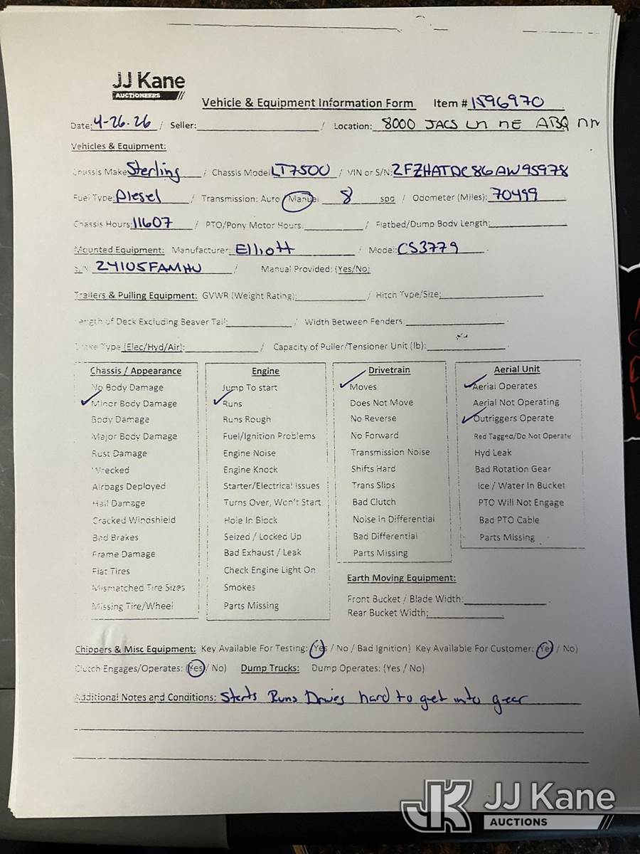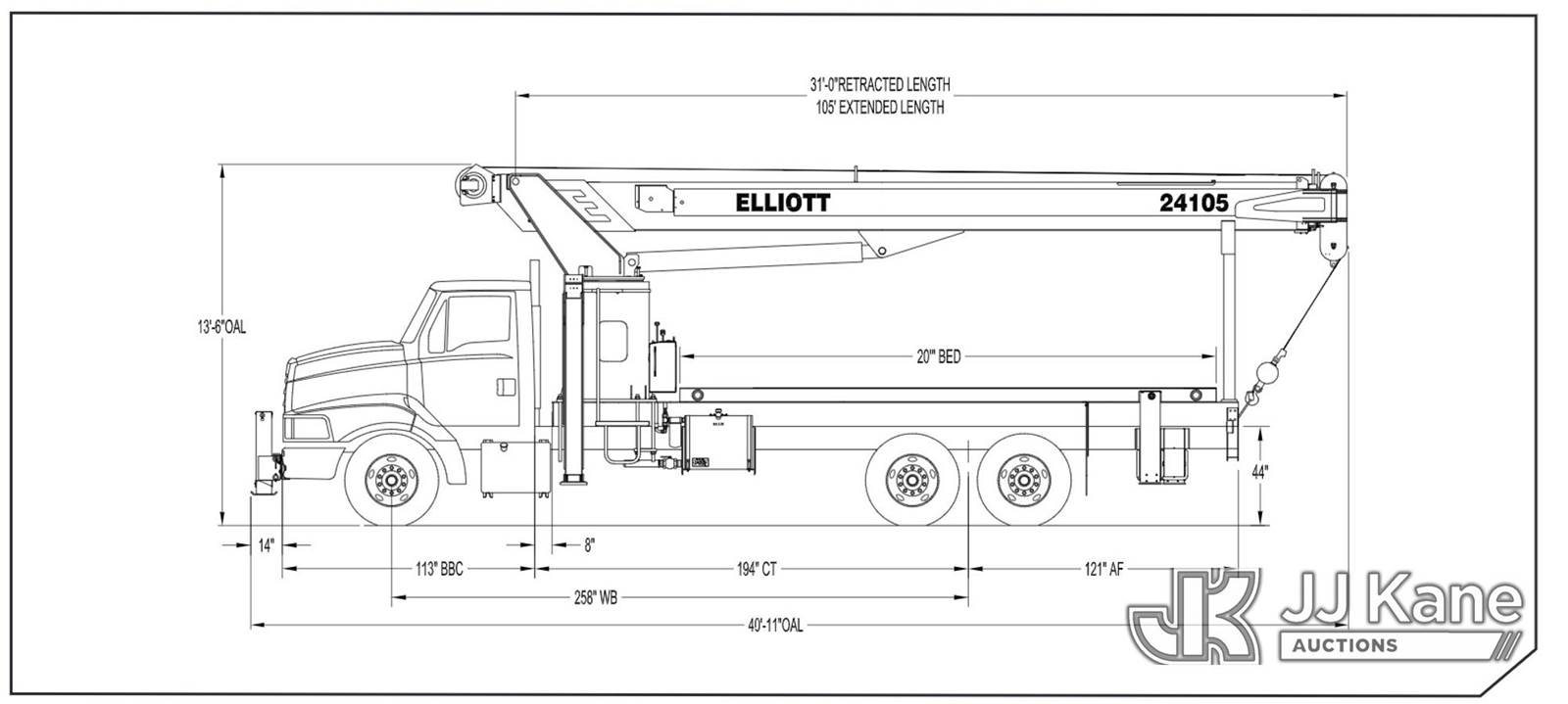 Elliott 24105FAMHU, 24-Ton Hydraulic Truck Crane s/n CS3779, with 114ft sheave height, 4 section hyd boom, 26ft stowable swing-away jib, headache ball, heel winch, LMI with display and hydraulic function lockout for load capacities, control console is equipped with anti-two-block system, 5 hydralic outriggers, mounted behind cab on 2006 Sterling LT7500 T/A Flatbed/Utility Truck, 7.2L 6X4, DIESEL, 8-spd w/ Lo-Lo, A/C, (Exempt from Odometer Disclosure - Reads 70,499 miles) ((Runs, Moves & Upper Operates) (Hard To Get Into Gear)) (Reads 11,607 hours) This is a Titled Item NOTE: This unit is being sold AS IS/WHERE IS via Timed Auction and is located in Albuquerque, NM. Inspection & preview days for this unit are by appointment only; please contact us at contact@jjkane.com or 84-Go-JJKane for more details. (Missing manuals, See Auction Company for Manufacturers Information to obtain manuals) (Buyer is responsible for removal. Assistance by consignor or JJ Kane Auctions is not assured.)
