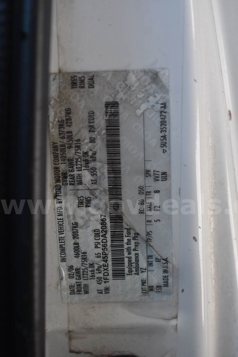 2006 Ford Econoline CUTAWAY, 6.0L V8 OHV 32V TURBO DIESEL. This vehicle starts, runs, and drives. Fuel Type: Diesel No engine repairs needed. This vehicle was maintained every 3,000 miles. Removed from Service: 9/20/2025 Maintenance records are available. Transmission: Automatic, operable No transmission repairs needed. Drivetrain: 2WD Exterior Color: White/yellow Exterior has minor dents and scratches. Tire Condition: Good Tread: 75% Decals have been removed and impressions remain. No emergency equipment. Interior: Grey cloth No damage to seats, dash, or floor. AM/FM radio AC blows cold. Airbags: Dual Cruise Control, Remote Mirrors, Climate Control Power: Steering, Windows, and Door Locks Additional Equipment: Medtec ambulance body Bulletproof Diesel 60V FICM Upgrade ARP head studs EGR / EGR Cooler delete BulletProof Diesel Oil Cooler Bully Dog GT Tuner Blue Spring upgrade (increased Fuel P.) Bluetooth Radio Backup Camera Sold as is, where is.